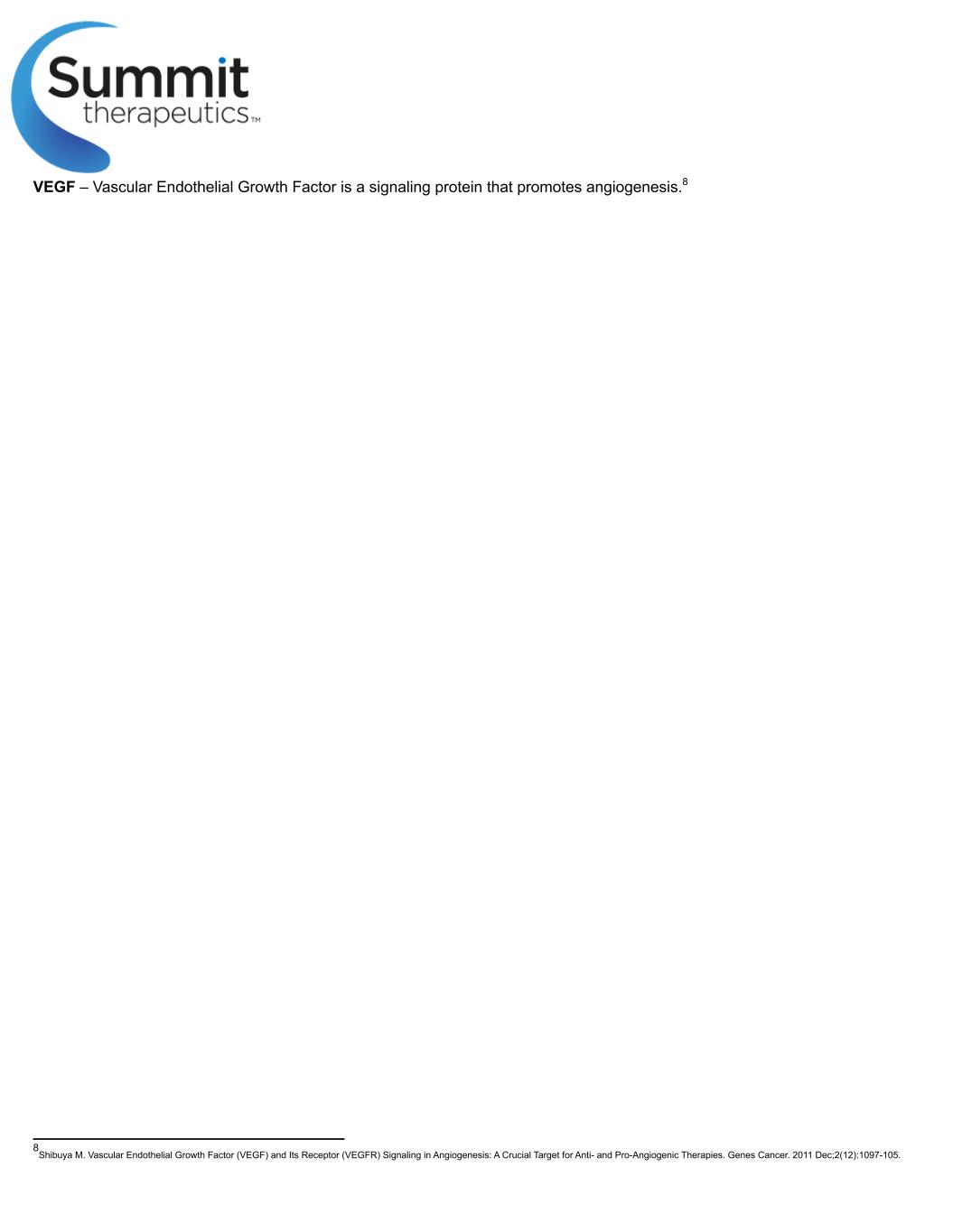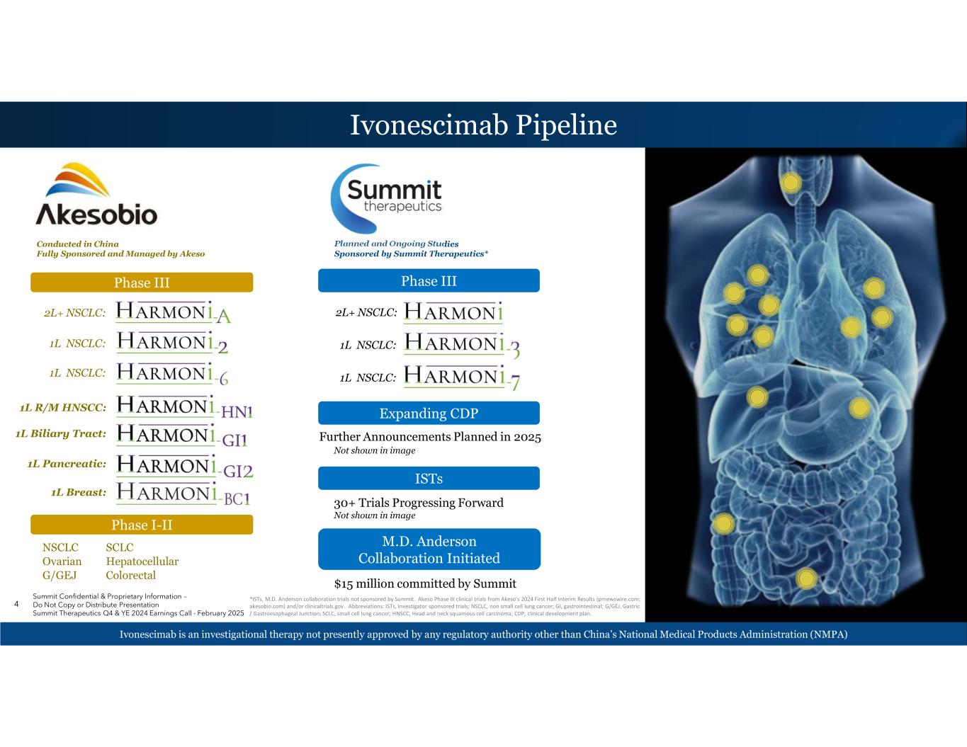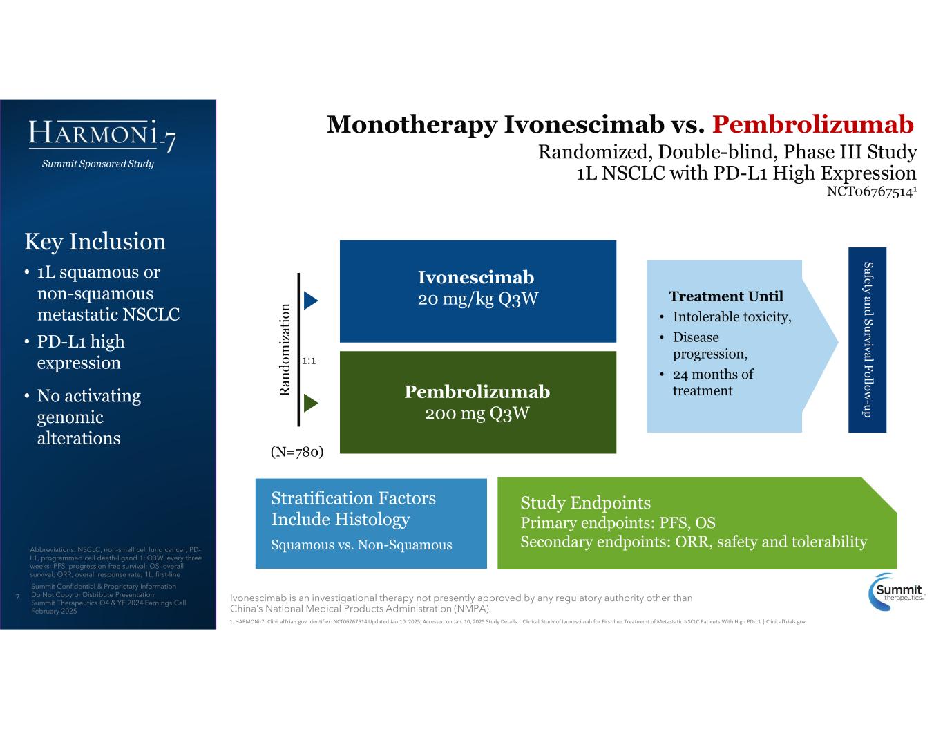 Use of Non-GAAP Financial Measures This release includes measures that are not in accordance with U.S. generally accepted accounting principles (“Non-GAAP measures”). These Non-GAAP measures should be viewed in addition to, and not as a substitute for, Summit's reported GAAP results, and may be different from Non-GAAP measures used by other companies. In addition, these Non-GAAP measures are not based on any comprehensive set of accounting rules or principles. Summit management uses these non-GAAP measures for internal budgeting and forecasting purposes and to evaluate Summit’s financial performance. Summit management believes the presentation of these Non-GAAP measures is useful to investors for comparing prior periods and analyzing ongoing business trends and operating results. For further information regarding these Non-GAAP measures, please refer to the tables presenting reconciliations of our Non-GAAP results to our U.S. GAAP results and the “Notes on our Non- GAAP Financial Information” that accompany this press release. Fourth Quarter 2024 Earnings Call Summit will host an earnings call this morning, Monday, February 24, 2025, at 9:00am ET. The conference call will be accessible by dialing (800) 715-9871 (toll-free domestic) or (646) 307-1963 (international) using conference code 3934052. A live webcast and instructions for joining the call are accessible through Summit’s website www.smmttx.com. An archived edition of the webcast will be available on our website after the call. About Ivonescimab Ivonescimab, known as SMT112 in Summit’s license territories, North America, South America, Europe, the Middle East, Africa, and Japan, and as AK112 in China and Australia, is a novel, potential first-in-class investigational bispecific antibody combining the effects of immunotherapy via a blockade of PD-1 with the anti- angiogenesis effects associated with blocking VEGF into a single molecule. Ivonescimab displays unique cooperative binding to each of its intended targets with multifold higher affinity when in the presence of both PD-1 and VEGF. This could differentiate ivonescimab as there is potentially higher expression (presence) of both PD-1 and VEGF in tumor tissue and the tumor microenvironment (TME) as compared to normal tissue in the body. Ivonescimab’s tetravalent structure (four binding sites) enables higher avidity (accumulated strength of multiple binding interactions) in the TME (Zhong, et al, SITC, 2023). This tetravalent structure, the intentional novel design of the molecule, and bringing these two targets into a single bispecific antibody with cooperative binding qualities have the potential to direct ivonescimab to the tumor tissue versus healthy tissue. The intent of this design, together with a half-life of 6 to 7 days (Zhong, et al, SITC, 2023), is to improve upon previously established efficacy thresholds, in addition to side effects and safety profiles associated with these targets. Ivonescimab was engineered by Akeso Inc. (HKEX Code: 9926.HK) and is currently engaged in multiple Phase III clinical trials. Over 2,300 patients have been treated with ivonescimab in clinical studies globally. Summit has begun its clinical development of ivonescimab in non-small cell lung cancer (NSCLC), commencing enrollment in 2023 in two multi-regional Phase III clinical trials, HARMONi and HARMONi-3, and the Company has begun to activate clinical trial sites in the United States for HARMONi-7. HARMONi is a Phase III clinical trial which intends to evaluate ivonescimab combined with chemotherapy compared to placebo plus chemotherapy in patients with EGFR-mutated, locally advanced or metastatic non- squamous NSCLC who have progressed after treatment with a 3rd generation EGFR TKI (e.g., osimertinib). Enrollment in HARMONi was completed in the second-half of 2024, and top-line results are expected to be announced in the middle of this year. HARMONi-3 is a Phase III clinical trial which is designed to evaluate ivonescimab combined with chemotherapycompared to pembrolizumab combined with chemotherapy in patients with first-line metastatic NSCLC.
