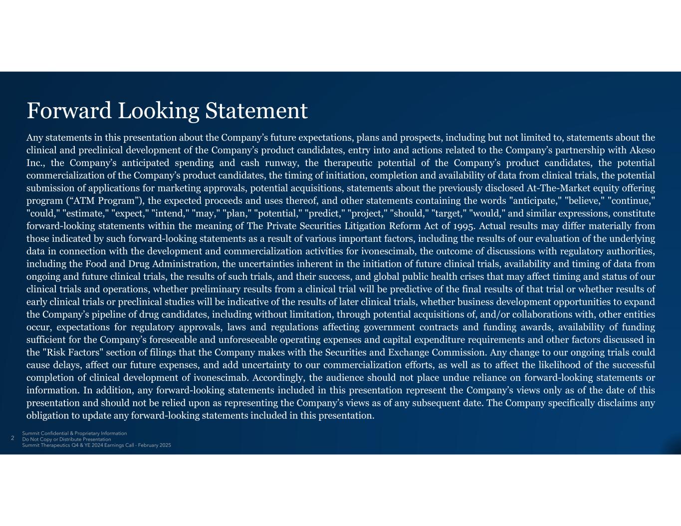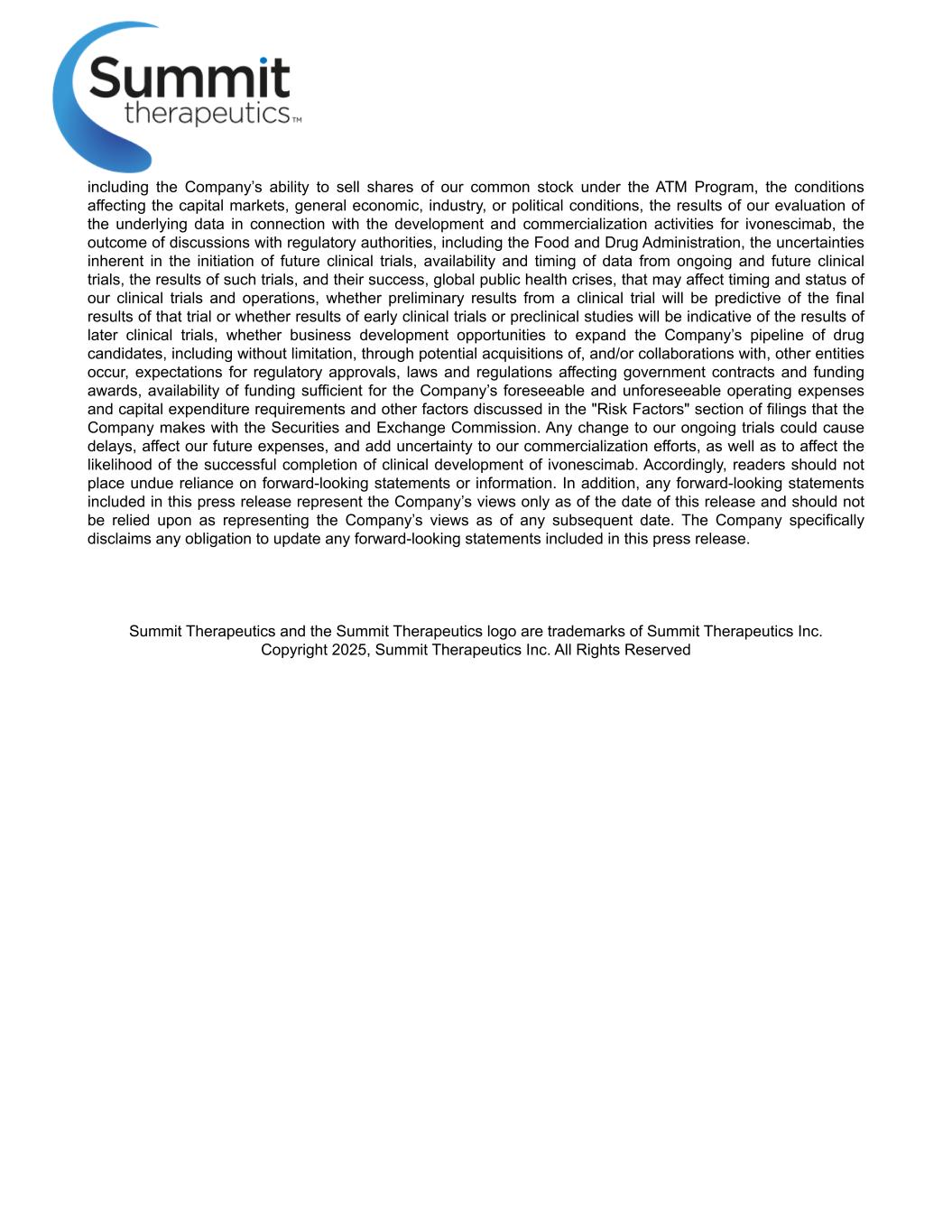 including the Company’s ability to sell shares of our common stock under the ATM Program, the conditions affecting the capital markets, general economic, industry, or political conditions, the results of our evaluation of the underlying data in connection with the development and commercialization activities for ivonescimab, the outcome of discussions with regulatory authorities, including the Food and Drug Administration, the uncertainties inherent in the initiation of future clinical trials, availability and timing of data from ongoing and future clinical trials, the results of such trials, and their success, global public health crises, that may affect timing and status of our clinical trials and operations, whether preliminary results from a clinical trial will be predictive of the final results of that trial or whether results of early clinical trials or preclinical studies will be indicative of the results of later clinical trials, whether business development opportunities to expand the Company’s pipeline of drug candidates, including without limitation, through potential acquisitions of, and/or collaborations with, other entities occur, expectations for regulatory approvals, laws and regulations affecting government contracts and funding awards, availability of funding sufficient for the Company’s foreseeable and unforeseeable operating expenses and capital expenditure requirements and other factors discussed in the "Risk Factors" section of filings that the Company makes with the Securities and Exchange Commission. Any change to our ongoing trials could cause delays, affect our future expenses, and add uncertainty to our commercialization efforts, as well as to affect the likelihood of the successful completion of clinical development of ivonescimab. Accordingly, readers should not place undue reliance on forward-looking statements or information. In addition, any forward-looking statements included in this press release represent the Company’s views only as of the date of this release and should not be relied upon as representing the Company’s views as of any subsequent date. The Company specifically disclaims any obligation to update any forward-looking statements included in this press release. Summit Therapeutics and the Summit Therapeutics logo are trademarks of Summit Therapeutics Inc. Copyright 2025, Summit Therapeutics Inc. All Rights Reserved