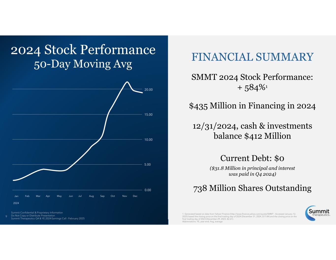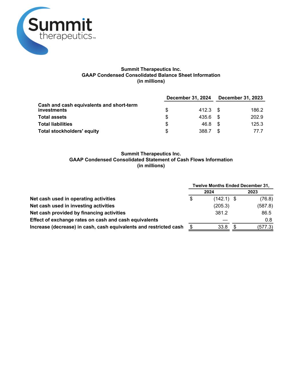 Summit Therapeutics Inc. GAAP Condensed Consolidated Balance Sheet Information (in millions) December 31, 2024 December 31, 2023 Cash and cash equivalents and short-term investments $ 412.3 $ 186.2 Total assets $ 435.6 $ 202.9 Total liabilities $ 46.8 $ 125.3 Total stockholders' equity $ 388.7 $ 77.7 Summit Therapeutics Inc. GAAP Condensed Consolidated Statement of Cash Flows Information (in millions) Twelve Months Ended December 31, 2024 2023 Net cash used in operating activities $ (142.1) $ (76.8) Net cash used in investing activities (205.3) (587.8) Net cash provided by financing activities 381.2 86.5 Effect of exchange rates on cash and cash equivalents — 0.8 Increase (decrease) in cash, cash equivalents and restricted cash $ 33.8 $ (577.3)