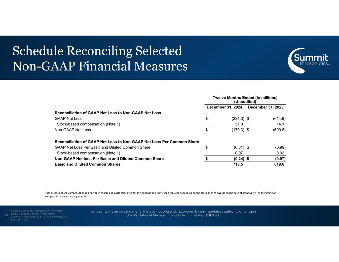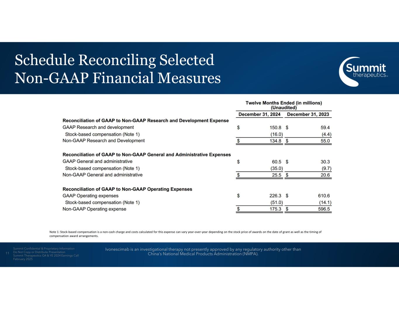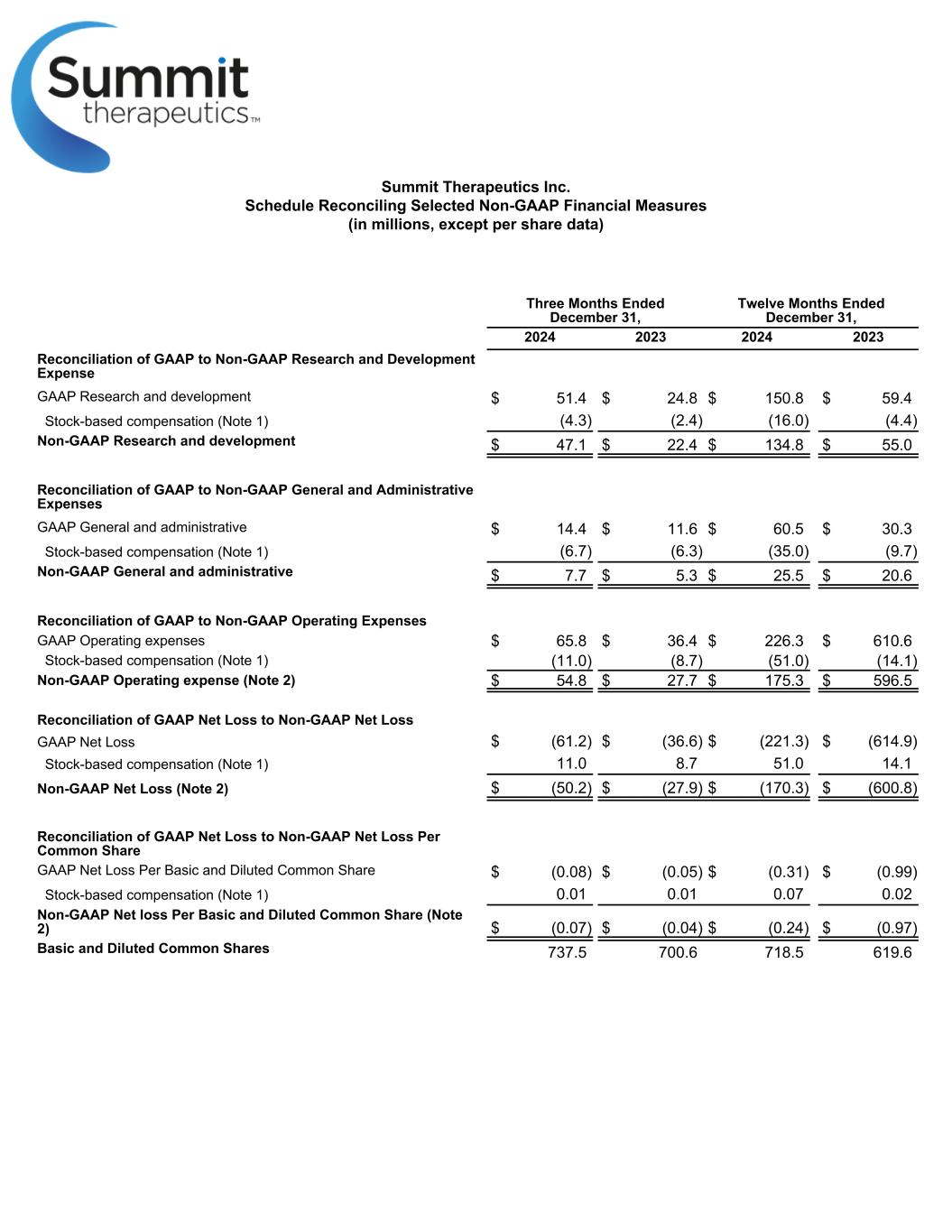 Summit Therapeutics Inc. Schedule Reconciling Selected Non-GAAP Financial Measures (in millions, except per share data) Three Months Ended December 31, Twelve Months Ended December 31, 2024 2023 2024 2023 Reconciliation of GAAP to Non-GAAP Research and Development Expense GAAP Research and development $ 51.4 $ 24.8 $ 150.8 $ 59.4 Stock-based compensation (Note 1) (4.3) (2.4) (16.0) (4.4) Non-GAAP Research and development $ 47.1 $ 22.4 $ 134.8 $ 55.0 Reconciliation of GAAP to Non-GAAP General and Administrative Expenses GAAP General and administrative $ 14.4 $ 11.6 $ 60.5 $ 30.3 Stock-based compensation (Note 1) (6.7) (6.3) (35.0) (9.7) Non-GAAP General and administrative $ 7.7 $ 5.3 $ 25.5 $ 20.6 Reconciliation of GAAP to Non-GAAP Operating Expenses GAAP Operating expenses $ 65.8 $ 36.4 $ 226.3 $ 610.6 Stock-based compensation (Note 1) (11.0) (8.7) (51.0) (14.1) Non-GAAP Operating expense (Note 2) $ 54.8 $ 27.7 $ 175.3 $ 596.5 Reconciliation of GAAP Net Loss to Non-GAAP Net Loss GAAP Net Loss $ (61.2) $ (36.6) $ (221.3) $ (614.9) Stock-based compensation (Note 1) 11.0 8.7 51.0 14.1 Non-GAAP Net Loss (Note 2) $ (50.2) $ (27.9) $ (170.3) $ (600.8) Reconciliation of GAAP Net Loss to Non-GAAP Net Loss Per Common Share GAAP Net Loss Per Basic and Diluted Common Share $ (0.08) $ (0.05) $ (0.31) $ (0.99) Stock-based compensation (Note 1) 0.01 0.01 0.07 0.02 Non-GAAP Net loss Per Basic and Diluted Common Share (Note 2) $ (0.07) $ (0.04) $ (0.24) $ (0.97) Basic and Diluted Common Shares 737.5 700.6 718.5 619.6