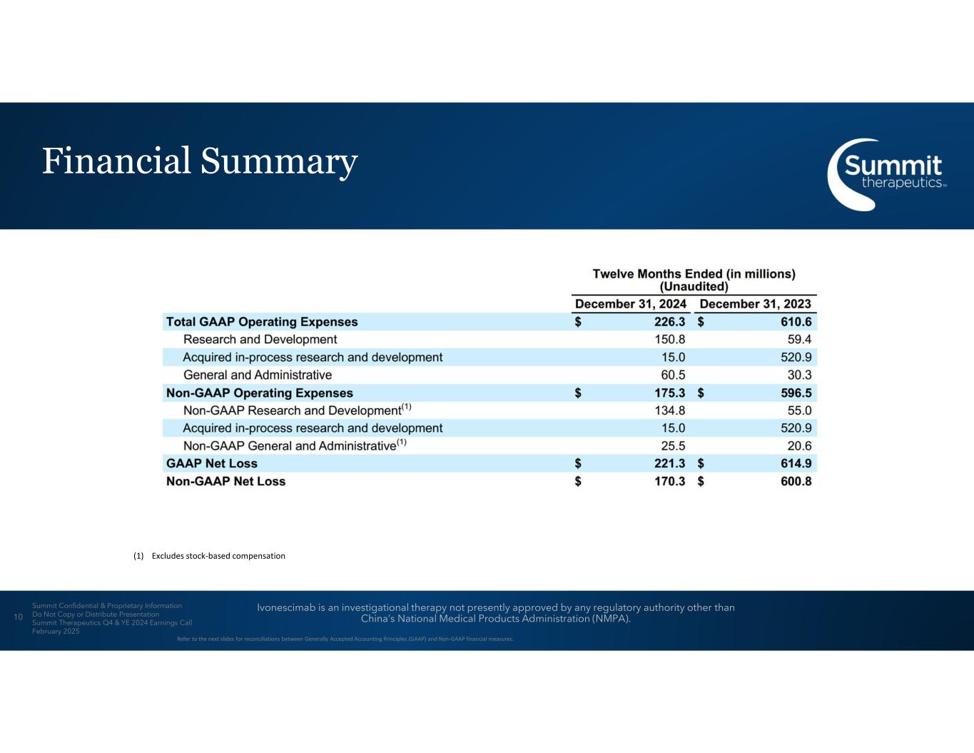 Summit Therapeutics Inc. Schedule Reconciling Selected Non-GAAP Financial Measures (in millions) Three Months Ended December 31, 2024 September 30, 2024 June 30, 2024 March 31, 2024 December 31, 2023 Reconciliation of GAAP to Non-GAAP Operating Expenses GAAP Operating expenses $ 65.8 $ 58.1 $ 59.8 $ 42.6 $ 36.4 Stock-based compensation (Note 1) (11.0) (19.4) (11.1) (9.5) — (8.7) — Non-GAAP Operating Expense (Note 2) $ 54.8 $ 38.7 $ 48.7 $ 33.1 $ 27.7 Reconciliation of GAAP Net Loss to Non-GAAP Net Loss GAAP Net Loss $ (61.2) $ (56.3) $ (60.4) $ (43.5) $ (36.6) Stock-based compensation (Note 1) 11.0 19.4 11.1 9.5 8.7 Non-GAAP Net Loss (Note 2) $ (50.2) $ (36.9) $ (49.3) $ (34.0) $ (27.9) Summit Therapeutics Inc. Notes on our Non-GAAP Financial Information Non-GAAP financial measures adjust GAAP financial measures for the items listed below. These Non-GAAP measures should be viewed in addition to, and not as a substitute for Summit's reported GAAP results, and may be different from Non-GAAP measures used by other companies. In addition, these Non-GAAP measures are not based on any comprehensive set of accounting rules or principles. Summit management uses these non-GAAP measures for internal budgeting and forecasting purposes and to evaluate Summit’s financial performance. Summit management believes the presentation of these Non-GAAP measures is useful to investors for comparing prior periods and analysing ongoing business trends and operating results. Each of non-GAAP Research and Development Expense, non-GAAP General and Administrative Expenses, non-GAAP Operating Expenses, Non-GAAP Net Loss and Non-GAAP EPS differ from GAAP in that such measures exclude the non-cash charges and costs associated with stock-based compensation. Note 1: Stock-based compensation is a non-cash charge and costs calculated for this expense can vary year-over-year depending on the stock price of awards on the date of grant as well as the timing of compensation award arrangements. Note 2: Beginning in the fourth quarter of 2024, the Company’s non-GAAP financial measures will no longer exclude acquired in- process research and development expenses (“IPR&D”). Previously reported non-GAAP financial measures for the twelve months ended December 31, 2023 excluded $520.9 million of IPR&D which represented the upfront payment made to Akeso under the Collaboration and License Agreement. Non-GAAP financial measures for the three months ended June 30, 2024 previously excluded $15.0 million of IPR&D which represented an upfront payment made to Akeso under an amendment to the Collaboration and License Agreement. Prior period amounts have been revised to conform to the current period presentation.