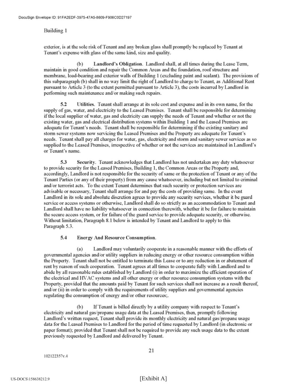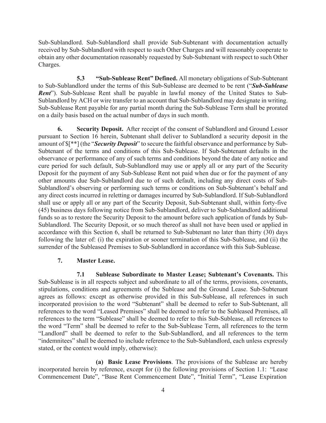4 Sub-Sublandlord. Sub-Sublandlord shall provide Sub-Subtenant with documentation actually received by Sub-Sublandlord with respect to such Other Charges and will reasonably cooperate to obtain any other documentation reasonably requested by Sub-Subtenant with respect to such Other Charges. 5.3 “Sub-Sublease Rent” Defined. All monetary obligations of Sub-Subtenant to Sub-Sublandlord under the terms of this Sub-Sublease are deemed to be rent (“Sub-Sublease Rent”). Sub-Sublease Rent shall be payable in lawful money of the United States to Sub- Sublandlord by ACH or wire transfer to an account that Sub-Sublandlord may designate in writing. Sub-Sublease Rent payable for any partial month during the Sub-Sublease Term shall be prorated on a daily basis based on the actual number of days in such month. 6. Security Deposit. After receipt of the consent of Sublandlord and Ground Lessor pursuant to Section 16 herein, Subtenant shall deliver to Sublandlord a security deposit in the amount of $[**] (the “Security Deposit” to secure the faithful observance and performance by Sub- Subtenant of the terms and conditions of this Sub-Sublease. If Sub-Subtenant defaults in the observance or performance of any of such terms and conditions beyond the date of any notice and cure period for such default, Sub-Sublandlord may use or apply all or any part of the Security Deposit for the payment of any Sub-Sublease Rent not paid when due or for the payment of any other amounts due Sub-Sublandlord due to of such default, including any direct costs of Sub- Sublandlord’s observing or performing such terms or conditions on Sub-Subtenant’s behalf and any direct costs incurred in reletting or damages incurred by Sub-Sublandlord. If Sub-Sublandlord shall use or apply all or any part of the Security Deposit, Sub-Subtenant shall, within forty-five (45) business days following notice from Sub-Sublandlord, deliver to Sub-Sublandlord additional funds so as to restore the Security Deposit to the amount before such application of funds by Sub- Sublandlord. The Security Deposit, or so much thereof as shall not have been used or applied in accordance with this Section 6, shall be returned to Sub-Subtenant no later than thirty (30) days following the later of: (i) the expiration or sooner termination of this Sub-Sublease, and (ii) the surrender of the Subleased Premises to Sub-Sublandlord in accordance with this Sub-Sublease. 7. Master Lease. 7.1 Sublease Subordinate to Master Lease; Subtenant’s Covenants. This Sub-Sublease is in all respects subject and subordinate to all of the terms, provisions, covenants, stipulations, conditions and agreements of the Sublease and the Ground Lease. Sub-Subtenant agrees as follows: except as otherwise provided in this Sub-Sublease, all references in such incorporated provision to the word “Subtenant” shall be deemed to refer to Sub-Subtenant, all references to the word “Leased Premises” shall be deemed to refer to the Subleased Premises, all references to the term “Sublease” shall be deemed to refer to this Sub-Sublease, all references to the word “Term” shall be deemed to refer to the Sub-Sublease Term, all references to the term “Landlord” shall be deemed to refer to the Sub-Sublandlord, and all references to the term “indemnitees” shall be deemed to include reference to the Sub-Sublandlord, each unless expressly stated, or the context would imply, otherwise): (a) Basic Lease Provisions. The provisions of the Sublease are hereby incorporated herein by reference, except for (i) the following provisions of Section 1.1: “Lease Commencement Date”, “Base Rent Commencement Date”, “Initial Term”, “Lease Expiration