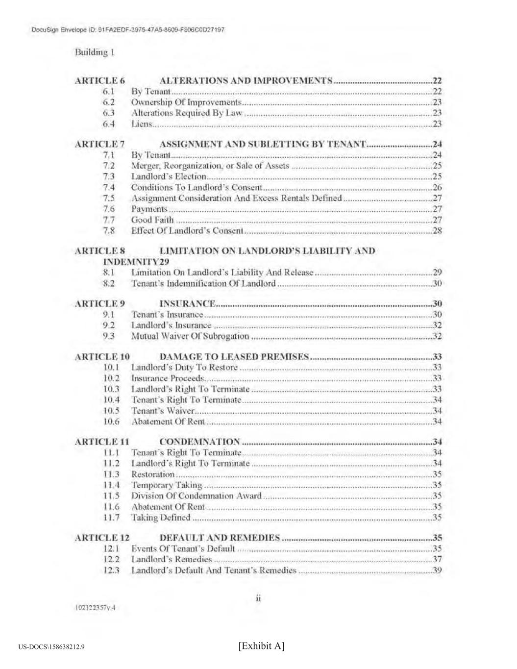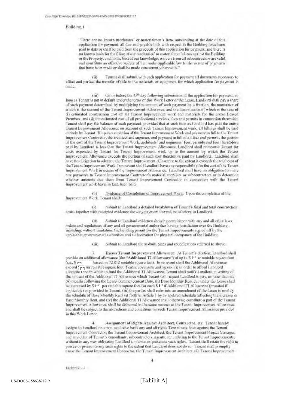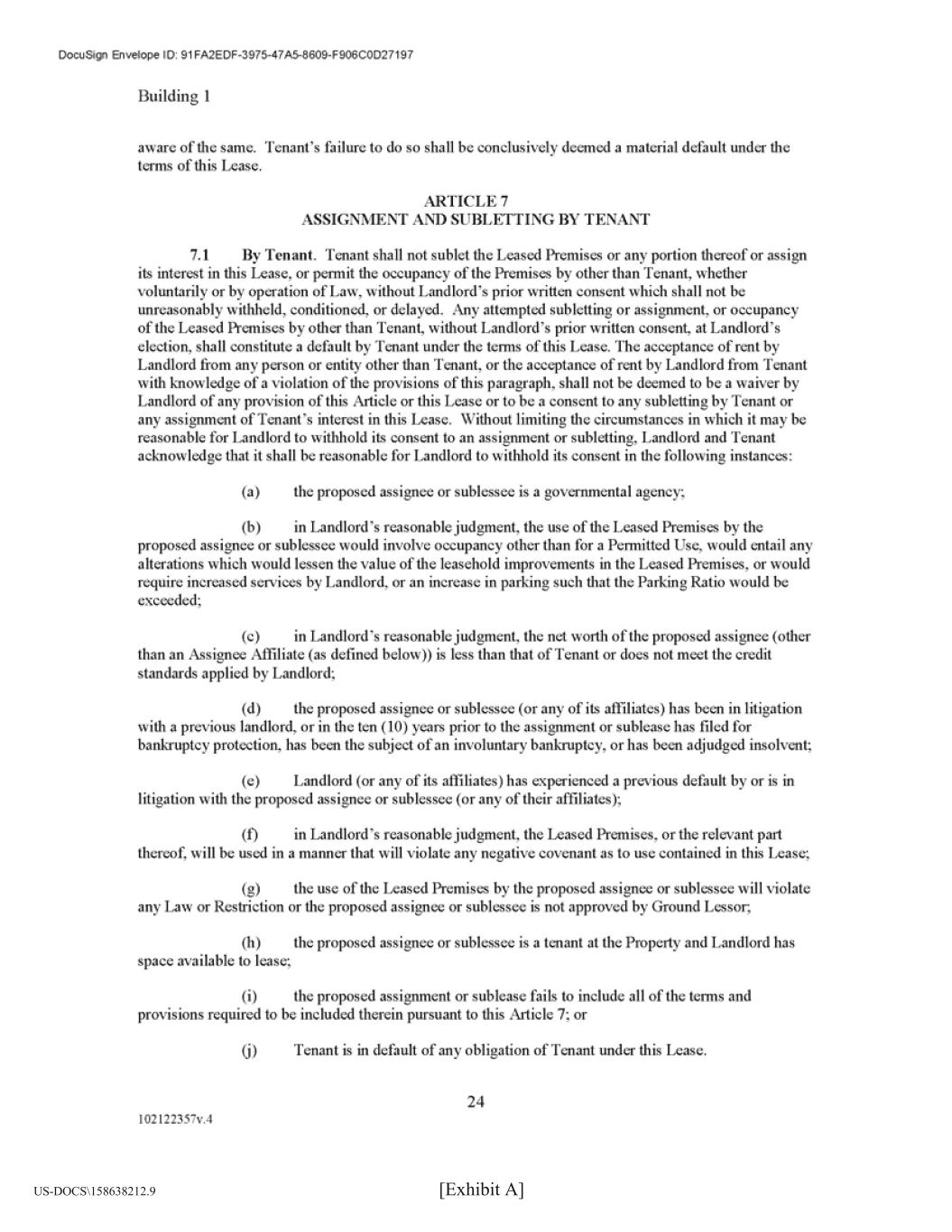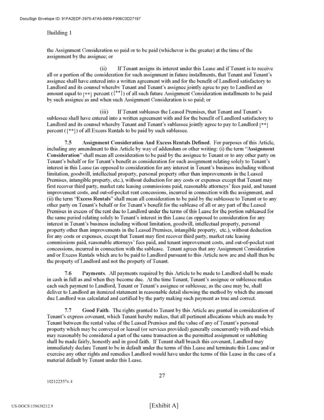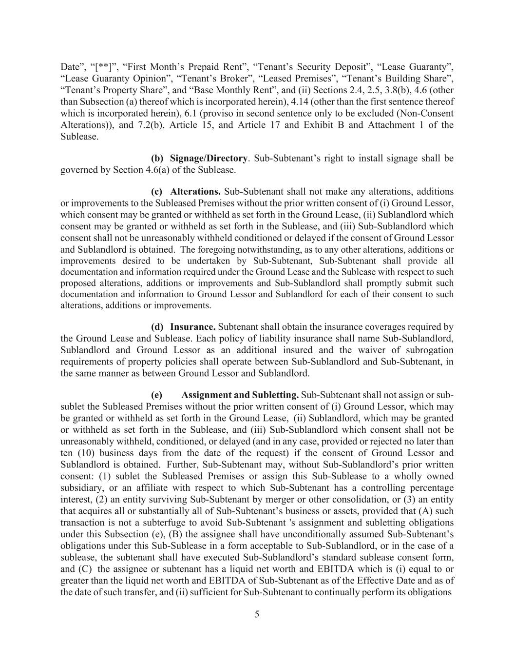 5 Date”, “[**]”, “First Month’s Prepaid Rent”, “Tenant’s Security Deposit”, “Lease Guaranty”, “Lease Guaranty Opinion”, “Tenant’s Broker”, “Leased Premises”, “Tenant’s Building Share”, “Tenant’s Property Share”, and “Base Monthly Rent”, and (ii) Sections 2.4, 2.5, 3.8(b), 4.6 (other than Subsection (a) thereof which is incorporated herein), 4.14 (other than the first sentence thereof which is incorporated herein), 6.1 (proviso in second sentence only to be excluded (Non-Consent Alterations)), and 7.2(b), Article 15, and Article 17 and Exhibit B and Attachment 1 of the Sublease. (b) Signage/Directory. Sub-Subtenant’s right to install signage shall be governed by Section 4.6(a) of the Sublease. (c) Alterations. Sub-Subtenant shall not make any alterations, additions or improvements to the Subleased Premises without the prior written consent of (i) Ground Lessor, which consent may be granted or withheld as set forth in the Ground Lease, (ii) Sublandlord which consent may be granted or withheld as set forth in the Sublease, and (iii) Sub-Sublandlord which consent shall not be unreasonably withheld conditioned or delayed if the consent of Ground Lessor and Sublandlord is obtained. The foregoing notwithstanding, as to any other alterations, additions or improvements desired to be undertaken by Sub-Subtenant, Sub-Subtenant shall provide all documentation and information required under the Ground Lease and the Sublease with respect to such proposed alterations, additions or improvements and Sub-Sublandlord shall promptly submit such documentation and information to Ground Lessor and Sublandlord for each of their consent to such alterations, additions or improvements. (d) Insurance. Subtenant shall obtain the insurance coverages required by the Ground Lease and Sublease. Each policy of liability insurance shall name Sub-Sublandlord, Sublandlord and Ground Lessor as an additional insured and the waiver of subrogation requirements of property policies shall operate between Sub-Sublandlord and Sub-Subtenant, in the same manner as between Ground Lessor and Sublandlord. (e) Assignment and Subletting. Sub-Subtenant shall not assign or sub- sublet the Subleased Premises without the prior written consent of (i) Ground Lessor, which may be granted or withheld as set forth in the Ground Lease, (ii) Sublandlord, which may be granted or withheld as set forth in the Sublease, and (iii) Sub-Sublandlord which consent shall not be unreasonably withheld, conditioned, or delayed (and in any case, provided or rejected no later than ten (10) business days from the date of the request) if the consent of Ground Lessor and Sublandlord is obtained. Further, Sub-Subtenant may, without Sub-Sublandlord’s prior written consent: (1) sublet the Subleased Premises or assign this Sub-Sublease to a wholly owned subsidiary, or an affiliate with respect to which Sub-Subtenant has a controlling percentage interest, (2) an entity surviving Sub-Subtenant by merger or other consolidation, or (3) an entity that acquires all or substantially all of Sub-Subtenant’s business or assets, provided that (A) such transaction is not a subterfuge to avoid Sub-Subtenant 's assignment and subletting obligations under this Subsection (e), (B) the assignee shall have unconditionally assumed Sub-Subtenant’s obligations under this Sub-Sublease in a form acceptable to Sub-Sublandlord, or in the case of a sublease, the subtenant shall have executed Sub-Sublandlord’s standard sublease consent form, and (C) the assignee or subtenant has a liquid net worth and EBITDA which is (i) equal to or greater than the liquid net worth and EBITDA of Sub-Subtenant as of the Effective Date and as of the date of such transfer, and (ii) sufficient for Sub-Subtenant to continually perform its obligations