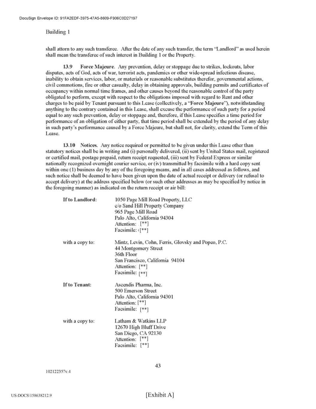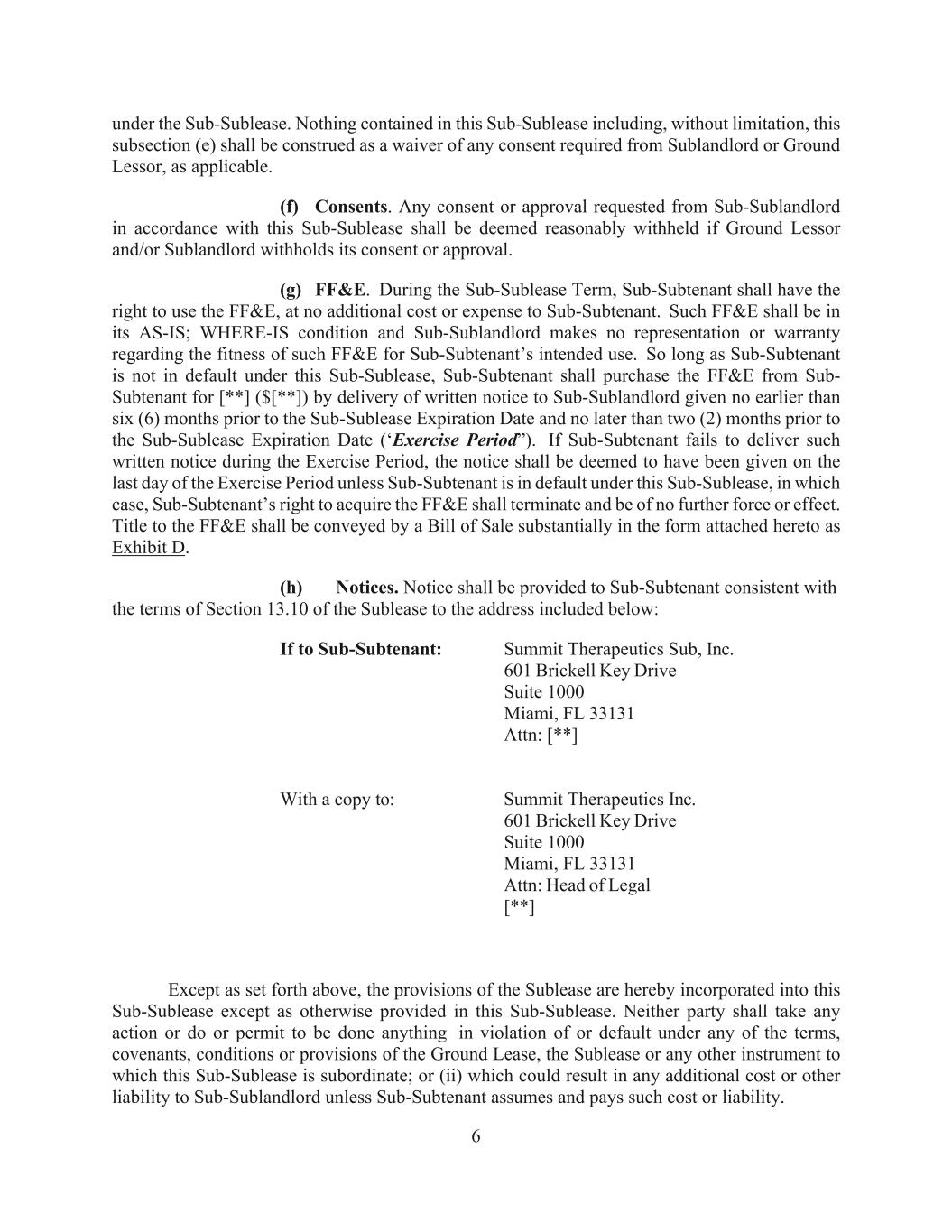6 under the Sub-Sublease. Nothing contained in this Sub-Sublease including, without limitation, this subsection (e) shall be construed as a waiver of any consent required from Sublandlord or Ground Lessor, as applicable. (f) Consents. Any consent or approval requested from Sub-Sublandlord in accordance with this Sub-Sublease shall be deemed reasonably withheld if Ground Lessor and/or Sublandlord withholds its consent or approval. (g) FF&E. During the Sub-Sublease Term, Sub-Subtenant shall have the right to use the FF&E, at no additional cost or expense to Sub-Subtenant. Such FF&E shall be in its AS-IS; WHERE-IS condition and Sub-Sublandlord makes no representation or warranty regarding the fitness of such FF&E for Sub-Subtenant’s intended use. So long as Sub-Subtenant is not in default under this Sub-Sublease, Sub-Subtenant shall purchase the FF&E from Sub- Subtenant for [**] ($[**]) by delivery of written notice to Sub-Sublandlord given no earlier than six (6) months prior to the Sub-Sublease Expiration Date and no later than two (2) months prior to the Sub-Sublease Expiration Date (‘Exercise Period”). If Sub-Subtenant fails to deliver such written notice during the Exercise Period, the notice shall be deemed to have been given on the last day of the Exercise Period unless Sub-Subtenant is in default under this Sub-Sublease, in which case, Sub-Subtenant’s right to acquire the FF&E shall terminate and be of no further force or effect. Title to the FF&E shall be conveyed by a Bill of Sale substantially in the form attached hereto as Exhibit D. (h) Notices. Notice shall be provided to Sub-Subtenant consistent with the terms of Section 13.10 of the Sublease to the address included below: If to Sub-Subtenant: Summit Therapeutics Sub, Inc. 601 Brickell Key Drive Suite 1000 Miami, FL 33131 Attn: [**] With a copy to: Summit Therapeutics Inc. 601 Brickell Key Drive Suite 1000 Miami, FL 33131 Attn: Head of Legal [**] Except as set forth above, the provisions of the Sublease are hereby incorporated into this Sub-Sublease except as otherwise provided in this Sub-Sublease. Neither party shall take any action or do or permit to be done anything in violation of or default under any of the terms, covenants, conditions or provisions of the Ground Lease, the Sublease or any other instrument to which this Sub-Sublease is subordinate; or (ii) which could result in any additional cost or other liability to Sub-Sublandlord unless Sub-Subtenant assumes and pays such cost or liability.