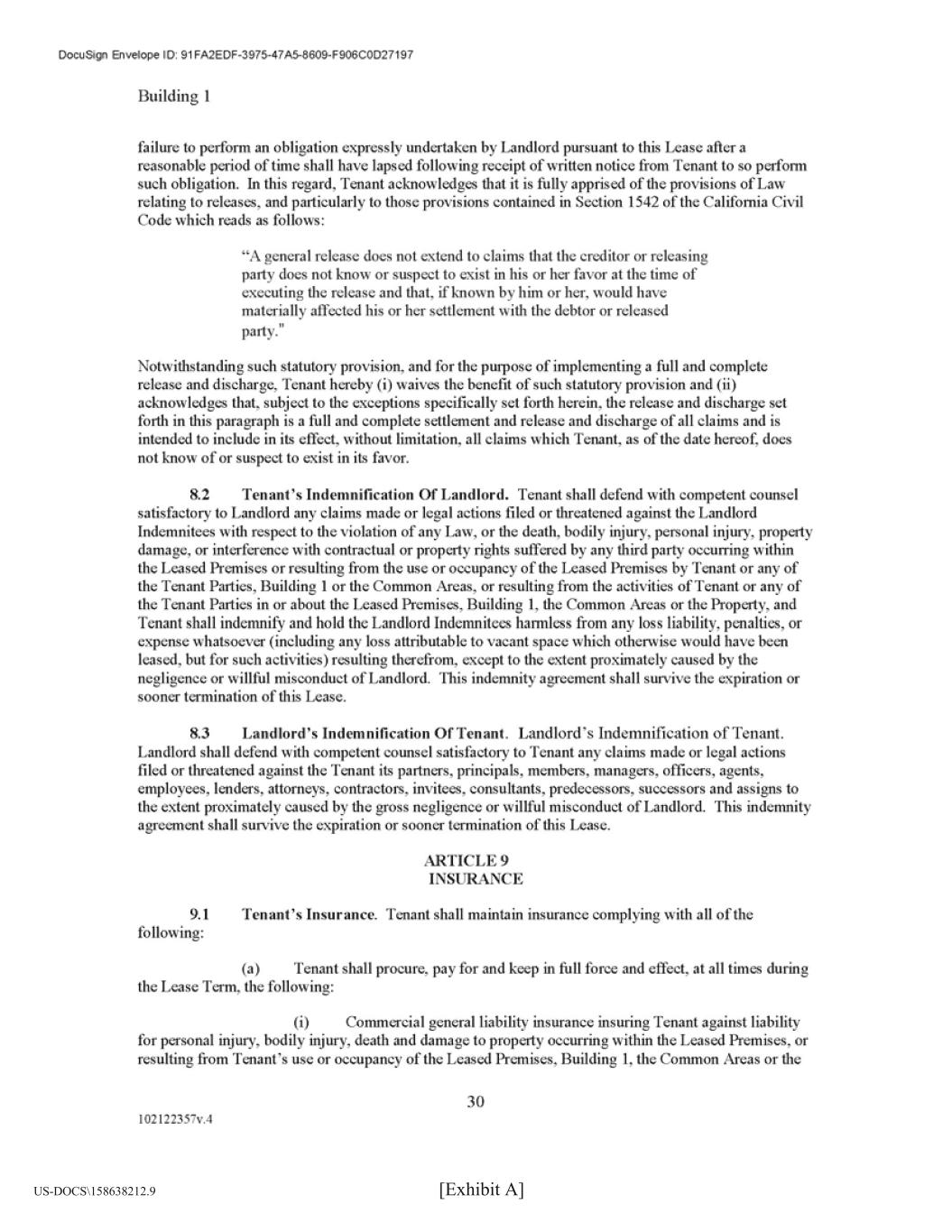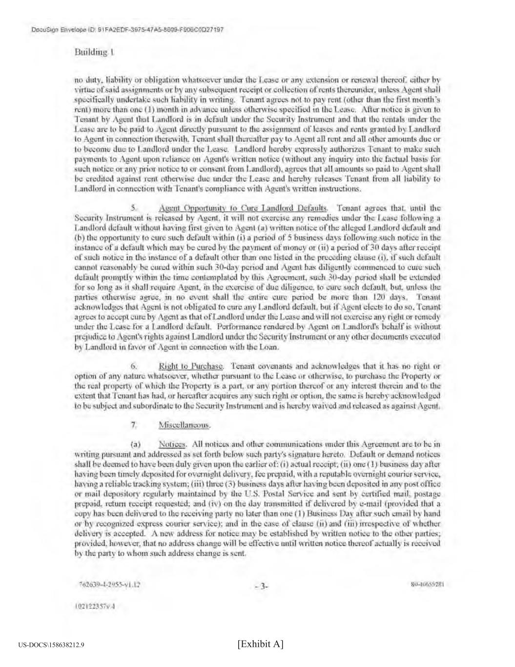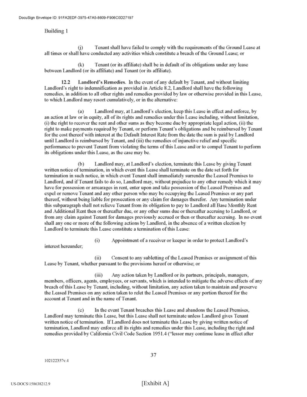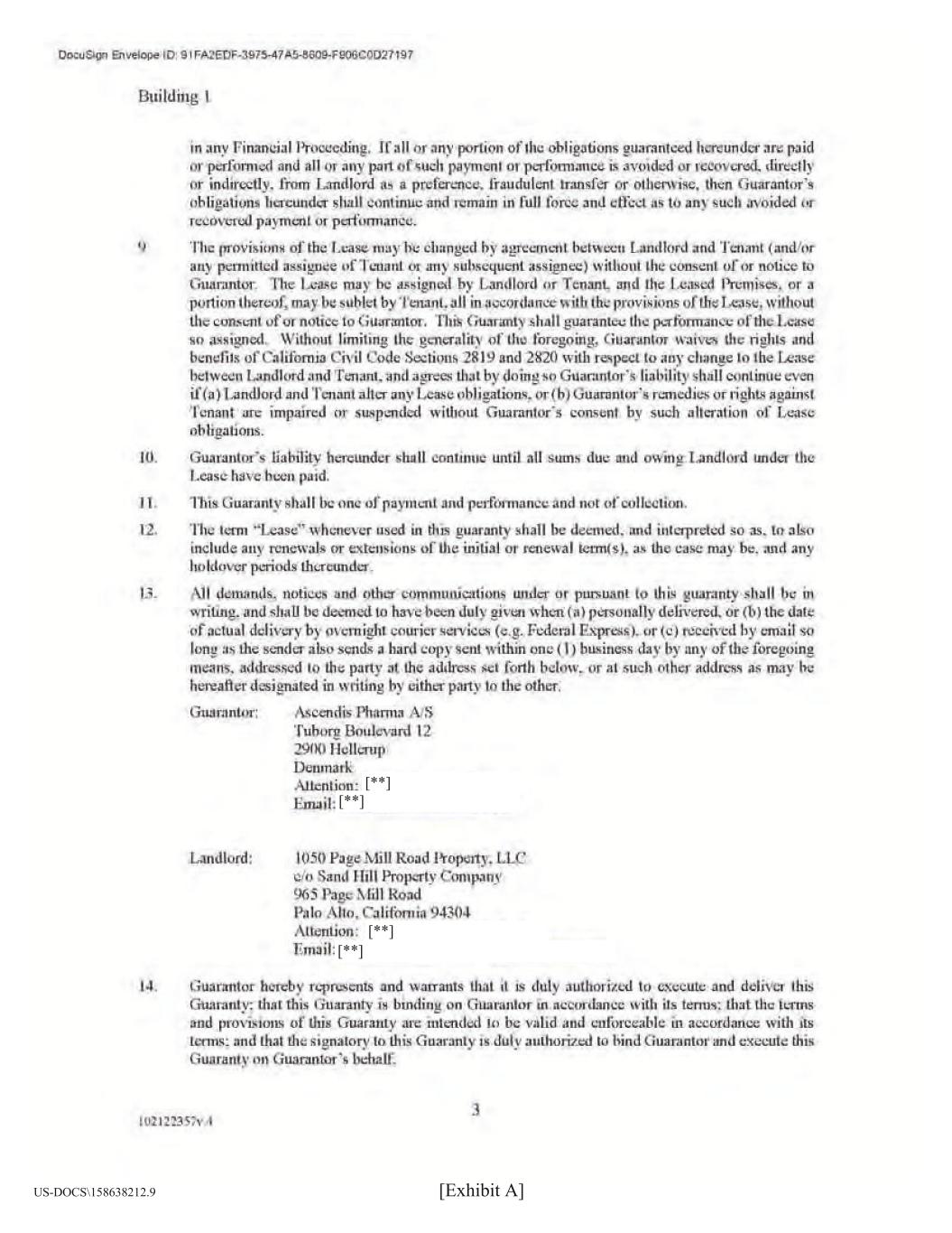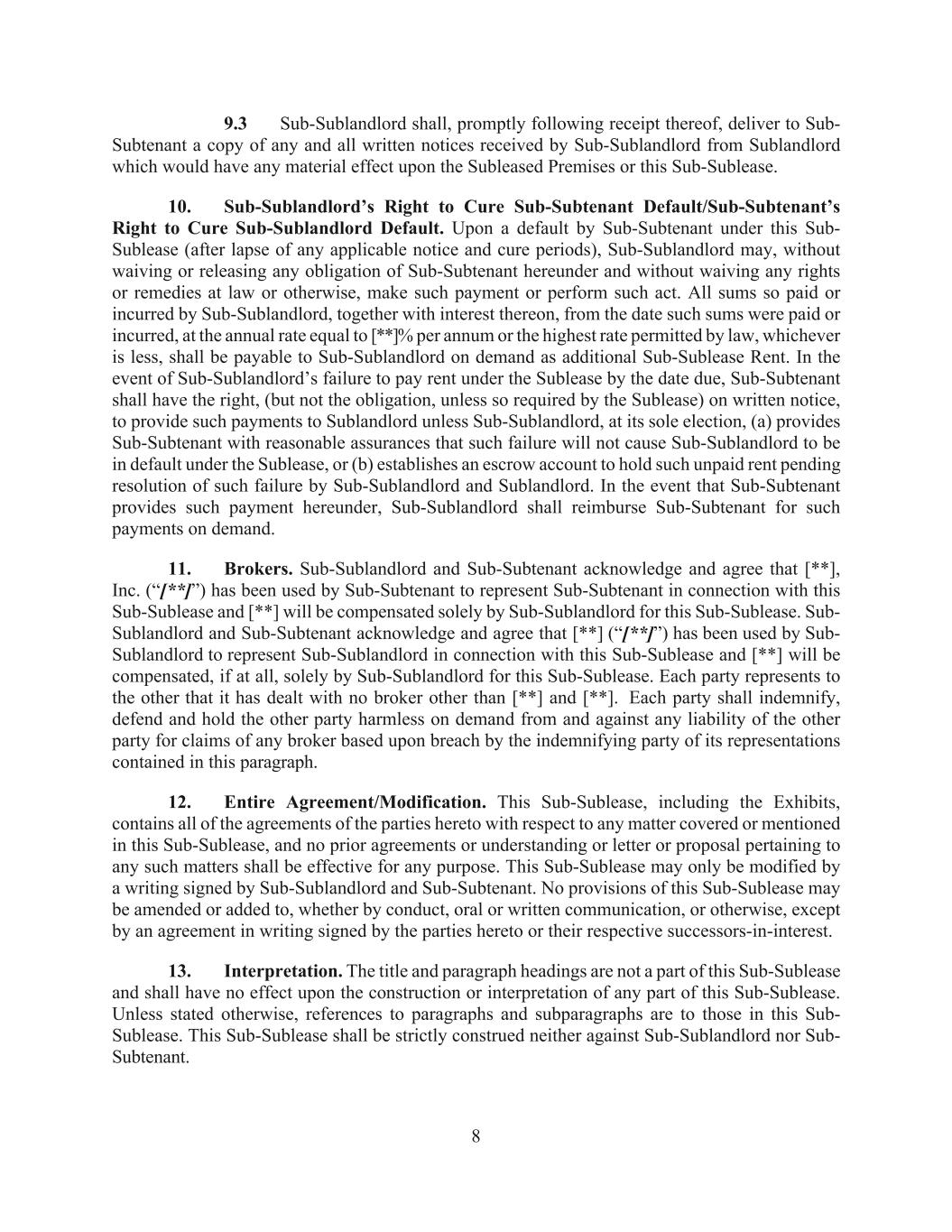 8 9.3 Sub-Sublandlord shall, promptly following receipt thereof, deliver to Sub- Subtenant a copy of any and all written notices received by Sub-Sublandlord from Sublandlord which would have any material effect upon the Subleased Premises or this Sub-Sublease. 10. Sub-Sublandlord’s Right to Cure Sub-Subtenant Default/Sub-Subtenant’s Right to Cure Sub-Sublandlord Default. Upon a default by Sub-Subtenant under this Sub- Sublease (after lapse of any applicable notice and cure periods), Sub-Sublandlord may, without waiving or releasing any obligation of Sub-Subtenant hereunder and without waiving any rights or remedies at law or otherwise, make such payment or perform such act. All sums so paid or incurred by Sub-Sublandlord, together with interest thereon, from the date such sums were paid or incurred, at the annual rate equal to [**]% per annum or the highest rate permitted by law, whichever is less, shall be payable to Sub-Sublandlord on demand as additional Sub-Sublease Rent. In the event of Sub-Sublandlord’s failure to pay rent under the Sublease by the date due, Sub-Subtenant shall have the right, (but not the obligation, unless so required by the Sublease) on written notice, to provide such payments to Sublandlord unless Sub-Sublandlord, at its sole election, (a) provides Sub-Subtenant with reasonable assurances that such failure will not cause Sub-Sublandlord to be in default under the Sublease, or (b) establishes an escrow account to hold such unpaid rent pending resolution of such failure by Sub-Sublandlord and Sublandlord. In the event that Sub-Subtenant provides such payment hereunder, Sub-Sublandlord shall reimburse Sub-Subtenant for such payments on demand. 11. Brokers. Sub-Sublandlord and Sub-Subtenant acknowledge and agree that [**], Inc. (“[**]”) has been used by Sub-Subtenant to represent Sub-Subtenant in connection with this Sub-Sublease and [**] will be compensated solely by Sub-Sublandlord for this Sub-Sublease. Sub- Sublandlord and Sub-Subtenant acknowledge and agree that [**] (“[**]”) has been used by Sub- Sublandlord to represent Sub-Sublandlord in connection with this Sub-Sublease and [**] will be compensated, if at all, solely by Sub-Sublandlord for this Sub-Sublease. Each party represents to the other that it has dealt with no broker other than [**] and [**]. Each party shall indemnify, defend and hold the other party harmless on demand from and against any liability of the other party for claims of any broker based upon breach by the indemnifying party of its representations contained in this paragraph. 12. Entire Agreement/Modification. This Sub-Sublease, including the Exhibits, contains all of the agreements of the parties hereto with respect to any matter covered or mentioned in this Sub-Sublease, and no prior agreements or understanding or letter or proposal pertaining to any such matters shall be effective for any purpose. This Sub-Sublease may only be modified by a writing signed by Sub-Sublandlord and Sub-Subtenant. No provisions of this Sub-Sublease may be amended or added to, whether by conduct, oral or written communication, or otherwise, except by an agreement in writing signed by the parties hereto or their respective successors-in-interest. 13. Interpretation. The title and paragraph headings are not a part of this Sub-Sublease and shall have no effect upon the construction or interpretation of any part of this Sub-Sublease. Unless stated otherwise, references to paragraphs and subparagraphs are to those in this Sub- Sublease. This Sub-Sublease shall be strictly construed neither against Sub-Sublandlord nor Sub- Subtenant.