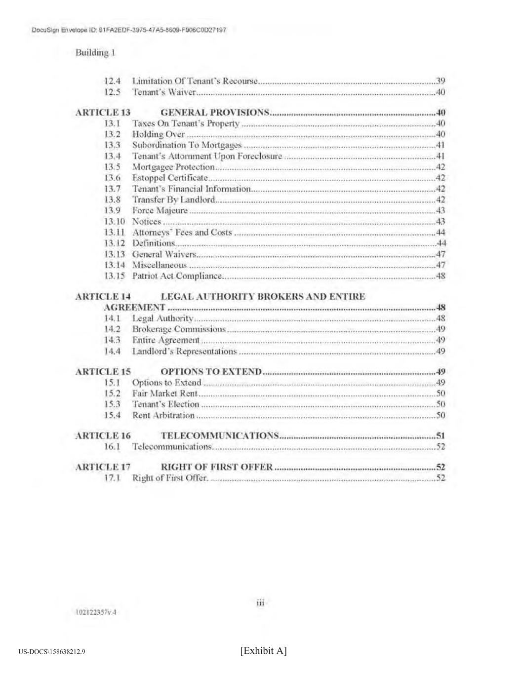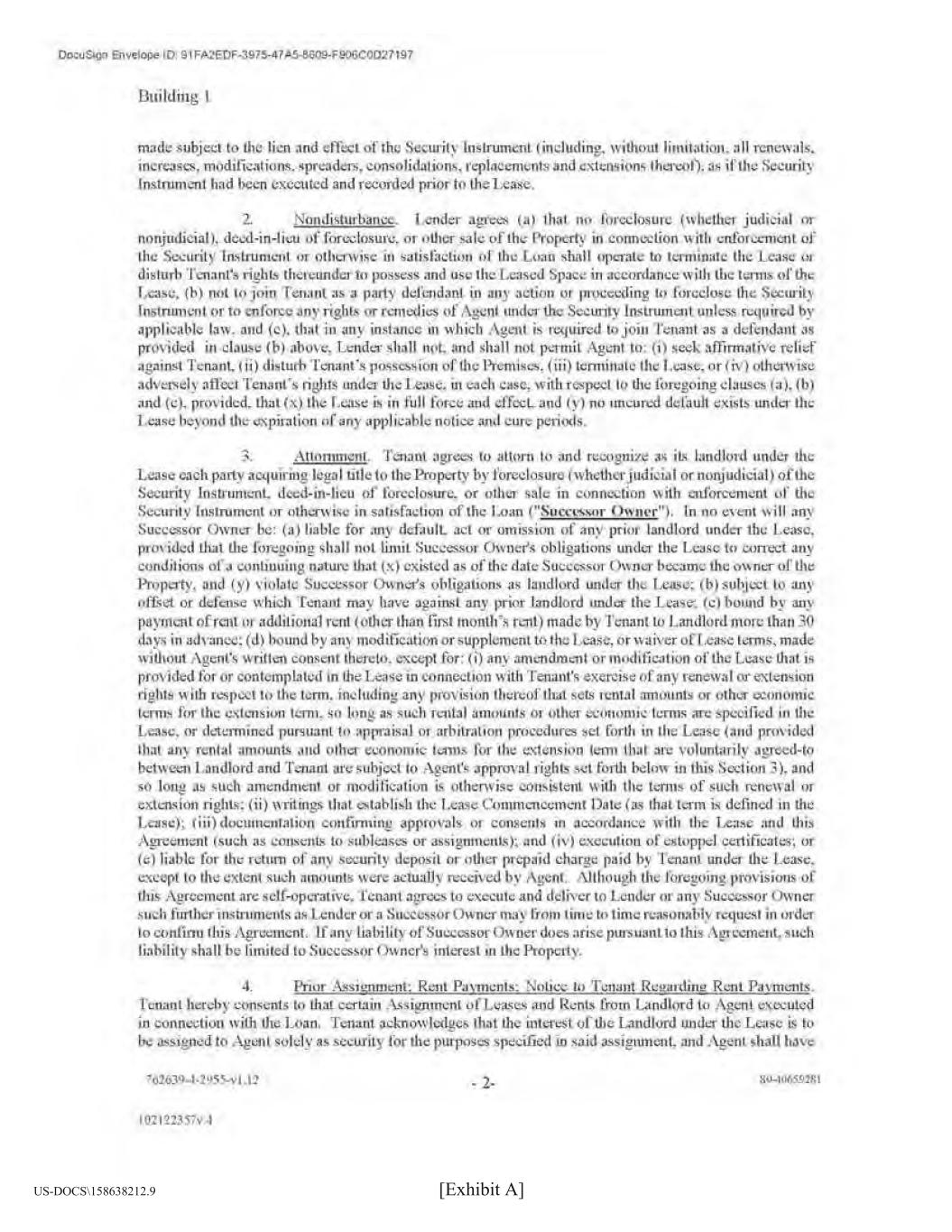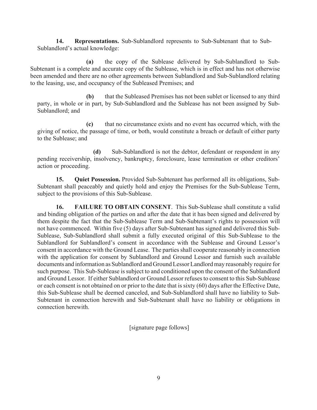 9 14. Representations. Sub-Sublandlord represents to Sub-Subtenant that to Sub- Sublandlord’s actual knowledge: (a) the copy of the Sublease delivered by Sub-Sublandlord to Sub- Subtenant is a complete and accurate copy of the Sublease, which is in effect and has not otherwise been amended and there are no other agreements between Sublandlord and Sub-Sublandlord relating to the leasing, use, and occupancy of the Subleased Premises; and (b) that the Subleased Premises has not been sublet or licensed to any third party, in whole or in part, by Sub-Sublandlord and the Sublease has not been assigned by Sub- Sublandlord; and (c) that no circumstance exists and no event has occurred which, with the giving of notice, the passage of time, or both, would constitute a breach or default of either party to the Sublease; and (d) Sub-Sublandlord is not the debtor, defendant or respondent in any pending receivership, insolvency, bankruptcy, foreclosure, lease termination or other creditors’ action or proceeding. 15. Quiet Possession. Provided Sub-Subtenant has performed all its obligations, Sub- Subtenant shall peaceably and quietly hold and enjoy the Premises for the Sub-Sublease Term, subject to the provisions of this Sub-Sublease. 16. FAILURE TO OBTAIN CONSENT. This Sub-Sublease shall constitute a valid and binding obligation of the parties on and after the date that it has been signed and delivered by them despite the fact that the Sub-Sublease Term and Sub-Subtenant’s rights to possession will not have commenced. Within five (5) days after Sub-Subtenant has signed and delivered this Sub- Sublease, Sub-Sublandlord shall submit a fully executed original of this Sub-Sublease to the Sublandlord for Sublandlord’s consent in accordance with the Sublease and Ground Lessor’s consent in accordance with the Ground Lease. The parties shall cooperate reasonably in connection with the application for consent by Sublandlord and Ground Lessor and furnish such available documents and information as Sublandlord and Ground Lessor Landlord may reasonably require for such purpose. This Sub-Sublease is subject to and conditioned upon the consent of the Sublandlord and Ground Lessor. If either Sublandlord or Ground Lessor refuses to consent to this Sub-Sublease or each consent is not obtained on or prior to the date that is sixty (60) days after the Effective Date, this Sub-Sublease shall be deemed canceled, and Sub-Sublandlord shall have no liability to Sub- Subtenant in connection herewith and Sub-Subtenant shall have no liability or obligations in connection herewith. [signature page follows]