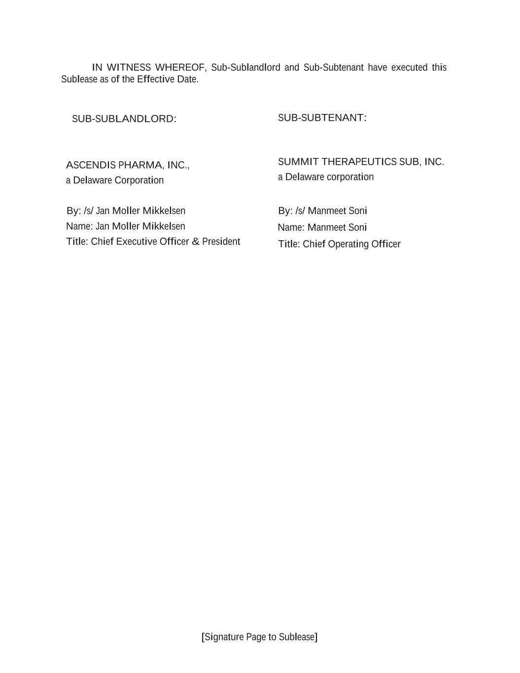 [Signature Page to Sublease] IN WITNESS WHEREOF, Sub-Sublandlord and Sub-Subtenant have executed this Sublease as of the Effective Date. SUB-SUBLANDLORD: SUB-SUBTENANT: ASCENDIS PHARMA, INC., a Delaware Corporation SUMMIT THERAPEUTICS SUB, INC. a Delaware corporation By: /s/ Jan Moller Mikkelsen By: /s/ Manmeet Soni Name: Jan Moller Mikkelsen Name: Manmeet Soni Title: Chief Executive Officer & President Title: Chief Operating Officer