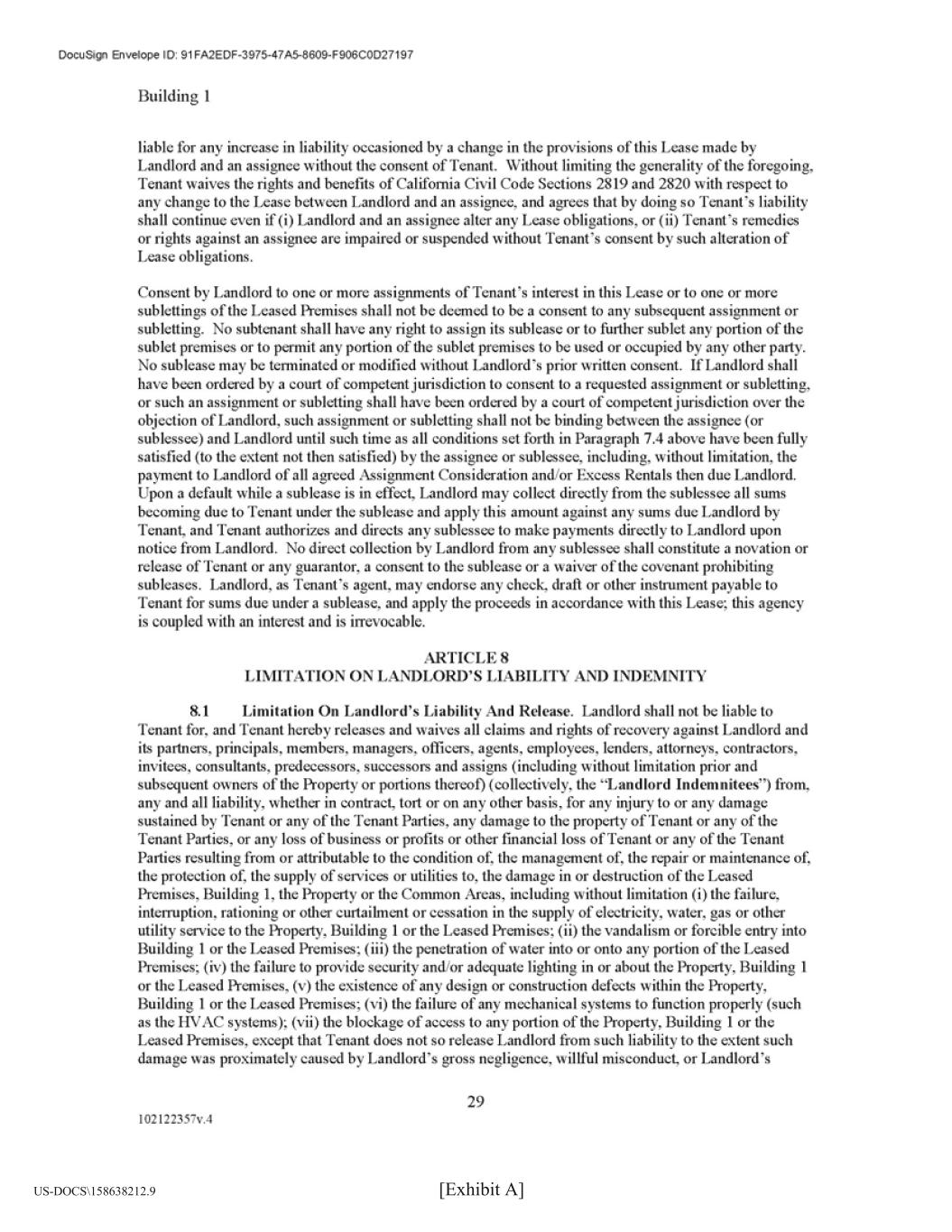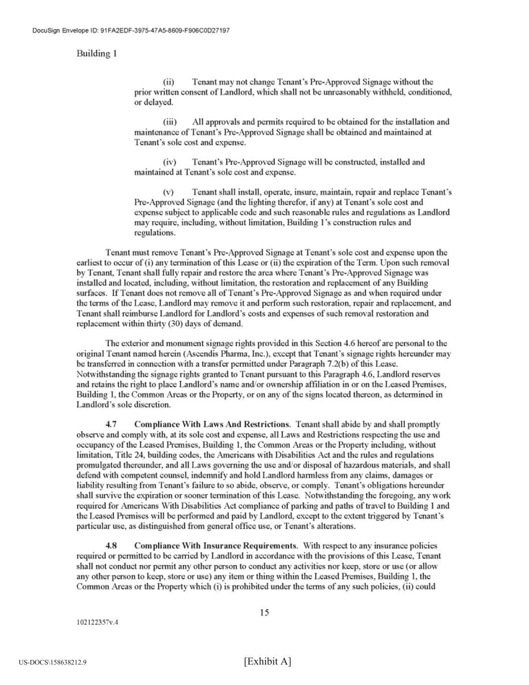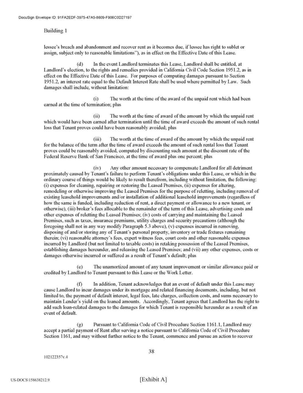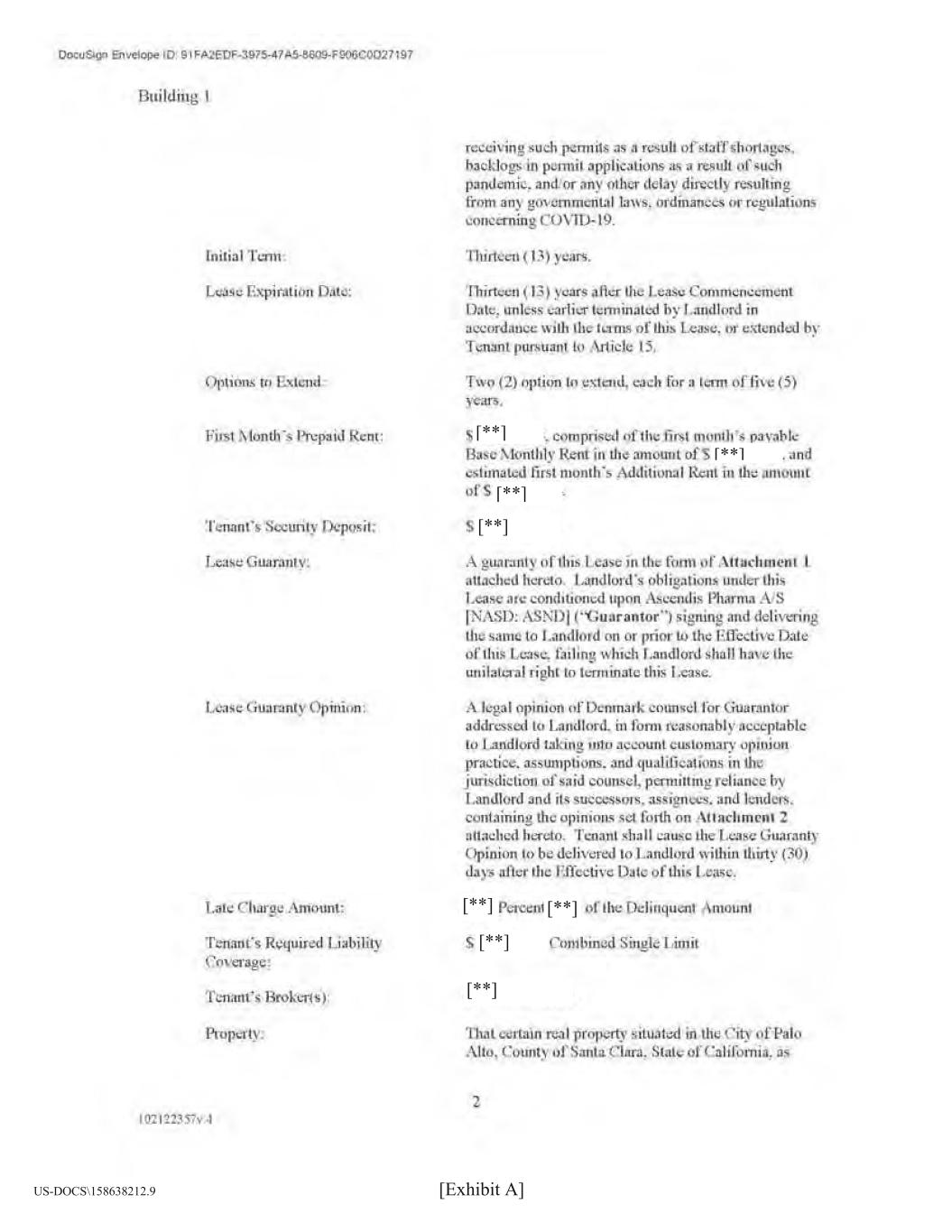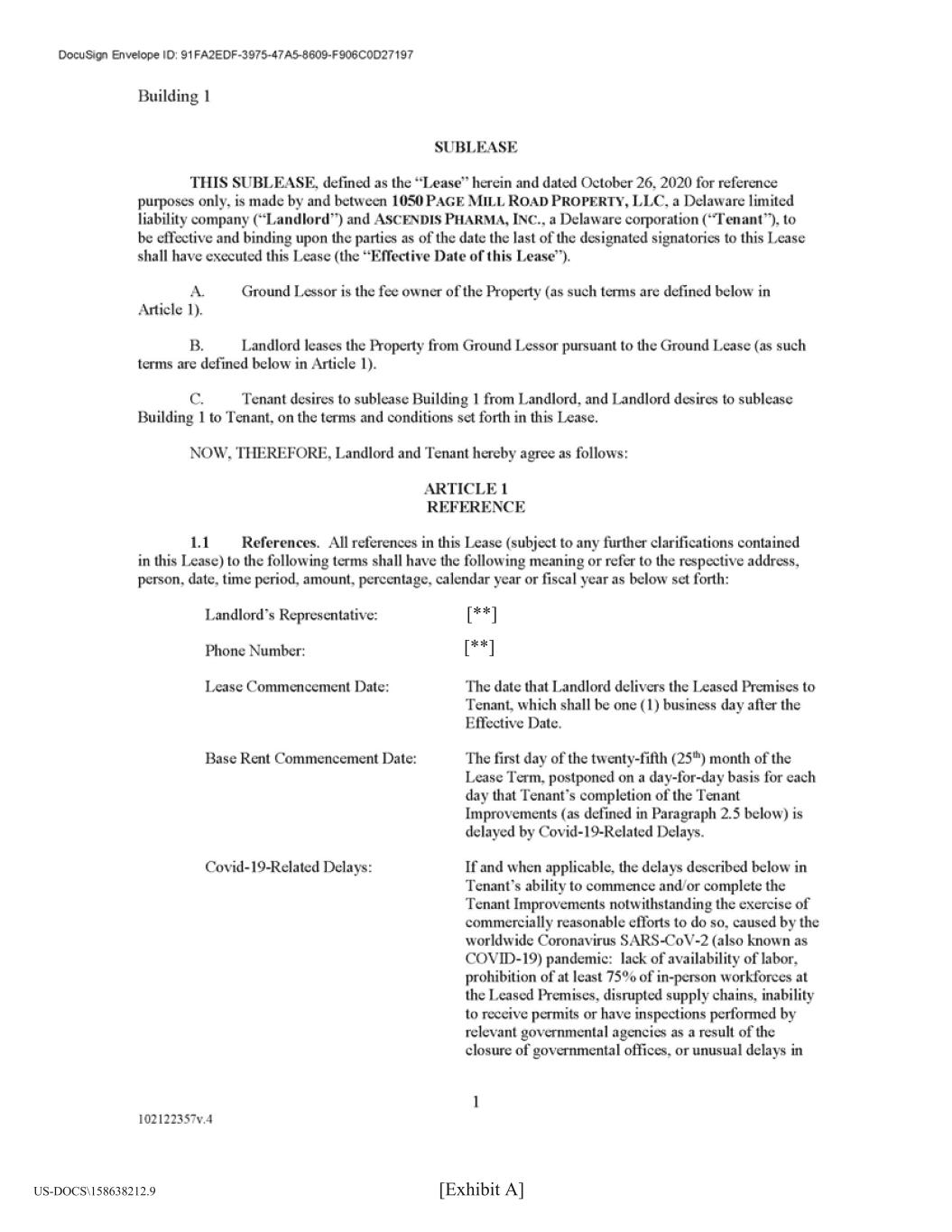 2 expressly acknowledges and agrees Sub-Sublandlord shall not have any obligation to perform any work to prepare the Subleased Premises for Sub-Subtenant’s use and occupancy. 2. Term. Subject to Section 15 herein, the term of this Sub-Sublease (the “Sub- Sublease Term”) shall commence on the date that is the later of: (i) January 1, 2026, and (ii) the date on which Sub-Sublandlord obtains the consent of Sublandlord and Ground Lessor to this Sub- Sublease (“Consent”), in form and substance reasonably satisfactory to Ground Lessor, Sub- Sublandlord and Sub-Subtenant (the “Sublease Commencement Date”) and shall expire on October 28, 2033 (“Sub-Sublease Expiration Date”), unless earlier terminated pursuant to the terms of this Sub-Sublease. 3. Use. Sub-Subtenant shall use the Subleased Premises in compliance with the Sublease, and solely for conducting Sub-Subtenant’s business, which includes general office and research development purposes and other legally permitted uses ancillary thereto. 4. Rent. Sub-Sublandlord shall be responsible for the timely payment of Base Monthly Rent and Additional Rent under the Sublease and otherwise complying with the obligations of Sub-Sublandlord under the Sublease before and during the Sub-Sublease Term. Sub- Subtenant shall pay to Sub-Sublandlord the following as Sub-Sublease rent hereunder: 5. Sublease Term Rent; Rent Commencement Date. Beginning on the Sub- Sublease Rent Commencement Date, and continuing during the Sub-Sublease Term, Sub- Subtenant shall pay to Sub-Sublandlord, as sublease rent (“Monthly Sub-Sublease Rent”) and in lieu of the Base Monthly Rent set forth in the Sublease, in lawful money of the United States of America, without any deduction, offset, prior notice or demand, in advance on the first business day of each month of the Sub-Sublease Term from the Sub-Sublease Rent Commencement Date through the Sublease Expiration Date, the amount of $[**] (based on a rental rate of $[**] per rentable square foot of the Subleased Premises), plus Sub-Subtenant’s Share (as defined below) of Additional Rent (as defined in the Sublease) required under the Sublease with respect to the Subleased Premises in and for the Sublease Term, excluding only utility usage and janitorial services, any late fees, damages or penalties arising from Sublandlord’s breach of the Master Lease (other than those, if any, resulting from Subtenant’s failure to comply with this Sublease), and except as otherwise provided in this Sublease. Sub-Sublandlord shall provide Sub-Subtenant any documentation actually received by Sub-Sublandlord with respect to such Additional Rent amounts and will reasonably cooperate to obtain any other documentation reasonably requested by Sub-Subtenant with respect to such Additional Rents. Notwithstanding anything to the contrary contained in this Sub-Sublease, Sub-Subtenant’s obligation for payment of Monthly Sub-Sublease Rent shall be conditionally abated for each of the initial [**] ([**]) full calendar months of the Sub-Sublease Term by [**] percent ([**]%) (“Abatement”), provided that in the event of the termination of this Sub-Sublease due to a breach by Sub-Subtenant under this Sub-Sublease, then, in addition to all other rights and remedies of Sub-Sublandlord, the amount of Monthly Sub- Sublease Rent theretofore so conditionally abated shall be immediately due and payable in full to Sub-Sublandlord (“Inducement Recapture”) and Sub-Subtenant shall not be entitled to any further conditional abatement of Monthly Sub-Sublease Rent hereunder. Such abatement shall apply to Monthly Sub-Sublease Rent only and shall not relieve Sub-Subtenant of any other obligations under this Sub-Sublease including, without limitation, the obligation to pay Additional Rent hereunder. As used herein, “Sub-Sublease Rent Commencement Date” shall mean the Sub-