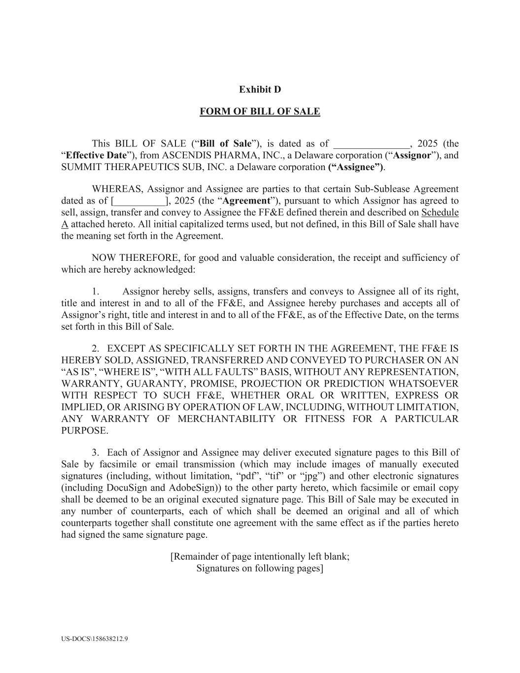 US-DOCS\158638212.9 Exhibit D FORM OF BILL OF SALE This BILL OF SALE (“Bill of Sale”), is dated as of _______________, 2025 (the “Effective Date”), from ASCENDIS PHARMA, INC., a Delaware corporation (“Assignor”), and SUMMIT THERAPEUTICS SUB, INC. a Delaware corporation (“Assignee”). WHEREAS, Assignor and Assignee are parties to that certain Sub-Sublease Agreement dated as of [__________], 2025 (the “Agreement”), pursuant to which Assignor has agreed to sell, assign, transfer and convey to Assignee the FF&E defined therein and described on Schedule A attached hereto. All initial capitalized terms used, but not defined, in this Bill of Sale shall have the meaning set forth in the Agreement. NOW THEREFORE, for good and valuable consideration, the receipt and sufficiency of which are hereby acknowledged: 1. Assignor hereby sells, assigns, transfers and conveys to Assignee all of its right, title and interest in and to all of the FF&E, and Assignee hereby purchases and accepts all of Assignor’s right, title and interest in and to all of the FF&E, as of the Effective Date, on the terms set forth in this Bill of Sale. 2. EXCEPT AS SPECIFICALLY SET FORTH IN THE AGREEMENT, THE FF&E IS HEREBY SOLD, ASSIGNED, TRANSFERRED AND CONVEYED TO PURCHASER ON AN “AS IS”, “WHERE IS”, “WITH ALL FAULTS” BASIS, WITHOUT ANY REPRESENTATION, WARRANTY, GUARANTY, PROMISE, PROJECTION OR PREDICTION WHATSOEVER WITH RESPECT TO SUCH FF&E, WHETHER ORAL OR WRITTEN, EXPRESS OR IMPLIED, OR ARISING BY OPERATION OF LAW, INCLUDING, WITHOUT LIMITATION, ANY WARRANTY OF MERCHANTABILITY OR FITNESS FOR A PARTICULAR PURPOSE. 3. Each of Assignor and Assignee may deliver executed signature pages to this Bill of Sale by facsimile or email transmission (which may include images of manually executed signatures (including, without limitation, “pdf”, “tif” or “jpg”) and other electronic signatures (including DocuSign and AdobeSign)) to the other party hereto, which facsimile or email copy shall be deemed to be an original executed signature page. This Bill of Sale may be executed in any number of counterparts, each of which shall be deemed an original and all of which counterparts together shall constitute one agreement with the same effect as if the parties hereto had signed the same signature page. [Remainder of page intentionally left blank; Signatures on following pages]