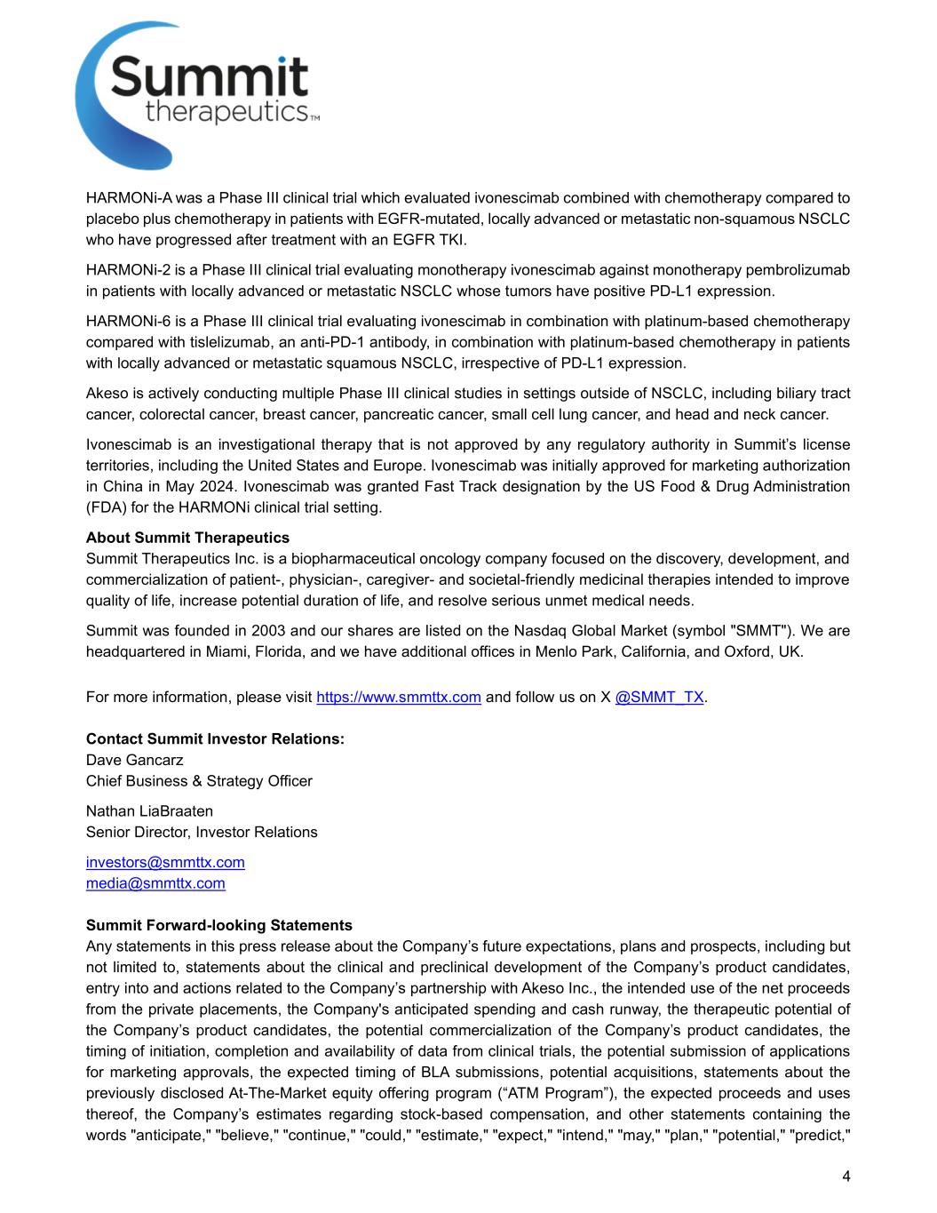 4 HARMONi-A was a Phase III clinical trial which evaluated ivonescimab combined with chemotherapy compared to placebo plus chemotherapy in patients with EGFR-mutated, locally advanced or metastatic non-squamous NSCLC who have progressed after treatment with an EGFR TKI. HARMONi-2 is a Phase III clinical trial evaluating monotherapy ivonescimab against monotherapy pembrolizumab in patients with locally advanced or metastatic NSCLC whose tumors have positive PD-L1 expression. HARMONi-6 is a Phase III clinical trial evaluating ivonescimab in combination with platinum-based chemotherapy compared with tislelizumab, an anti-PD-1 antibody, in combination with platinum-based chemotherapy in patients with locally advanced or metastatic squamous NSCLC, irrespective of PD-L1 expression. Akeso is actively conducting multiple Phase III clinical studies in settings outside of NSCLC, including biliary tract cancer, colorectal cancer, breast cancer, pancreatic cancer, small cell lung cancer, and head and neck cancer. Ivonescimab is an investigational therapy that is not approved by any regulatory authority in Summit’s license territories, including the United States and Europe. Ivonescimab was initially approved for marketing authorization in China in May 2024. Ivonescimab was granted Fast Track designation by the US Food & Drug Administration (FDA) for the HARMONi clinical trial setting. About Summit Therapeutics Summit Therapeutics Inc. is a biopharmaceutical oncology company focused on the discovery, development, and commercialization of patient-, physician-, caregiver- and societal-friendly medicinal therapies intended to improve quality of life, increase potential duration of life, and resolve serious unmet medical needs. Summit was founded in 2003 and our shares are listed on the Nasdaq Global Market (symbol "SMMT"). We are headquartered in Miami, Florida, and we have additional offices in Menlo Park, California, and Oxford, UK. For more information, please visit https://www.smmttx.com and follow us on X @SMMT_TX. Contact Summit Investor Relations: Dave Gancarz Chief Business & Strategy Officer Nathan LiaBraaten Senior Director, Investor Relations investors@smmttx.com media@smmttx.com Summit Forward-looking Statements Any statements in this press release about the Company’s future expectations, plans and prospects, including but not limited to, statements about the clinical and preclinical development of the Company’s product candidates, entry into and actions related to the Company’s partnership with Akeso Inc., the intended use of the net proceeds from the private placements, the Company's anticipated spending and cash runway, the therapeutic potential of the Company’s product candidates, the potential commercialization of the Company’s product candidates, the timing of initiation, completion and availability of data from clinical trials, the potential submission of applications for marketing approvals, the expected timing of BLA submissions, potential acquisitions, statements about the previously disclosed At-The-Market equity offering program (“ATM Program”), the expected proceeds and uses thereof, the Company’s estimates regarding stock-based compensation, and other statements containing the words "anticipate," "believe," "continue," "could," "estimate," "expect," "intend," "may," "plan," "potential," "predict,"