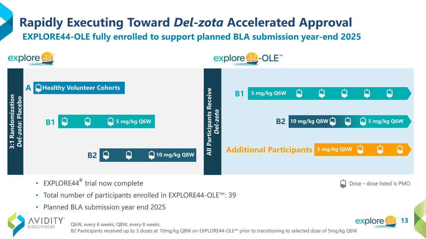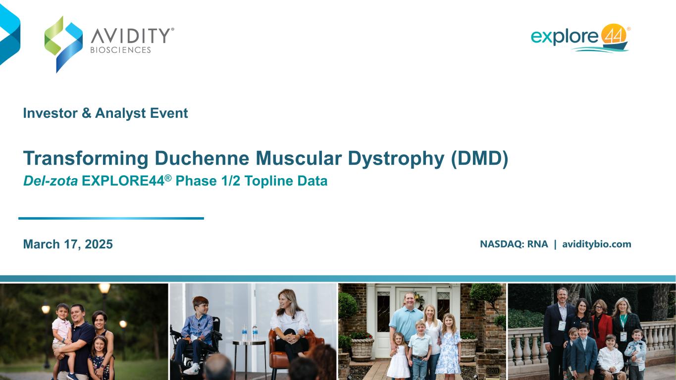 2 We caution the reader that this presentation contains forward-looking statements that involve substantial risks and uncertainties. All statements other than statements of historical fact contained in this presentation are forward-looking statements. Forward-looking statements include, but are not limited to, statements regarding: our business strategy; the design, goals and conduct of our Phase 1/2 EXPLORE44 trial and EXPLORE44-OLE study; the characterization of topline data and results from our Phase 1/2 EXPLORE44 trial and EXPLORE44-OLE study and conclusions drawn therefrom; our plans to submit a BLA to the FDA and the timing thereof; research and development plans; plans and projected timelines for delpacibart zotadirsen (del-zota, formerly AOC 1044); safety and tolerability profile of del-zota; the status and possibility of del-zota regarding accelerated approval; our ability to execute on plans for product launches and the timing thereof; our ability to successfully build commercial infrastructure; our plans regarding our DMD franchise; the potential of the AOC platform; the regulatory pathways of our product candidates; the status and potential of our product candidates as first-in- class and/or best-in-class; dosage levels to be administered in our clinical trials of del-zota; enrollment in our clinical trials and the timing of completion; the ability of our product candidates to treat rare diseases; timing and likelihood of success; product approvals; and plans and objectives of management for future operations. In some cases, the reader can identify forward-looking statements by terms such as “may,” “will,” “should,” “expect,” “plan,” “anticipate,” “could,” “intend,” “target,” “project,” “contemplates,” “believes,” “estimates,” “predicts,” “potential” or “continue” or the negative of these terms or other similar expressions. The inclusion of forward-looking statements should not be regarded as a representation by Avidity that any of our plans will be achieved. Actual results may differ from those set forth in this presentation due to the risks and uncertainties inherent in our business based on factors beyond our control, including, without limitation: the results of preclinical studies and clinical trials are not necessarily predictive of future results; requests for data by the FDA or other regulatory authorities may result in significant additional expense and timing delays; data delivered to the regulators may not be satisfactory, or support a successful BLA submission or registration; the FDA may change its stance regarding the status of del-zota or its ability to achieve accelerated approval; additional participant data related to del-zota that continues to become available may be inconsistent with the data produced as of the most recent date cutoffs, and further analysis of existing data and analysis of new data may lead to conclusions different from those established as of such date cutoffs; unexpected adverse side effects or inadequate efficacy of del-zota may delay or limit its development, regulatory approval and/or commercialization, or may result in clinical holds, recalls or product liability claims; we are early in our development efforts; our approach to the discovery and development of product candidates is unproven, and we do not know whether we will be able to develop any products of commercial value; potential delays in the commencement, enrollment and completion of clinical trials, or of designations conferred by regulatory authorities; our dependence on third parties in connection with clinical testing and product manufacturing; regulatory developments in the United States and foreign countries, and our proposed design of future clinical trials; Fast Track designation by the FDA may not lead to a faster development or regulatory review or approval process; our ability to obtain and maintain intellectual property protection for our product candidates and proprietary technologies; we may exhaust our capital resources sooner than we expect and fail to raise additional needed funds; and other risks described under the heading “Risk Factors” in our Form 10-K for the year ended December 31, 2024, filed with the SEC on February 27, 2025, and in subsequent filings with the SEC. The reader is cautioned not to place undue reliance on these forward-looking statements, which speak only as of the date hereof. Except as required by applicable law, we do not plan to publicly update or revise any forward-looking statements contained herein, whether as a result of any new information, future events, changed circumstances or otherwise. All forward-looking statements are qualified in their entirety by this cautionary statement, which is made under the safe harbor provisions of the Private Securities Litigation Reform Act of 1995. This presentation also contains estimates and other statistical data made by independent parties and by us relating to market size and growth and other data about our industry. This data involves a number of assumptions and limitations, and the reader is cautioned not to give undue weight to such estimates. In addition, projections, assumptions, and estimates of our future performance and the future performance of the markets in which we operate are necessarily subject to a high degree of uncertainty and risk. These and other factors could cause results to differ materially from those expressed in the estimates made by the independent parties and by us. This presentation shall not constitute an offer to sell or the solicitation of an offer to buy securities, nor shall there be any sale of securities in any state or jurisdiction in which such offer, solicitation or sale would be unlawful prior to registration or qualification under the securities laws of any such state or jurisdiction. Forward-Looking Statements