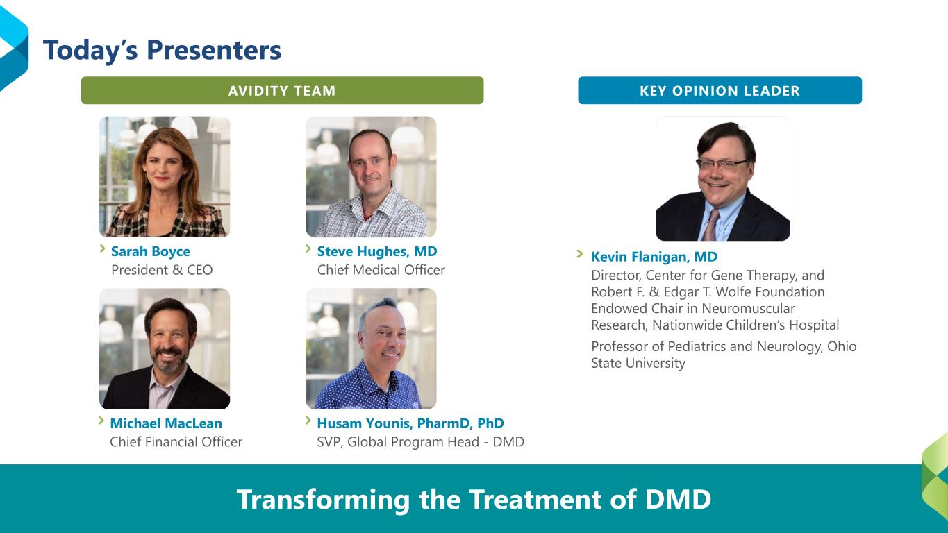 8Transforming the Treatment of DMD Sarah Boyce President & CEO Steve Hughes, MD Chief Medical Officer Michael MacLean Chief Financial Officer Kevin Flanigan, MD Director, Center for Gene Therapy, and Robert F. & Edgar T. Wolfe Foundation Endowed Chair in Neuromuscular Research, Nationwide Children’s Hospital Today’s Presenters AVIDITY TEAM KEY OPINION LEADER Husam Younis, PharmD, PhD SVP, Global Program Head - DMD Professor of Pediatrics and Neurology, Ohio State University