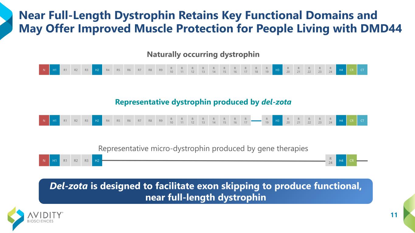 10 DMD is a Relentless Hereditary Disorder Causing Progressive, Debilitating Muscle Damage • Monogenic, X-linked, recessive condition characterized by progressive muscle damage and weakness • Primarily affects males, loss of ambulation by teenage years • Significantly reduces life expectancy • Caused by mutations in the DMD gene, which encodes for the dystrophin protein • ~ 7% of DMD skip-amenable patients have mutations amenable to exon 44 skipping (DMD44) • Del-zota: designed to specifically skip exon 44 of dystrophin gene to enable dystrophin production ~10,000 - 15,000 PEOPLE WITH DMD IN THE US SIMILAR PREVALENCE IN EUROPE DMD Advocates Lee, living with DMD, and Ginne, his mother~900 PEOPLE WITH DMD44 IN THE US