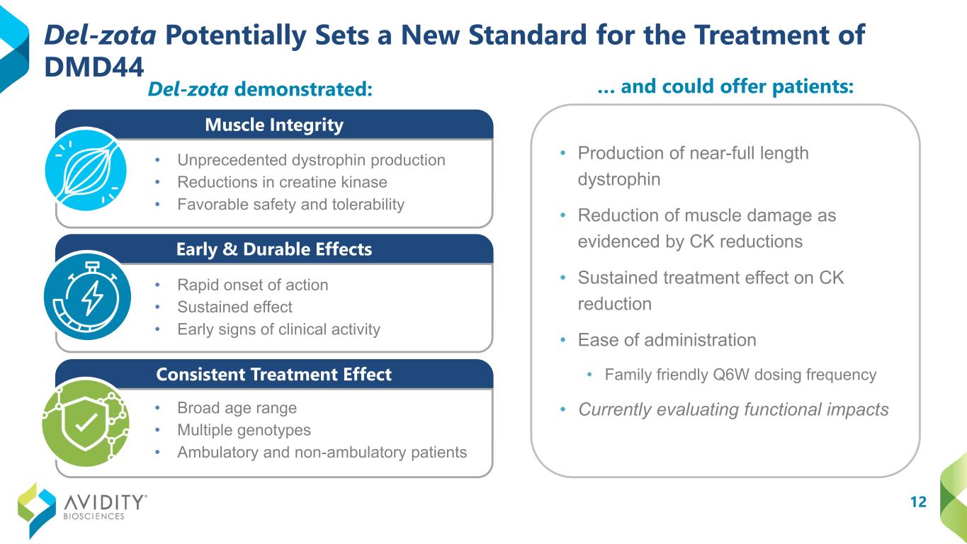 11 Near Full-Length Dystrophin Retains Key Functional Domains and May Offer Improved Muscle Protection for People Living with DMD44 Naturally occurring dystrophin Representative dystrophin produced by del-zota Representative micro-dystrophin produced by gene therapies N H1 R1 R2 R3 H2 R 24 H4 CR N H1 R1 R2 R3 H2 R4 R5 R6 R7 R8 R9 R 10 R 11 R 12 R 13 R 14 R 15 R 16 R 17 R 18 R 19 H3 R 20 R 21 R 22 R 23 R 24 H4 CR CT N H1 R1 R2 R3 H2 R4 R5 R6 R7 R8 R9 R 10 R 11 R 12 R 13 R 14 R 15 R 16 R 17 R 19 H3 R 20 R 21 R 22 R 23 R 24 H4 CR CT Del-zota is designed to facilitate exon skipping to produce functional, near full-length dystrophin