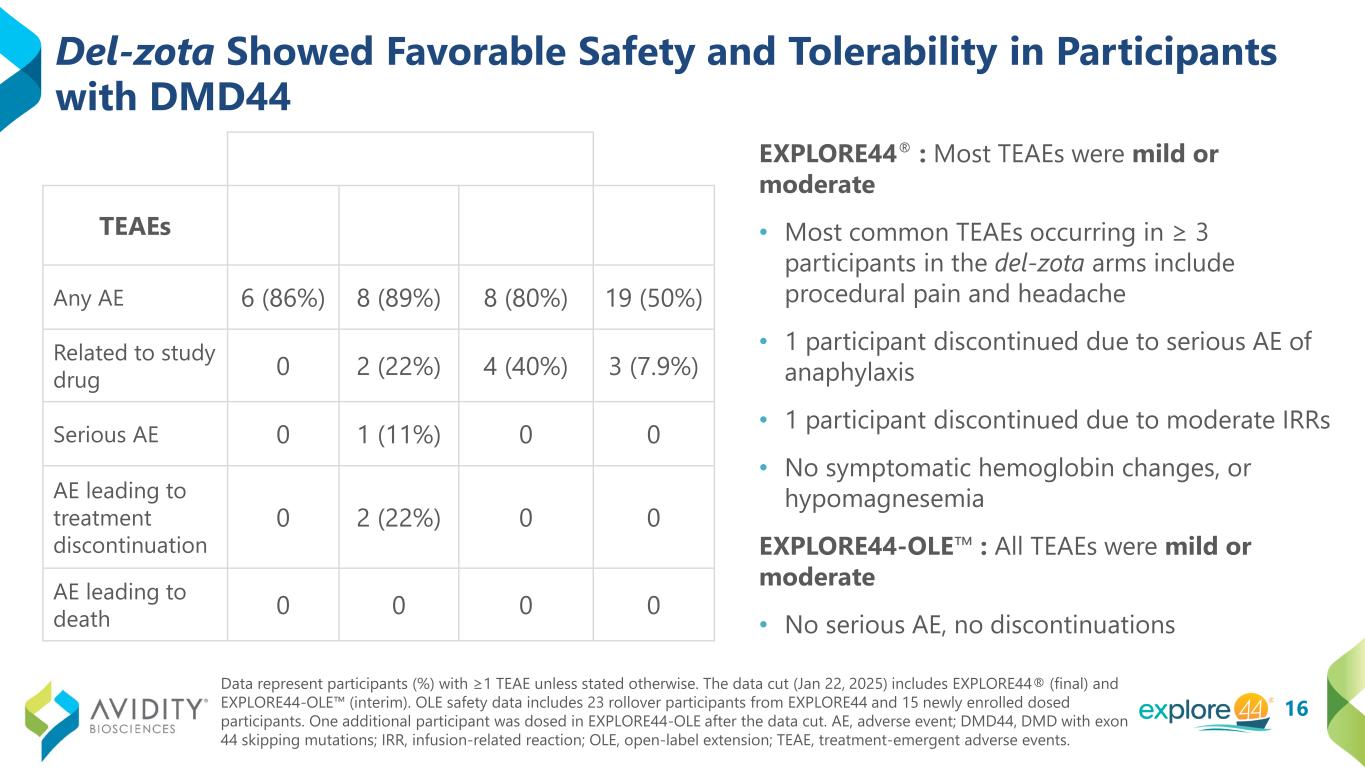 Del-zota demonstrated favorable safety and tolerability results, with most treatment emergent adverse events mild or moderate. Enrollment in the EXPLORE44-OLE study is complete. The Company plans to present functional data from the EXPLORE44-OLE study in the fourth quarter of 2025.