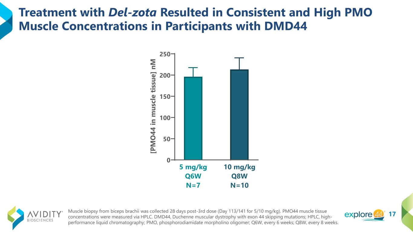 16 Del-zota Showed Favorable Safety and Tolerability in Participants with DMD44 EXPLORE44® : Most TEAEs were mild or moderate • Most common TEAEs occurring in ≥ 3 participants in the del-zota arms include procedural pain and headache • 1 participant discontinued due to serious AE of anaphylaxis • 1 participant discontinued due to moderate IRRs • No symptomatic hemoglobin changes, or hypomagnesemia EXPLORE44-OLE : All TEAEs were mild or moderate • No serious AE, no discontinuations Data represent participants (%) with ≥1 TEAE unless stated otherwise. The data cut (Jan 22, 2025) includes EXPLORE44® (final) and EXPLORE44-OLE (interim). OLE safety data includes 23 rollover participants from EXPLORE44 and 15 newly enrolled dosed participants. One additional participant was dosed in EXPLORE44-OLE after the data cut. AE, adverse event; DMD44, DMD with exon 44 skipping mutations; IRR, infusion-related reaction; OLE, open-label extension; TEAE, treatment-emergent adverse events. EXPLORE44 TEAEs Placebo N=7 5 mg/kg N=9 10 mg/kg N=10 OLE N=38 Any AE 6 (86%) 8 (89%) 8 (80%) 19 (50%) Related to study drug 0 2 (22%) 4 (40%) 3 (7.9%) Serious AE 0 1 (11%) 0 0 AE leading to treatment discontinuation 0 2 (22%) 0 0 AE leading to death 0 0 0 0