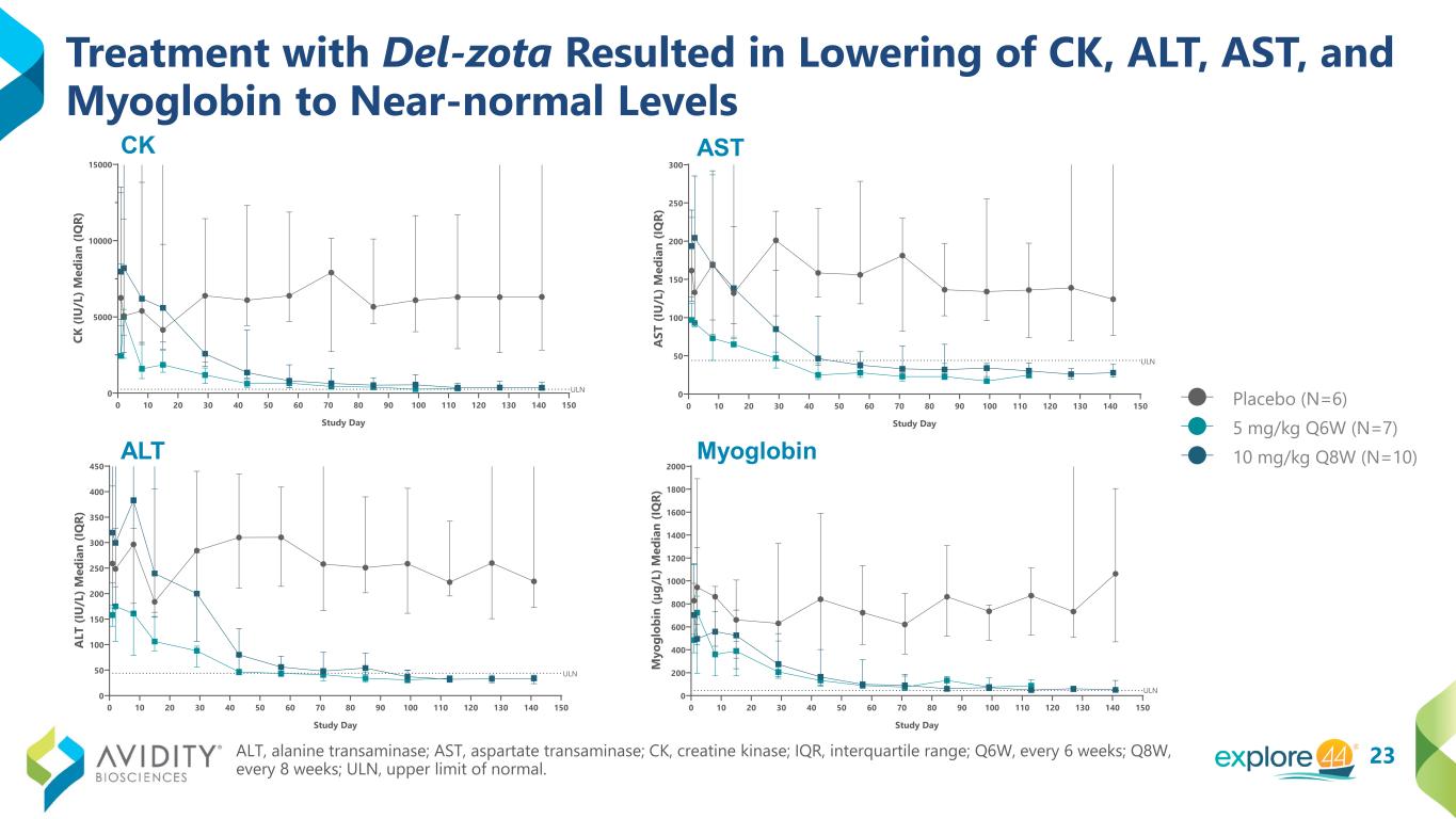 •A reduction in creatine kinase levels to near normal, with greater than 80% reduction compared to baseline, at both the 5 mg/kg and 10 mg/kg dose levels; and