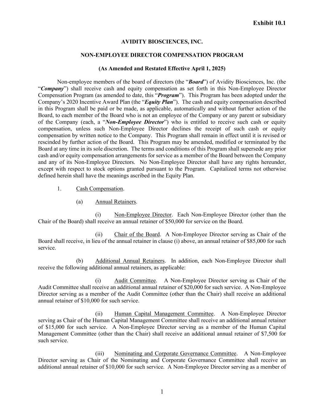 Exhibit 10.1 1 AVIDITY BIOSCIENCES, INC. NON-EMPLOYEE DIRECTOR COMPENSATION PROGRAM (As Amended and Restated Effective April 1, 2025) Non-employee members of the board of directors (the “Board”) of Avidity Biosciences, Inc. (the “Company”) shall receive cash and equity compensation as set forth in this Non-Employee Director Compensation Program (as amended to date, this “Program”). This Program has been adopted under the Company’s 2020 Incentive Award Plan (the “Equity Plan”). The cash and equity compensation described in this Program shall be paid or be made, as applicable, automatically and without further action of the Board, to each member of the Board who is not an employee of the Company or any parent or subsidiary of the Company (each, a “Non-Employee Director”) who is entitled to receive such cash or equity compensation, unless such Non-Employee Director declines the receipt of such cash or equity compensation by written notice to the Company. This Program shall remain in effect until it is revised or rescinded by further action of the Board. This Program may be amended, modified or terminated by the Board at any time in its sole discretion. The terms and conditions of this Program shall supersede any prior cash and/or equity compensation arrangements for service as a member of the Board between the Company and any of its Non-Employee Directors. No Non-Employee Director shall have any rights hereunder, except with respect to stock options granted pursuant to the Program. Capitalized terms not otherwise defined herein shall have the meanings ascribed in the Equity Plan. 1. Cash Compensation. (a) Annual Retainers. (i) Non-Employee Director. Each Non-Employee Director (other than the Chair of the Board) shall receive an annual retainer of $50,000 for service on the Board. (ii) Chair of the Board. A Non-Employee Director serving as Chair of the Board shall receive, in lieu of the annual retainer in clause (i) above, an annual retainer of $85,000 for such service. (b) Additional Annual Retainers. In addition, each Non-Employee Director shall receive the following additional annual retainers, as applicable: (i) Audit Committee. A Non-Employee Director serving as Chair of the Audit Committee shall receive an additional annual retainer of $20,000 for such service. A Non-Employee Director serving as a member of the Audit Committee (other than the Chair) shall receive an additional annual retainer of $10,000 for such service. (ii) Human Capital Management Committee. A Non-Employee Director serving as Chair of the Human Capital Management Committee shall receive an additional annual retainer of $15,000 for such service. A Non-Employee Director serving as a member of the Human Capital Management Committee (other than the Chair) shall receive an additional annual retainer of $7,500 for such service. (iii) Nominating and Corporate Governance Committee. A Non-Employee Director serving as Chair of the Nominating and Corporate Governance Committee shall receive an additional annual retainer of $10,000 for such service. A Non-Employee Director serving as a member of