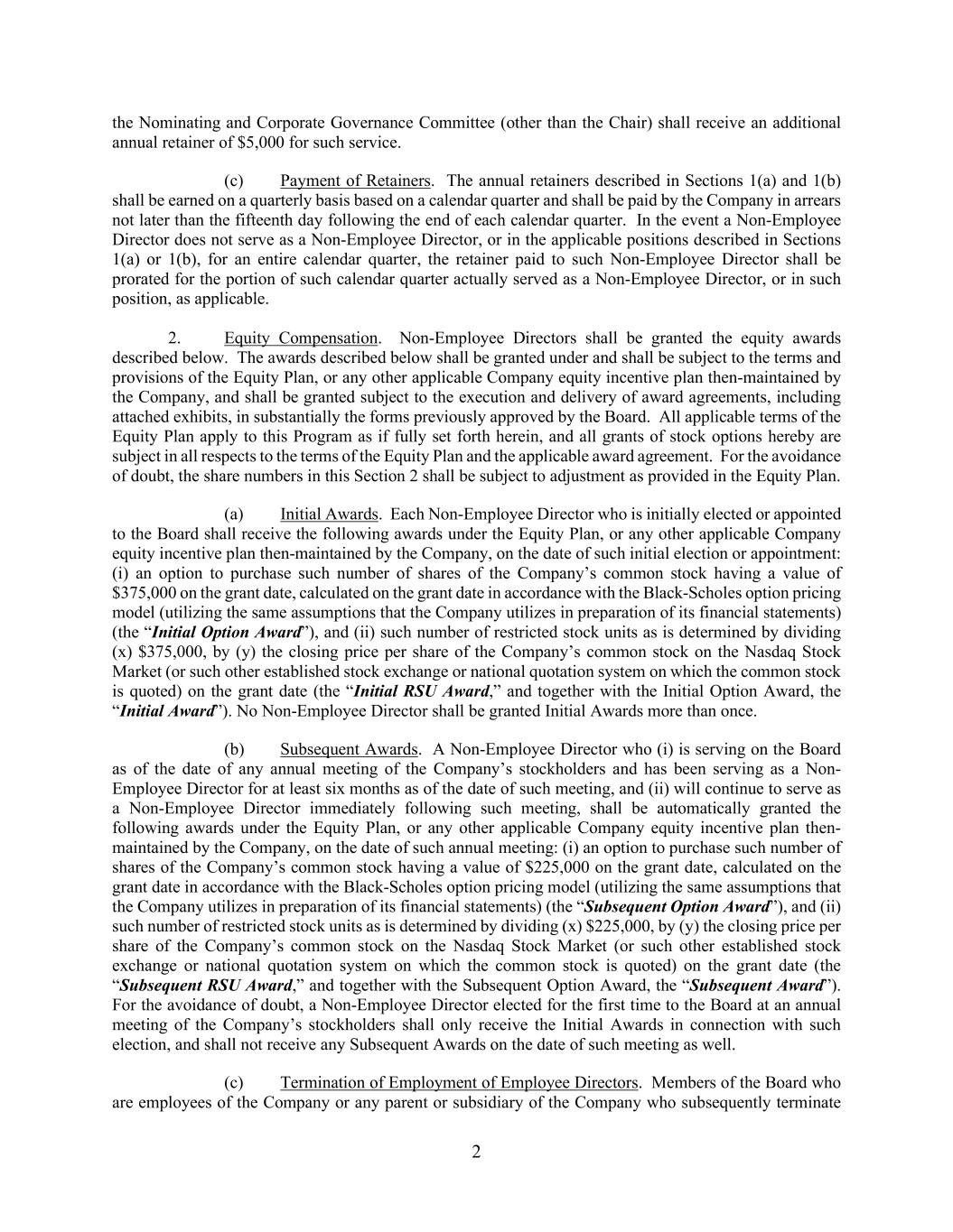 2 the Nominating and Corporate Governance Committee (other than the Chair) shall receive an additional annual retainer of $5,000 for such service. (c) Payment of Retainers. The annual retainers described in Sections 1(a) and 1(b) shall be earned on a quarterly basis based on a calendar quarter and shall be paid by the Company in arrears not later than the fifteenth day following the end of each calendar quarter. In the event a Non-Employee Director does not serve as a Non-Employee Director, or in the applicable positions described in Sections 1(a) or 1(b), for an entire calendar quarter, the retainer paid to such Non-Employee Director shall be prorated for the portion of such calendar quarter actually served as a Non-Employee Director, or in such position, as applicable. 2. Equity Compensation. Non-Employee Directors shall be granted the equity awards described below. The awards described below shall be granted under and shall be subject to the terms and provisions of the Equity Plan, or any other applicable Company equity incentive plan then-maintained by the Company, and shall be granted subject to the execution and delivery of award agreements, including attached exhibits, in substantially the forms previously approved by the Board. All applicable terms of the Equity Plan apply to this Program as if fully set forth herein, and all grants of stock options hereby are subject in all respects to the terms of the Equity Plan and the applicable award agreement. For the avoidance of doubt, the share numbers in this Section 2 shall be subject to adjustment as provided in the Equity Plan. (a) Initial Awards. Each Non-Employee Director who is initially elected or appointed to the Board shall receive the following awards under the Equity Plan, or any other applicable Company equity incentive plan then-maintained by the Company, on the date of such initial election or appointment: (i) an option to purchase such number of shares of the Company’s common stock having a value of $375,000 on the grant date, calculated on the grant date in accordance with the Black-Scholes option pricing model (utilizing the same assumptions that the Company utilizes in preparation of its financial statements) (the “Initial Option Award”), and (ii) such number of restricted stock units as is determined by dividing (x) $375,000, by (y) the closing price per share of the Company’s common stock on the Nasdaq Stock Market (or such other established stock exchange or national quotation system on which the common stock is quoted) on the grant date (the “Initial RSU Award,” and together with the Initial Option Award, the “Initial Award”). No Non-Employee Director shall be granted Initial Awards more than once. (b) Subsequent Awards. A Non-Employee Director who (i) is serving on the Board as of the date of any annual meeting of the Company’s stockholders and has been serving as a Non- Employee Director for at least six months as of the date of such meeting, and (ii) will continue to serve as a Non-Employee Director immediately following such meeting, shall be automatically granted the following awards under the Equity Plan, or any other applicable Company equity incentive plan then- maintained by the Company, on the date of such annual meeting: (i) an option to purchase such number of shares of the Company’s common stock having a value of $225,000 on the grant date, calculated on the grant date in accordance with the Black-Scholes option pricing model (utilizing the same assumptions that the Company utilizes in preparation of its financial statements) (the “Subsequent Option Award”), and (ii) such number of restricted stock units as is determined by dividing (x) $225,000, by (y) the closing price per share of the Company’s common stock on the Nasdaq Stock Market (or such other established stock exchange or national quotation system on which the common stock is quoted) on the grant date (the “Subsequent RSU Award,” and together with the Subsequent Option Award, the “Subsequent Award”). For the avoidance of doubt, a Non-Employee Director elected for the first time to the Board at an annual meeting of the Company’s stockholders shall only receive the Initial Awards in connection with such election, and shall not receive any Subsequent Awards on the date of such meeting as well. (c) Termination of Employment of Employee Directors. Members of the Board who are employees of the Company or any parent or subsidiary of the Company who subsequently terminate