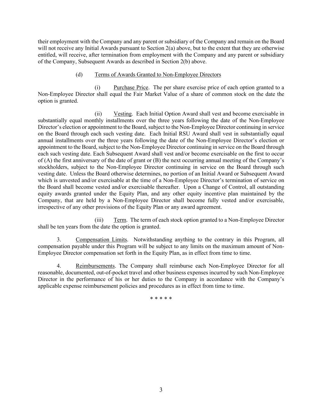 3 their employment with the Company and any parent or subsidiary of the Company and remain on the Board will not receive any Initial Awards pursuant to Section 2(a) above, but to the extent that they are otherwise entitled, will receive, after termination from employment with the Company and any parent or subsidiary of the Company, Subsequent Awards as described in Section 2(b) above. (d) Terms of Awards Granted to Non-Employee Directors (i) Purchase Price. The per share exercise price of each option granted to a Non-Employee Director shall equal the Fair Market Value of a share of common stock on the date the option is granted. (ii) Vesting. Each Initial Option Award shall vest and become exercisable in substantially equal monthly installments over the three years following the date of the Non-Employee Director’s election or appointment to the Board, subject to the Non-Employee Director continuing in service on the Board through each such vesting date. Each Initial RSU Award shall vest in substantially equal annual installments over the three years following the date of the Non-Employee Director’s election or appointment to the Board, subject to the Non-Employee Director continuing in service on the Board through each such vesting date. Each Subsequent Award shall vest and/or become exercisable on the first to occur of (A) the first anniversary of the date of grant or (B) the next occurring annual meeting of the Company’s stockholders, subject to the Non-Employee Director continuing in service on the Board through such vesting date. Unless the Board otherwise determines, no portion of an Initial Award or Subsequent Award which is unvested and/or exercisable at the time of a Non-Employee Director’s termination of service on the Board shall become vested and/or exercisable thereafter. Upon a Change of Control, all outstanding equity awards granted under the Equity Plan, and any other equity incentive plan maintained by the Company, that are held by a Non-Employee Director shall become fully vested and/or exercisable, irrespective of any other provisions of the Equity Plan or any award agreement. (iii) Term. The term of each stock option granted to a Non-Employee Director shall be ten years from the date the option is granted. 3. Compensation Limits. Notwithstanding anything to the contrary in this Program, all compensation payable under this Program will be subject to any limits on the maximum amount of Non- Employee Director compensation set forth in the Equity Plan, as in effect from time to time. 4. Reimbursements. The Company shall reimburse each Non-Employee Director for all reasonable, documented, out-of-pocket travel and other business expenses incurred by such Non-Employee Director in the performance of his or her duties to the Company in accordance with the Company’s applicable expense reimbursement policies and procedures as in effect from time to time. * * * * *