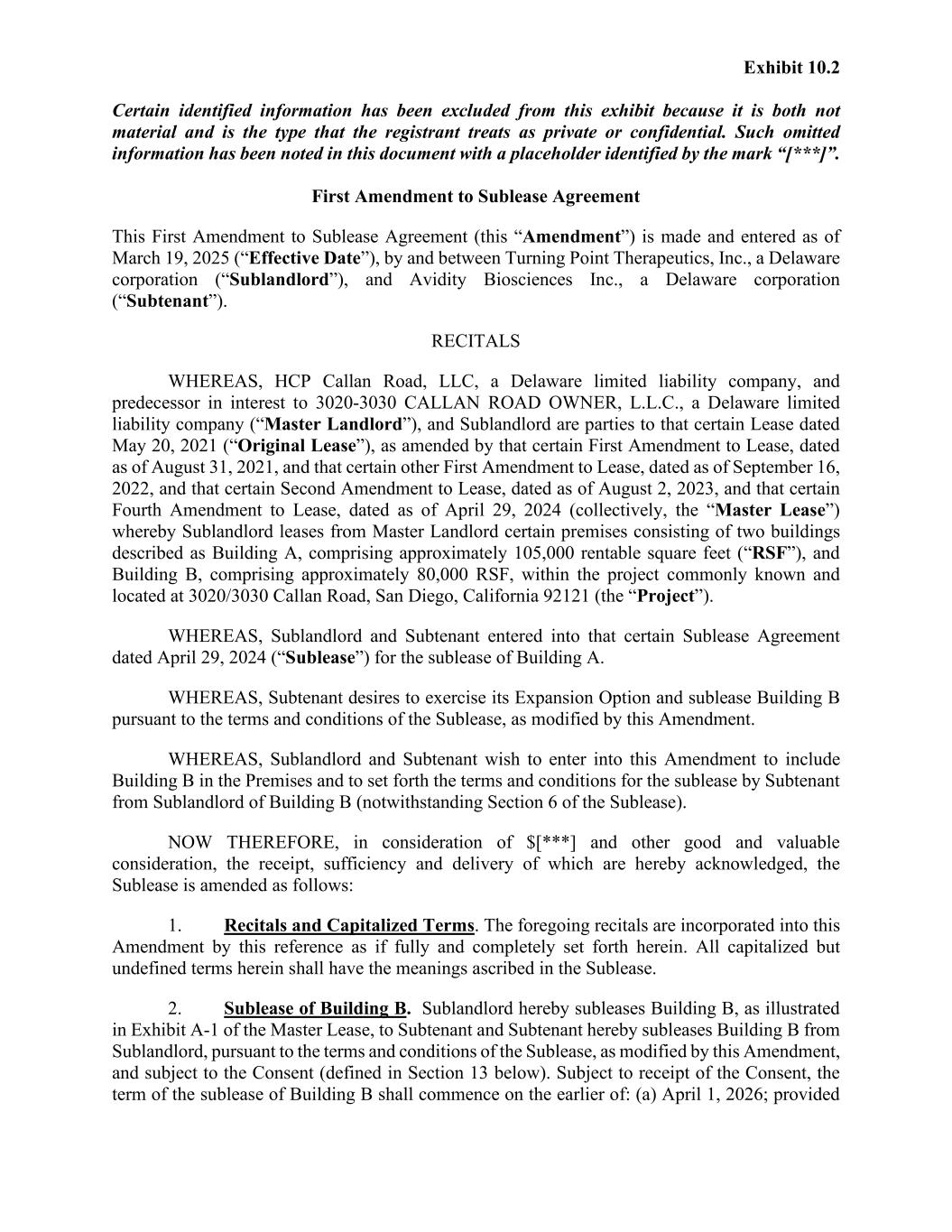 Exhibit 10.2 Certain identified information has been excluded from this exhibit because it is both not material and is the type that the registrant treats as private or confidential. Such omitted information has been noted in this document with a placeholder identified by the mark “[***]”. First Amendment to Sublease Agreement This First Amendment to Sublease Agreement (this “Amendment”) is made and entered as of March 19, 2025 (“Effective Date”), by and between Turning Point Therapeutics, Inc., a Delaware corporation (“Sublandlord”), and Avidity Biosciences Inc., a Delaware corporation (“Subtenant”). RECITALS WHEREAS, HCP Callan Road, LLC, a Delaware limited liability company, and predecessor in interest to 3020-3030 CALLAN ROAD OWNER, L.L.C., a Delaware limited liability company (“Master Landlord”), and Sublandlord are parties to that certain Lease dated May 20, 2021 (“Original Lease”), as amended by that certain First Amendment to Lease, dated as of August 31, 2021, and that certain other First Amendment to Lease, dated as of September 16, 2022, and that certain Second Amendment to Lease, dated as of August 2, 2023, and that certain Fourth Amendment to Lease, dated as of April 29, 2024 (collectively, the “Master Lease”) whereby Sublandlord leases from Master Landlord certain premises consisting of two buildings described as Building A, comprising approximately 105,000 rentable square feet (“RSF”), and Building B, comprising approximately 80,000 RSF, within the project commonly known and located at 3020/3030 Callan Road, San Diego, California 92121 (the “Project”). WHEREAS, Sublandlord and Subtenant entered into that certain Sublease Agreement dated April 29, 2024 (“Sublease”) for the sublease of Building A. WHEREAS, Subtenant desires to exercise its Expansion Option and sublease Building B pursuant to the terms and conditions of the Sublease, as modified by this Amendment. WHEREAS, Sublandlord and Subtenant wish to enter into this Amendment to include Building B in the Premises and to set forth the terms and conditions for the sublease by Subtenant from Sublandlord of Building B (notwithstanding Section 6 of the Sublease). NOW THEREFORE, in consideration of $[***] and other good and valuable consideration, the receipt, sufficiency and delivery of which are hereby acknowledged, the Sublease is amended as follows: 1. Recitals and Capitalized Terms. The foregoing recitals are incorporated into this Amendment by this reference as if fully and completely set forth herein. All capitalized but undefined terms herein shall have the meanings ascribed in the Sublease. 2. Sublease of Building B. Sublandlord hereby subleases Building B, as illustrated in Exhibit A-1 of the Master Lease, to Subtenant and Subtenant hereby subleases Building B from Sublandlord, pursuant to the terms and conditions of the Sublease, as modified by this Amendment, and subject to the Consent (defined in Section 13 below). Subject to receipt of the Consent, the term of the sublease of Building B shall commence on the earlier of: (a) April 1, 2026; provided
