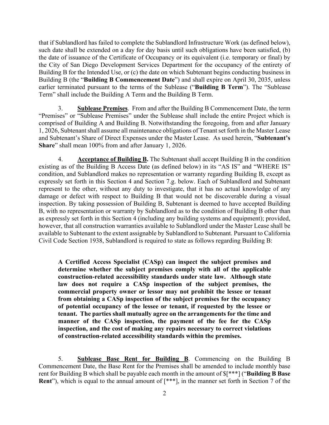2 that if Sublandlord has failed to complete the Sublandlord Infrastructure Work (as defined below), such date shall be extended on a day for day basis until such obligations have been satisfied, (b) the date of issuance of the Certificate of Occupancy or its equivalent (i.e. temporary or final) by the City of San Diego Development Services Department for the occupancy of the entirety of Building B for the Intended Use, or (c) the date on which Subtenant begins conducting business in Building B (the “Building B Commencement Date”) and shall expire on April 30, 2035, unless earlier terminated pursuant to the terms of the Sublease (“Building B Term”). The “Sublease Term” shall include the Building A Term and the Building B Term. 3. Sublease Premises. From and after the Building B Commencement Date, the term “Premises” or “Sublease Premises” under the Sublease shall include the entire Project which is comprised of Building A and Building B. Notwithstanding the foregoing, from and after January 1, 2026, Subtenant shall assume all maintenance obligations of Tenant set forth in the Master Lease and Subtenant’s Share of Direct Expenses under the Master Lease. As used herein, “Subtenant’s Share” shall mean 100% from and after January 1, 2026. 4. Acceptance of Building B. The Subtenant shall accept Building B in the condition existing as of the Building B Access Date (as defined below) in its “AS IS” and “WHERE IS” condition, and Sublandlord makes no representation or warranty regarding Building B, except as expressly set forth in this Section 4 and Section 7.g. below. Each of Sublandlord and Subtenant represent to the other, without any duty to investigate, that it has no actual knowledge of any damage or defect with respect to Building B that would not be discoverable during a visual inspection. By taking possession of Building B, Subtenant is deemed to have accepted Building B, with no representation or warranty by Sublandlord as to the condition of Building B other than as expressly set forth in this Section 4 (including any building systems and equipment); provided, however, that all construction warranties available to Sublandlord under the Master Lease shall be available to Subtenant to the extent assignable by Sublandlord to Subtenant. Pursuant to California Civil Code Section 1938, Sublandlord is required to state as follows regarding Building B: A Certified Access Specialist (CASp) can inspect the subject premises and determine whether the subject premises comply with all of the applicable construction-related accessibility standards under state law. Although state law does not require a CASp inspection of the subject premises, the commercial property owner or lessor may not prohibit the lessee or tenant from obtaining a CASp inspection of the subject premises for the occupancy of potential occupancy of the lessee or tenant, if requested by the lessee or tenant. The parties shall mutually agree on the arrangements for the time and manner of the CASp inspection, the payment of the fee for the CASp inspection, and the cost of making any repairs necessary to correct violations of construction-related accessibility standards within the premises. 5. Sublease Base Rent for Building B. Commencing on the Building B Commencement Date, the Base Rent for the Premises shall be amended to include monthly base rent for Building B which shall be payable each month in the amount of $[***] (“Building B Base Rent”), which is equal to the annual amount of [***], in the manner set forth in Section 7 of the