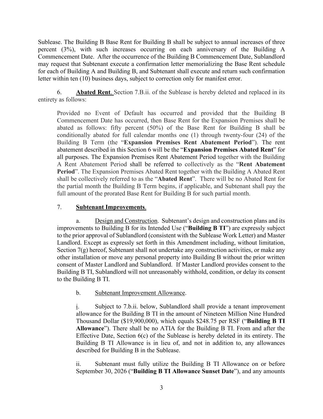 3 Sublease. The Building B Base Rent for Building B shall be subject to annual increases of three percent (3%), with such increases occurring on each anniversary of the Building A Commencement Date. After the occurrence of the Building B Commencement Date, Sublandlord may request that Subtenant execute a confirmation letter memorializing the Base Rent schedule for each of Building A and Building B, and Subtenant shall execute and return such confirmation letter within ten (10) business days, subject to correction only for manifest error. 6. Abated Rent. Section 7.B.ii. of the Sublease is hereby deleted and replaced in its entirety as follows: Provided no Event of Default has occurred and provided that the Building B Commencement Date has occurred, then Base Rent for the Expansion Premises shall be abated as follows: fifty percent (50%) of the Base Rent for Building B shall be conditionally abated for full calendar months one (1) through twenty-four (24) of the Building B Term (the “Expansion Premises Rent Abatement Period”). The rent abatement described in this Section 6 will be the “Expansion Premises Abated Rent” for all purposes. The Expansion Premises Rent Abatement Period together with the Building A Rent Abatement Period shall be referred to collectively as the “Rent Abatement Period”. The Expansion Premises Abated Rent together with the Building A Abated Rent shall be collectively referred to as the “Abated Rent”. There will be no Abated Rent for the partial month the Building B Term begins, if applicable, and Subtenant shall pay the full amount of the prorated Base Rent for Building B for such partial month. 7. Subtenant Improvements. a. Design and Construction. Subtenant’s design and construction plans and its improvements to Building B for its Intended Use (“Building B TI”) are expressly subject to the prior approval of Sublandlord (consistent with the Sublease Work Letter) and Master Landlord. Except as expressly set forth in this Amendment including, without limitation, Section 7(g) hereof, Subtenant shall not undertake any construction activities, or make any other installation or move any personal property into Building B without the prior written consent of Master Landlord and Sublandlord. If Master Landlord provides consent to the Building B TI, Sublandlord will not unreasonably withhold, condition, or delay its consent to the Building B TI. b. Subtenant Improvement Allowance. i. Subject to 7.b.ii. below, Sublandlord shall provide a tenant improvement allowance for the Building B TI in the amount of Nineteen Million Nine Hundred Thousand Dollar ($19,900,000), which equals $248.75 per RSF (“Building B TI Allowance”). There shall be no ATIA for the Building B TI. From and after the Effective Date, Section 6(c) of the Sublease is hereby deleted in its entirety. The Building B TI Allowance is in lieu of, and not in addition to, any allowances described for Building B in the Sublease. ii. Subtenant must fully utilize the Building B TI Allowance on or before September 30, 2026 (“Building B TI Allowance Sunset Date”), and any amounts