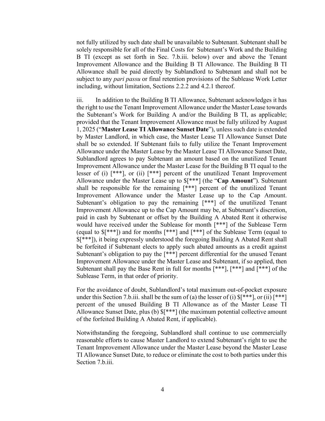 4 not fully utilized by such date shall be unavailable to Subtenant. Subtenant shall be solely responsible for all of the Final Costs for Subtenant’s Work and the Building B TI (except as set forth in Sec. 7.b.iii. below) over and above the Tenant Improvement Allowance and the Building B TI Allowance. The Building B TI Allowance shall be paid directly by Sublandlord to Subtenant and shall not be subject to any pari passu or final retention provisions of the Sublease Work Letter including, without limitation, Sections 2.2.2 and 4.2.1 thereof. iii. In addition to the Building B TI Allowance, Subtenant acknowledges it has the right to use the Tenant Improvement Allowance under the Master Lease towards the Subtenant’s Work for Building A and/or the Building B TI, as applicable; provided that the Tenant Improvement Allowance must be fully utilized by August 1, 2025 (“Master Lease TI Allowance Sunset Date”), unless such date is extended by Master Landlord, in which case, the Master Lease TI Allowance Sunset Date shall be so extended. If Subtenant fails to fully utilize the Tenant Improvement Allowance under the Master Lease by the Master Lease TI Allowance Sunset Date, Sublandlord agrees to pay Subtenant an amount based on the unutilized Tenant Improvement Allowance under the Master Lease for the Building B TI equal to the lesser of (i) [***], or (ii) [***] percent of the unutilized Tenant Improvement Allowance under the Master Lease up to $[***] (the “Cap Amount”). Subtenant shall be responsible for the remaining [***] percent of the unutilized Tenant Improvement Allowance under the Master Lease up to the Cap Amount. Subtenant’s obligation to pay the remaining [***] of the unutilized Tenant Improvement Allowance up to the Cap Amount may be, at Subtenant’s discretion, paid in cash by Subtenant or offset by the Building A Abated Rent it otherwise would have received under the Sublease for month [***] of the Sublease Term (equal to $[***]) and for months [***] and [***] of the Sublease Term (equal to $[***]), it being expressly understood the foregoing Building A Abated Rent shall be forfeited if Subtenant elects to apply such abated amounts as a credit against Subtenant’s obligation to pay the [***] percent differential for the unused Tenant Improvement Allowance under the Master Lease and Subtenant, if so applied, then Subtenant shall pay the Base Rent in full for months [***], [***] and [***] of the Sublease Term, in that order of priority. For the avoidance of doubt, Sublandlord’s total maximum out-of-pocket exposure under this Section 7.b.iii. shall be the sum of (a) the lesser of (i) $[***], or (ii) [***] percent of the unused Building B TI Allowance as of the Master Lease TI Allowance Sunset Date, plus (b) $[***] (the maximum potential collective amount of the forfeited Building A Abated Rent, if applicable). Notwithstanding the foregoing, Sublandlord shall continue to use commercially reasonable efforts to cause Master Landlord to extend Subtenant’s right to use the Tenant Improvement Allowance under the Master Lease beyond the Master Lease TI Allowance Sunset Date, to reduce or eliminate the cost to both parties under this Section 7.b.iii.