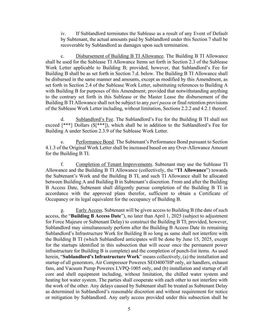 5 iv. If Sublandlord terminates the Sublease as a result of any Event of Default by Subtenant, the actual amounts paid by Sublandlord under this Section 7 shall be recoverable by Sublandlord as damages upon such termination. c. Disbursement of Building B TI Allowance. The Building B TI Allowance shall be used for the Sublease TI Allowance Items set forth in Section 2.3 of the Sublease Work Letter applicable to Building B; provided, however, that Sublandlord’s Fee for Building B shall be as set forth in Section 7.d. below. The Building B TI Allowance shall be disbursed in the same manner and amounts, except as modified by this Amendment, as set forth in Section 2.4 of the Sublease Work Letter, substituting references to Building A with Building B for purposes of this Amendment; provided that notwithstanding anything to the contrary set forth in this Sublease or the Master Lease the disbursement of the Building B TI Allowance shall not be subject to any pari passu or final retention provisions of the Sublease Work Letter including, without limitation, Sections 2.2.2 and 4.2.1 thereof. d. Sublandlord’s Fee. The Sublandlord’s Fee for the Building B TI shall not exceed [***] Dollars ($[***]), which shall be in addition to the Sublandlord’s Fee for Building A under Section 2.3.9 of the Sublease Work Letter. e. Performance Bond. The Subtenant’s Performance Bond pursuant to Section 4.1.3 of the Original Work Letter shall be increased based on any Over-Allowance Amount for the Building B TI. f. Completion of Tenant Improvements. Subtenant may use the Sublease TI Allowance and the Building B TI Allowance (collectively, the “TI Allowance”) towards the Subtenant’s Work and the Building B TI, and such TI Allowance shall be allocated between Building A and Building B in Subtenant’s discretion. From and after the Building B Access Date, Subtenant shall diligently pursue completion of the Building B TI in accordance with the approved plans therefor, sufficient to obtain a Certificate of Occupancy or its legal equivalent for the occupancy of Building B. g. Early Access. Subtenant will be given access to Building B (the date of such access, the “Building B Access Date”), no later than April 1, 2025 (subject to adjustment for Force Majeure or Subtenant Delay) to construct the Building B TI; provided, however, Sublandlord may simultaneously perform after the Building B Access Date its remaining Sublandlord’s Infrastructure Work for Building B so long as same shall not interfere with the Building B TI (which Sublandlord anticipates will be done by June 15, 2025, except for the startups identified in this subsection that will occur once the permanent power infrastructure for Building B is complete) and the completion of punch-list items. As used herein, “Sublandlord’s Infrastructure Work” means collectively, (a) the installation and startup of all generators, Air Compressor Powerex SEO4007HP only, air handlers, exhaust fans, and Vacuum Pump Powerex LVPQ-1005 only, and (b) installation and startup of all core and shell equipment including, without limitation, the chilled water system and heating hot water system. The parties shall cooperate with each other to not interfere with the work of the other. Any delays caused by Subtenant shall be treated as Subtenant Delay as determined in Sublandlord’s reasonable discretion and without requirement for notice or mitigation by Sublandlord. Any early access provided under this subsection shall be