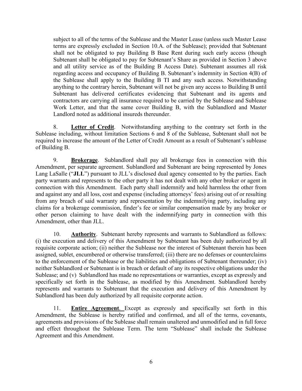 6 subject to all of the terms of the Sublease and the Master Lease (unless such Master Lease terms are expressly excluded in Section 10.A. of the Sublease); provided that Subtenant shall not be obligated to pay Building B Base Rent during such early access (though Subtenant shall be obligated to pay for Subtenant’s Share as provided in Section 3 above and all utility service as of the Building B Access Date). Subtenant assumes all risk regarding access and occupancy of Building B. Subtenant’s indemnity in Section 4(B) of the Sublease shall apply to the Building B TI and any such access. Notwithstanding anything to the contrary herein, Subtenant will not be given any access to Building B until Subtenant has delivered certificates evidencing that Subtenant and its agents and contractors are carrying all insurance required to be carried by the Sublease and Sublease Work Letter, and that the same cover Building B, with the Sublandlord and Master Landlord noted as additional insureds thereunder. 8. Letter of Credit. Notwithstanding anything to the contrary set forth in the Sublease including, without limitation Sections 6 and 8 of the Sublease, Subtenant shall not be required to increase the amount of the Letter of Credit Amount as a result of Subtenant’s sublease of Building B. 9. Brokerage. Sublandlord shall pay all brokerage fees in connection with this Amendment, per separate agreement. Sublandlord and Subtenant are being represented by Jones Lang LaSalle (“JLL”) pursuant to JLL’s disclosed dual agency consented to by the parties. Each party warrants and represents to the other party it has not dealt with any other broker or agent in connection with this Amendment. Each party shall indemnify and hold harmless the other from and against any and all loss, cost and expense (including attorneys’ fees) arising out of or resulting from any breach of said warranty and representation by the indemnifying party, including any claims for a brokerage commission, finder’s fee or similar compensation made by any broker or other person claiming to have dealt with the indemnifying party in connection with this Amendment, other than JLL. 10. Authority. Subtenant hereby represents and warrants to Sublandlord as follows: (i) the execution and delivery of this Amendment by Subtenant has been duly authorized by all requisite corporate action; (ii) neither the Sublease nor the interest of Subtenant therein has been assigned, sublet, encumbered or otherwise transferred; (iii) there are no defenses or counterclaims to the enforcement of the Sublease or the liabilities and obligations of Subtenant thereunder; (iv) neither Sublandlord or Subtenant is in breach or default of any its respective obligations under the Sublease; and (v) Sublandlord has made no representations or warranties, except as expressly and specifically set forth in the Sublease, as modified by this Amendment. Sublandlord hereby represents and warrants to Subtenant that the execution and delivery of this Amendment by Sublandlord has been duly authorized by all requisite corporate action. 11. Entire Agreement. Except as expressly and specifically set forth in this Amendment, the Sublease is hereby ratified and confirmed, and all of the terms, covenants, agreements and provisions of the Sublease shall remain unaltered and unmodified and in full force and effect throughout the Sublease Term. The term “Sublease” shall include the Sublease Agreement and this Amendment.