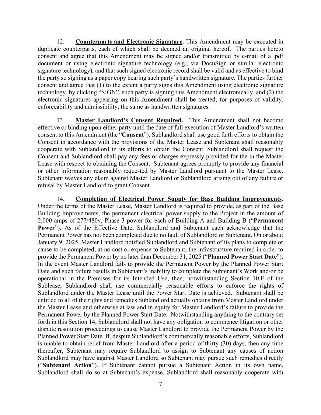 7 12. Counterparts and Electronic Signature. This Amendment may be executed in duplicate counterparts, each of which shall be deemed an original hereof. The parties hereto consent and agree that this Amendment may be signed and/or transmitted by e-mail of a .pdf document or using electronic signature technology (e.g., via DocuSign or similar electronic signature technology), and that such signed electronic record shall be valid and as effective to bind the party so signing as a paper copy bearing such party’s handwritten signature. The parties further consent and agree that (1) to the extent a party signs this Amendment using electronic signature technology, by clicking “SIGN”, such party is signing this Amendment electronically, and (2) the electronic signatures appearing on this Amendment shall be treated, for purposes of validity, enforceability and admissibility, the same as handwritten signatures. 13. Master Landlord’s Consent Required. This Amendment shall not become effective or binding upon either party until the date of full execution of Master Landlord’s written consent to this Amendment (the “Consent”). Sublandlord shall use good faith efforts to obtain the Consent in accordance with the provisions of the Master Lease and Subtenant shall reasonably cooperate with Sublandlord in its efforts to obtain the Consent. Sublandlord shall request the Consent and Sublandlord shall pay any fees or charges expressly provided for the in the Master Lease with respect to obtaining the Consent. Subtenant agrees promptly to provide any financial or other information reasonably requested by Master Landlord pursuant to the Master Lease. Subtenant waives any claim against Master Landlord or Sublandlord arising out of any failure or refusal by Master Landlord to grant Consent. 14. Completion of Electrical Power Supply for Base Building Improvements. Under the terms of the Master Lease, Master Landlord is required to provide, as part of the Base Building Improvements, the permanent electrical power supply to the Project in the amount of 2,000 amps of 277/480v, Phase 3 power for each of Building A and Building B (“Permanent Power”). As of the Effective Date, Sublandlord and Subtenant each acknowledge that the Permanent Power has not been completed due to no fault of Sublandlord or Subtenant. On or about January 9, 2025, Master Landlord notified Sublandlord and Subtenant of its plans to complete or cause to be completed, at no cost or expense to Subtenant, the infrastructure required in order to provide the Permanent Power by no later than December 31, 2025 (“Planned Power Start Date”). In the event Master Landlord fails to provide the Permanent Power by the Planned Power Start Date and such failure results in Subtenant’s inability to complete the Subtenant’s Work and/or be operational in the Premises for its Intended Use, then, notwithstanding Section 10.E of the Sublease, Sublandlord shall use commercially reasonable efforts to enforce the rights of Sublandlord under the Master Lease until the Power Start Date is achieved. Subtenant shall be entitled to all of the rights and remedies Sublandlord actually obtains from Master Landlord under the Master Lease and otherwise at law and in equity for Master Landlord’s failure to provide the Permanent Power by the Planned Power Start Date. Notwithstanding anything to the contrary set forth in this Section 14, Sublandlord shall not have any obligation to commence litigation or other dispute resolution proceedings to cause Master Landlord to provide the Permanent Power by the Planned Power Start Date. If, despite Sublandlord’s commercially reasonable efforts, Sublandlord is unable to obtain relief from Master Landlord after a period of thirty (30) days, then any time thereafter, Subtenant may require Sublandlord to assign to Subtenant any causes of action Sublandlord may have against Master Landlord so Subtenant may pursue such remedies directly (“Subtenant Action”). If Subtenant cannot pursue a Subtenant Action in its own name, Sublandlord shall do so at Subtenant’s expense. Sublandlord shall reasonably cooperate with