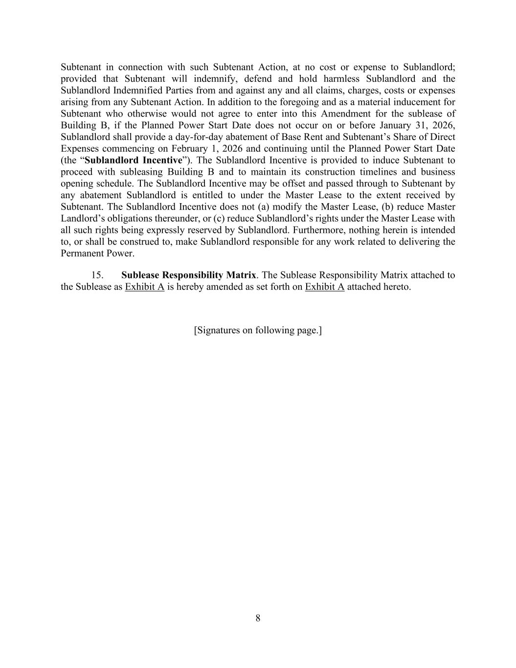 8 Subtenant in connection with such Subtenant Action, at no cost or expense to Sublandlord; provided that Subtenant will indemnify, defend and hold harmless Sublandlord and the Sublandlord Indemnified Parties from and against any and all claims, charges, costs or expenses arising from any Subtenant Action. In addition to the foregoing and as a material inducement for Subtenant who otherwise would not agree to enter into this Amendment for the sublease of Building B, if the Planned Power Start Date does not occur on or before January 31, 2026, Sublandlord shall provide a day-for-day abatement of Base Rent and Subtenant’s Share of Direct Expenses commencing on February 1, 2026 and continuing until the Planned Power Start Date (the “Sublandlord Incentive”). The Sublandlord Incentive is provided to induce Subtenant to proceed with subleasing Building B and to maintain its construction timelines and business opening schedule. The Sublandlord Incentive may be offset and passed through to Subtenant by any abatement Sublandlord is entitled to under the Master Lease to the extent received by Subtenant. The Sublandlord Incentive does not (a) modify the Master Lease, (b) reduce Master Landlord’s obligations thereunder, or (c) reduce Sublandlord’s rights under the Master Lease with all such rights being expressly reserved by Sublandlord. Furthermore, nothing herein is intended to, or shall be construed to, make Sublandlord responsible for any work related to delivering the Permanent Power. 15. Sublease Responsibility Matrix. The Sublease Responsibility Matrix attached to the Sublease as Exhibit A is hereby amended as set forth on Exhibit A attached hereto. [Signatures on following page.]