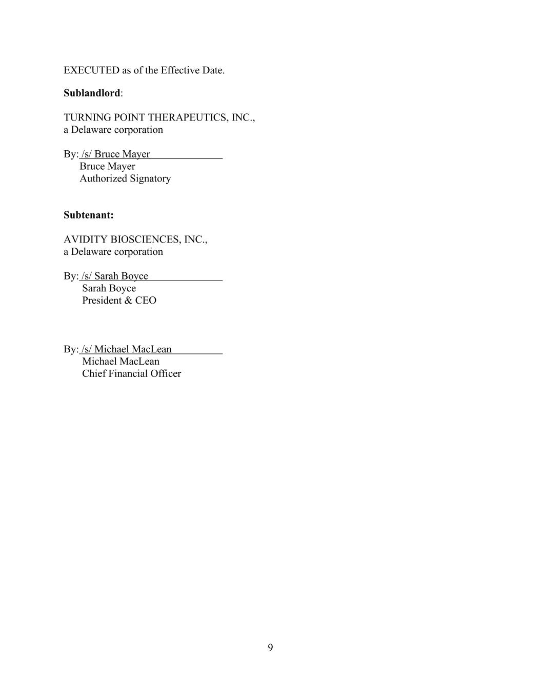 9 EXECUTED as of the Effective Date. Sublandlord: TURNING POINT THERAPEUTICS, INC., a Delaware corporation By: /s/ Bruce Mayer Bruce Mayer Authorized Signatory Subtenant: AVIDITY BIOSCIENCES, INC., a Delaware corporation By: /s/ Sarah Boyce Sarah Boyce President & CEO By: /s/ Michael MacLean Michael MacLean Chief Financial Officer