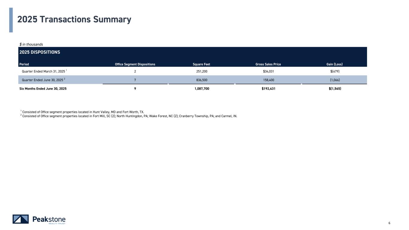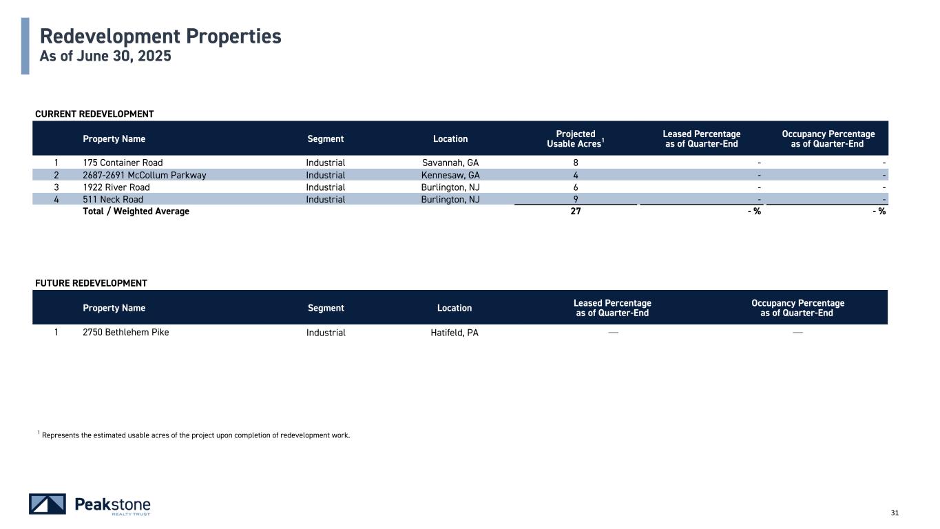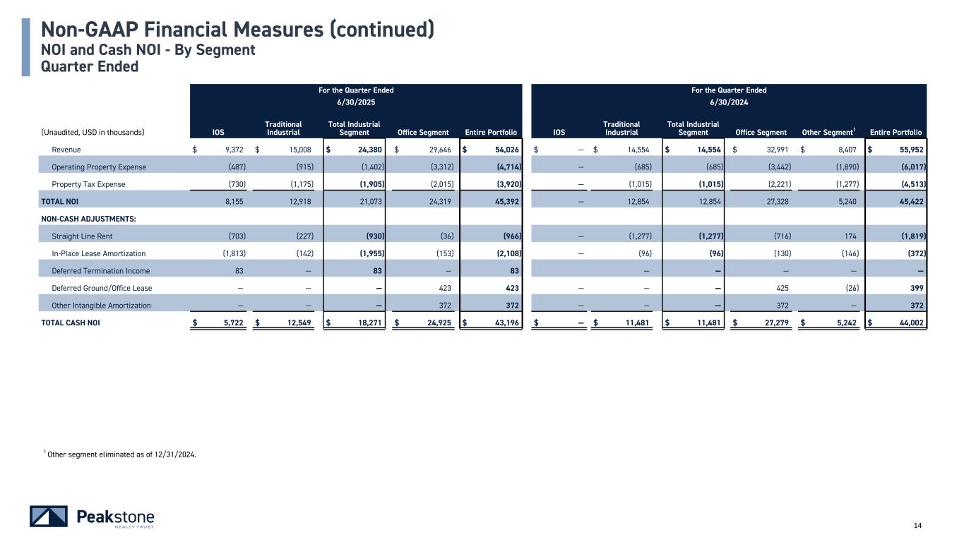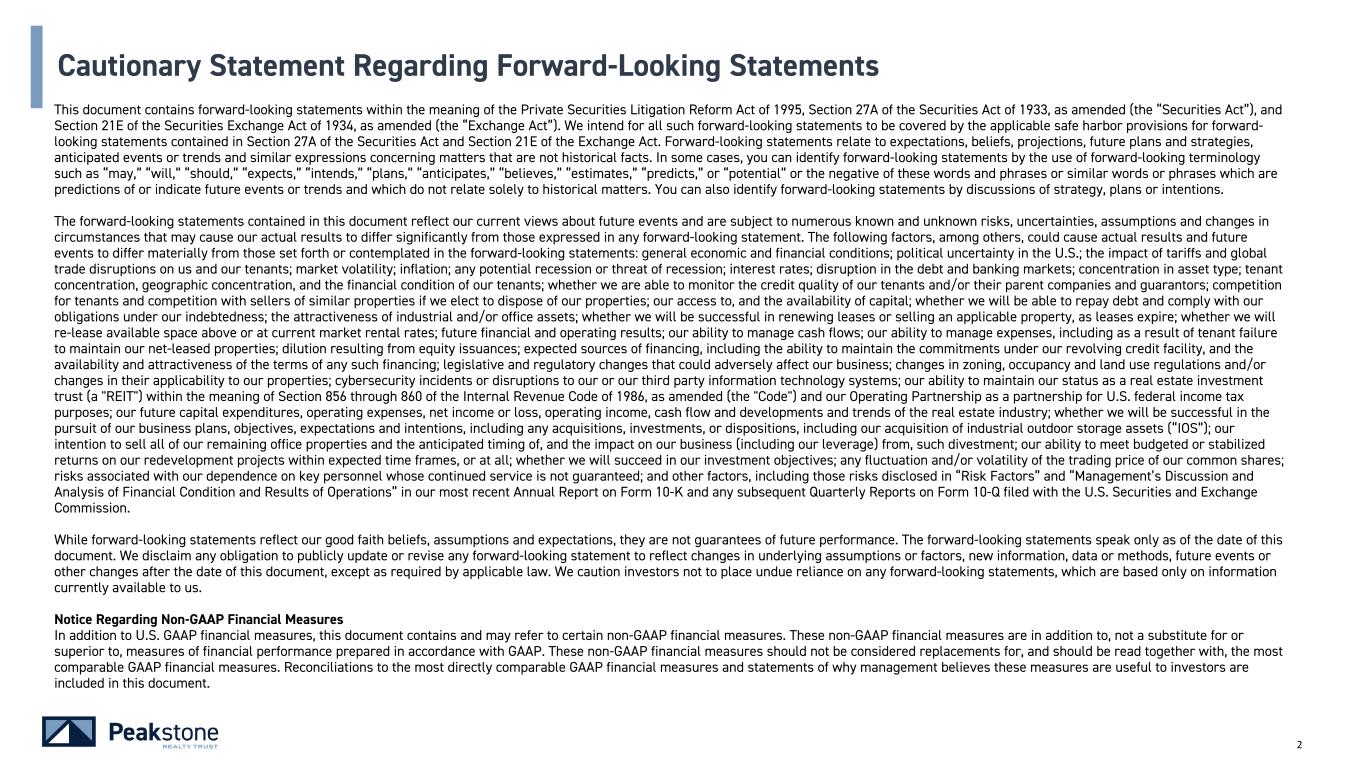 カリフォルニア州エルセグンド発 (2025年8月7日) - Peakstone Realty Trust (以下「当社」) (NYSE: PKST) は本日、産業用屋外倉庫に戦略的重点を置き、産業用資産の所有・運営に注力する不動産投資信託として、2025年6月30日に終了した四半期決算を発表しました。