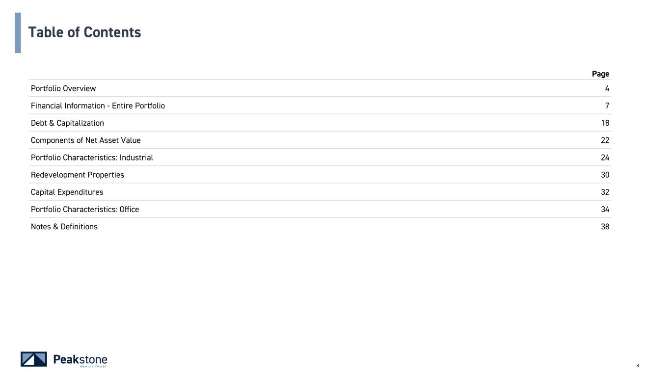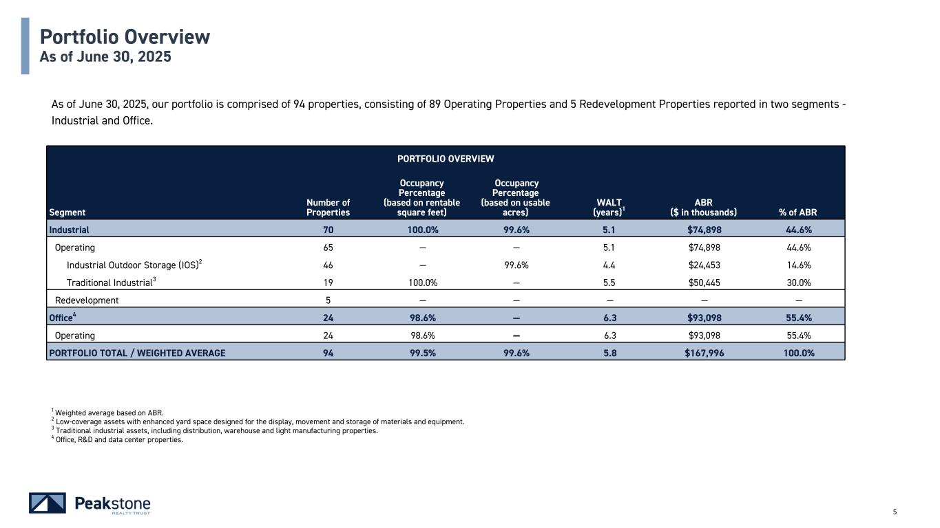 2025年6月30日現在、当カンパニーのポートフォリオは94物件で構成されており、89物件の営業物件と、5物件の再開発物件(再開発または再配置のために指定された物件)で構成され、インダストリアルとオフィスの2つのセグメントで報告されている。