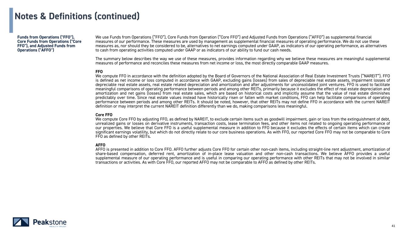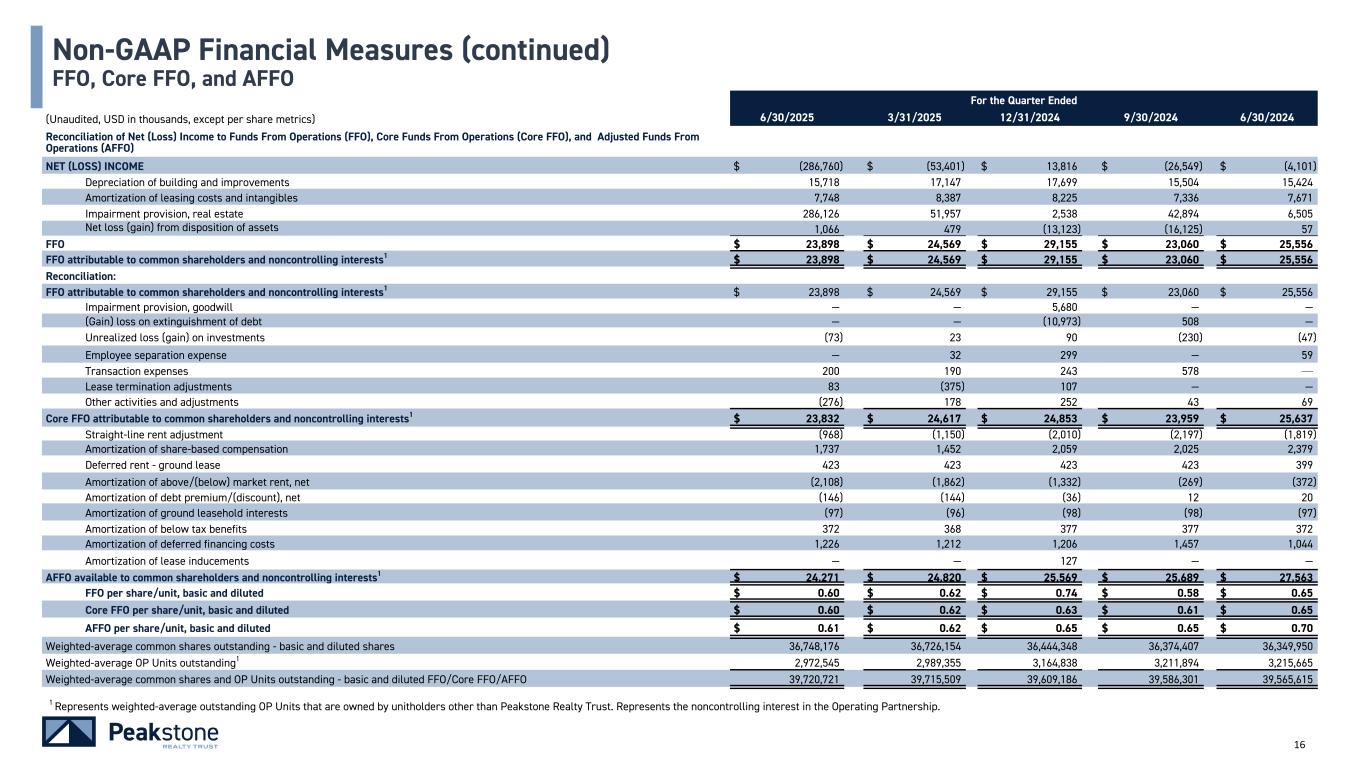 -当期純損失は約2億8,680万ドル、普通株主に帰属する当期純損失は約2億6,530万ドル(基本・希薄化後1株当たり7.22ドル)。当四半期の純損失は、主にオフィスビル18物件に起因する2億8,610万ドルの現金支出を伴わない減損によるものです。この減損は、予想される保有期間の短縮と、これらの不動産の推定売却価格によるものです。