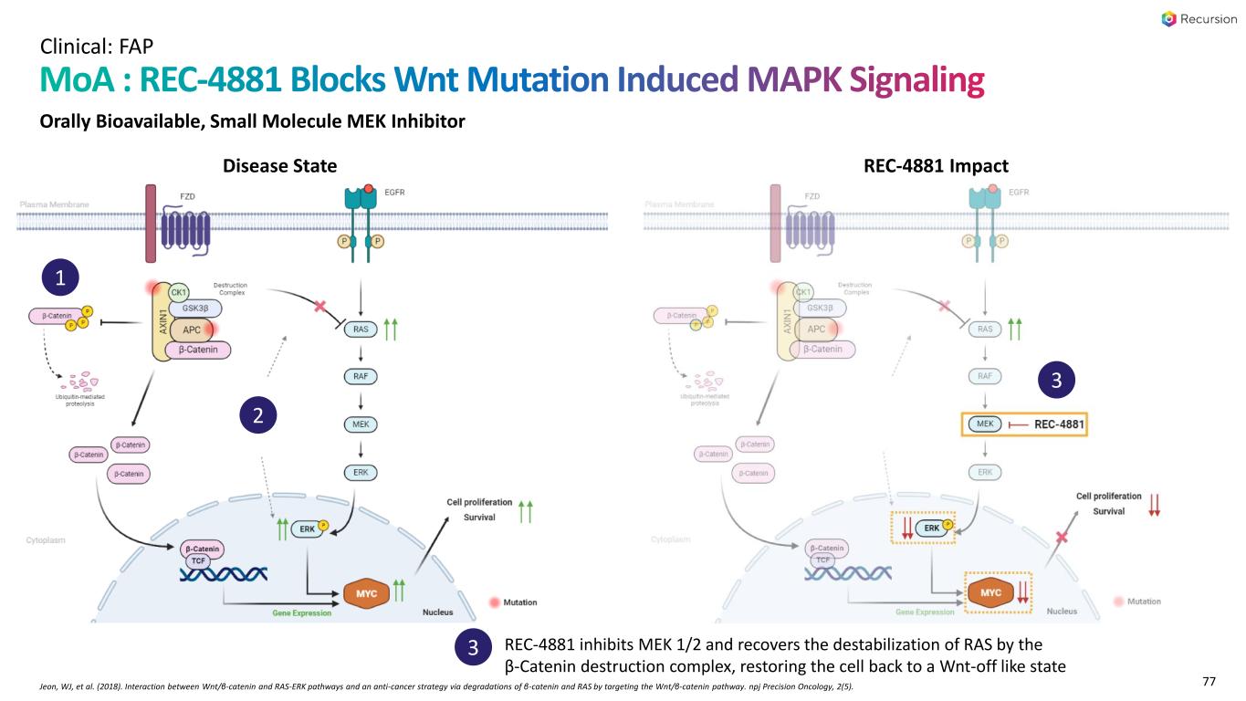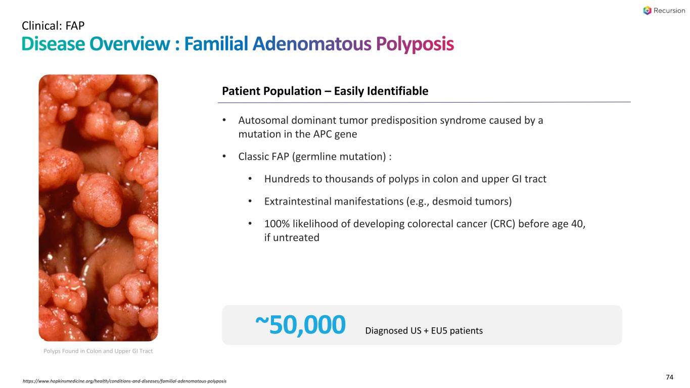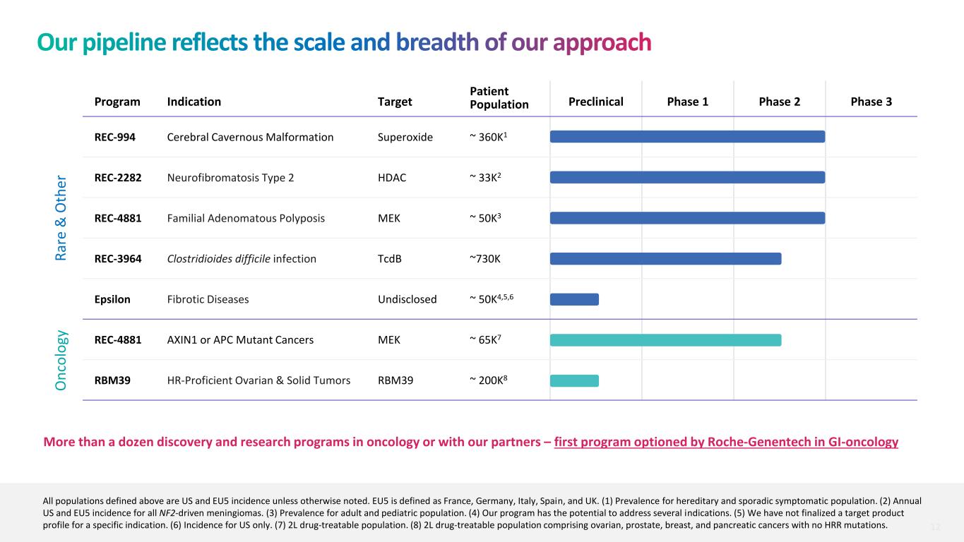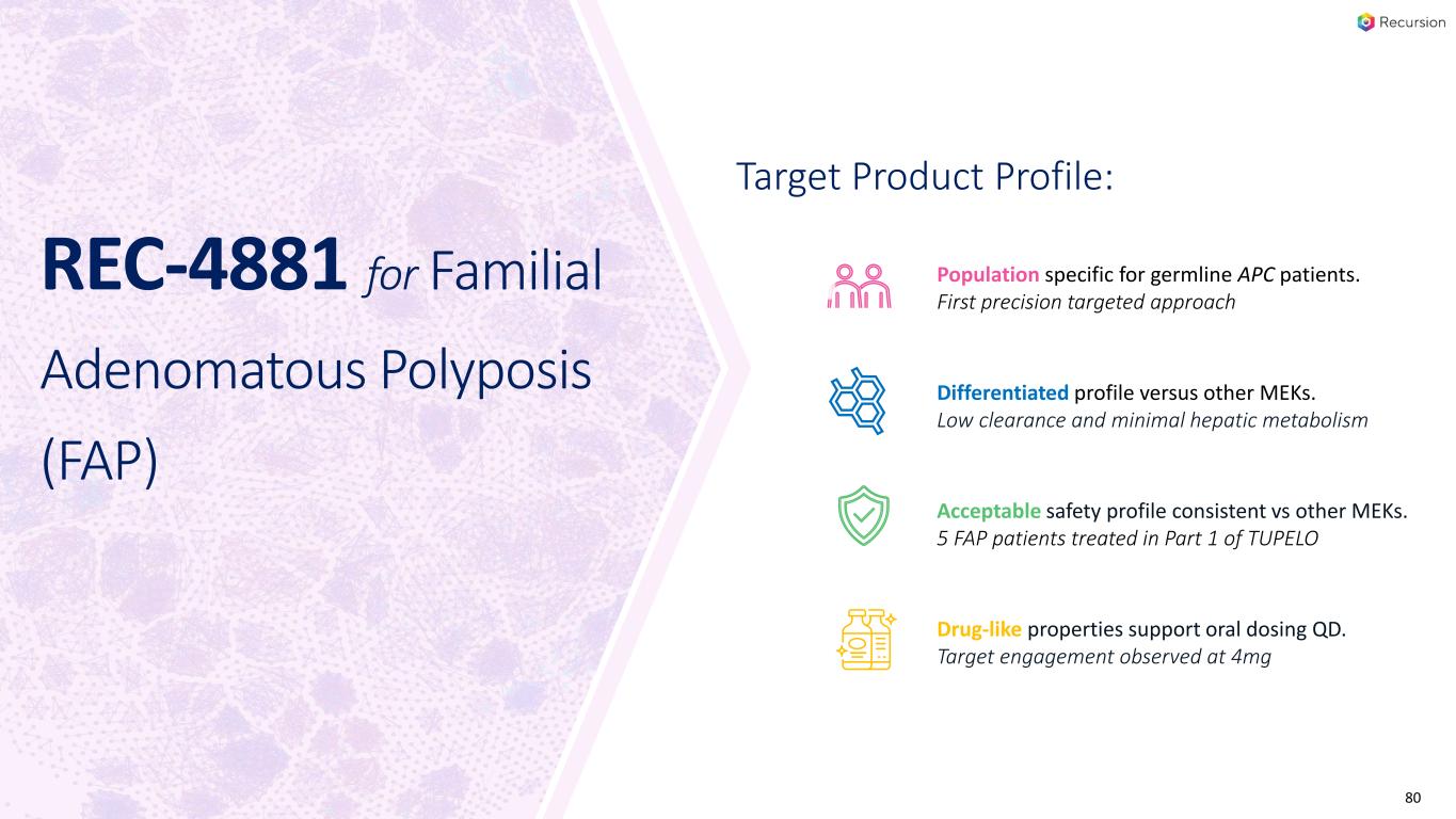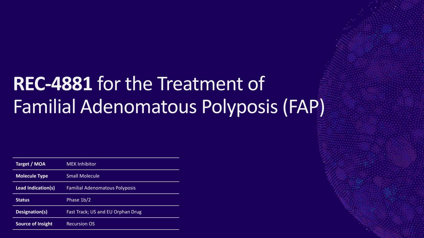 家族性大腸腺腫症(FAP)(REC-4881):TUPELO臨床試験(フェーズ1b/2)は、FAP患者を対象としたREC-4881のオープンラベル、多施設、2つのパートからなる試験である。パート1は終了し、パート2のFPIは2024年上半期に予定されています。フェーズ2の安全性と有効性の予備データは2025年上半期に共有される予定です。