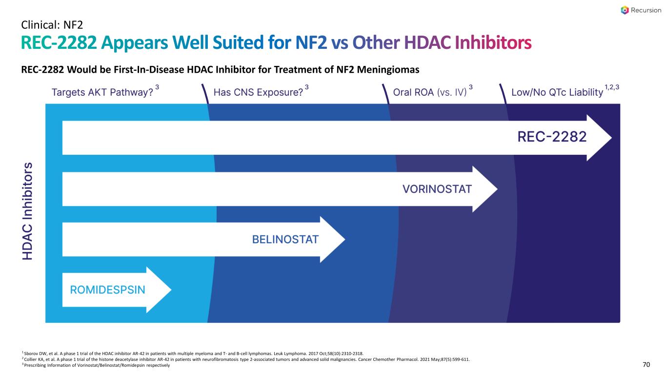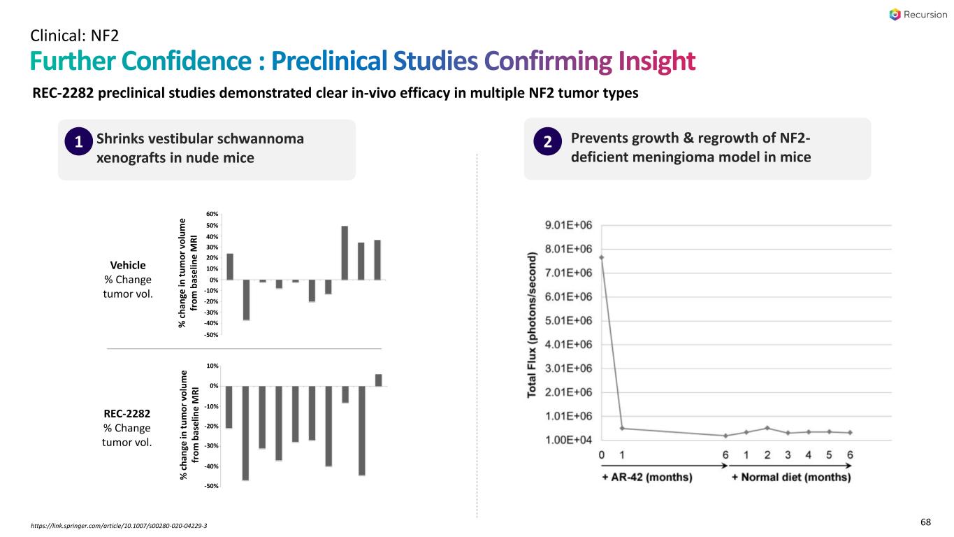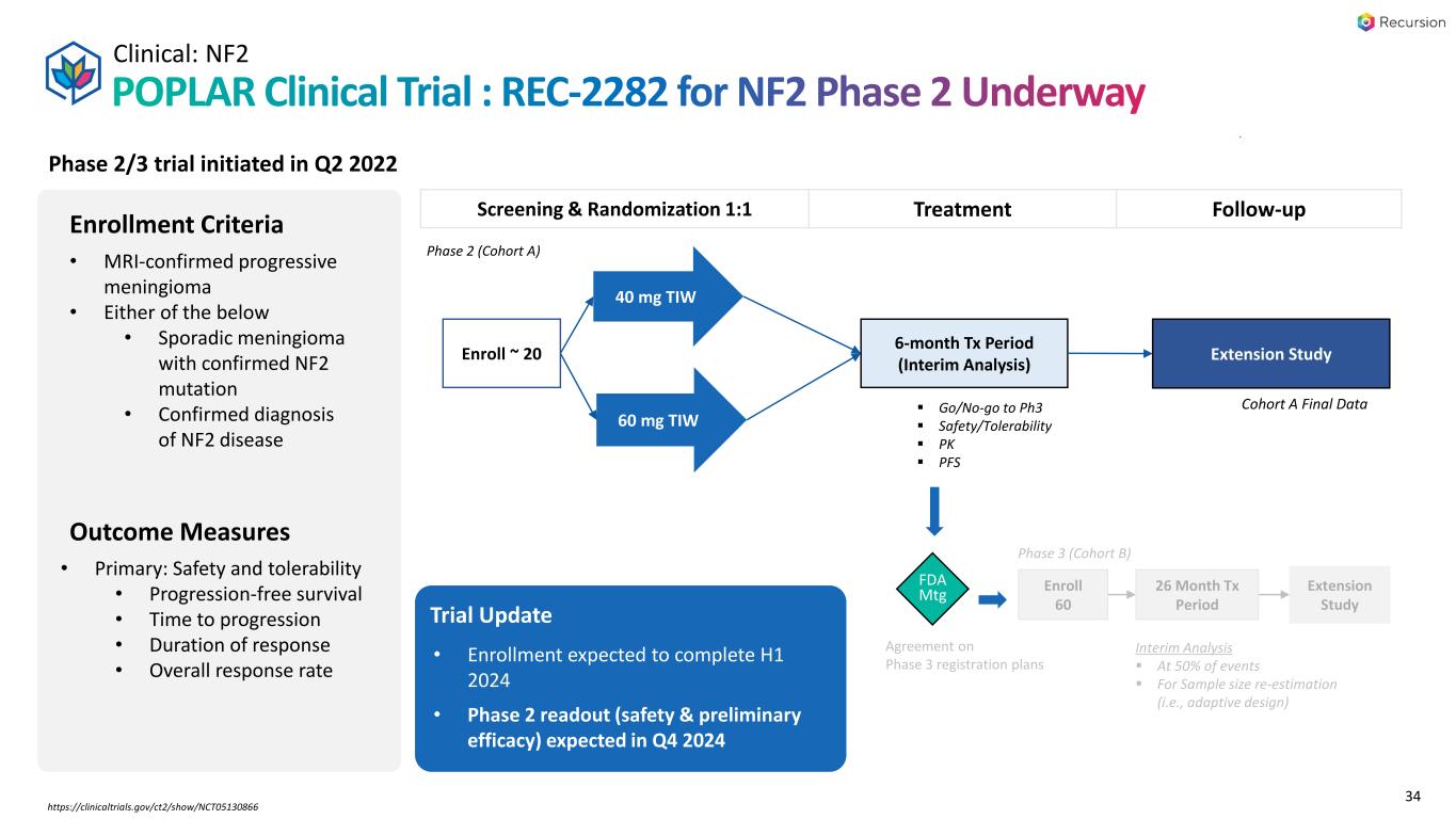 神経線維腫症 2 型(NF2)(REC-2282):当社の適応フェーズ2/3 POPLAR臨床試験は、進行性のNF2変異髄膜腫を有する参加者を対象としたREC-2282の無作為化2パート試験です。本試験のパート1は進行中であり、約23名の成人と9名の青少年を対象にREC-2282の2用量を検討しており、成人の登録は2024年上半期に完了する予定です。フェーズ2の安全性と予備的有効性データを2024年第4四半期に共有する予定です。