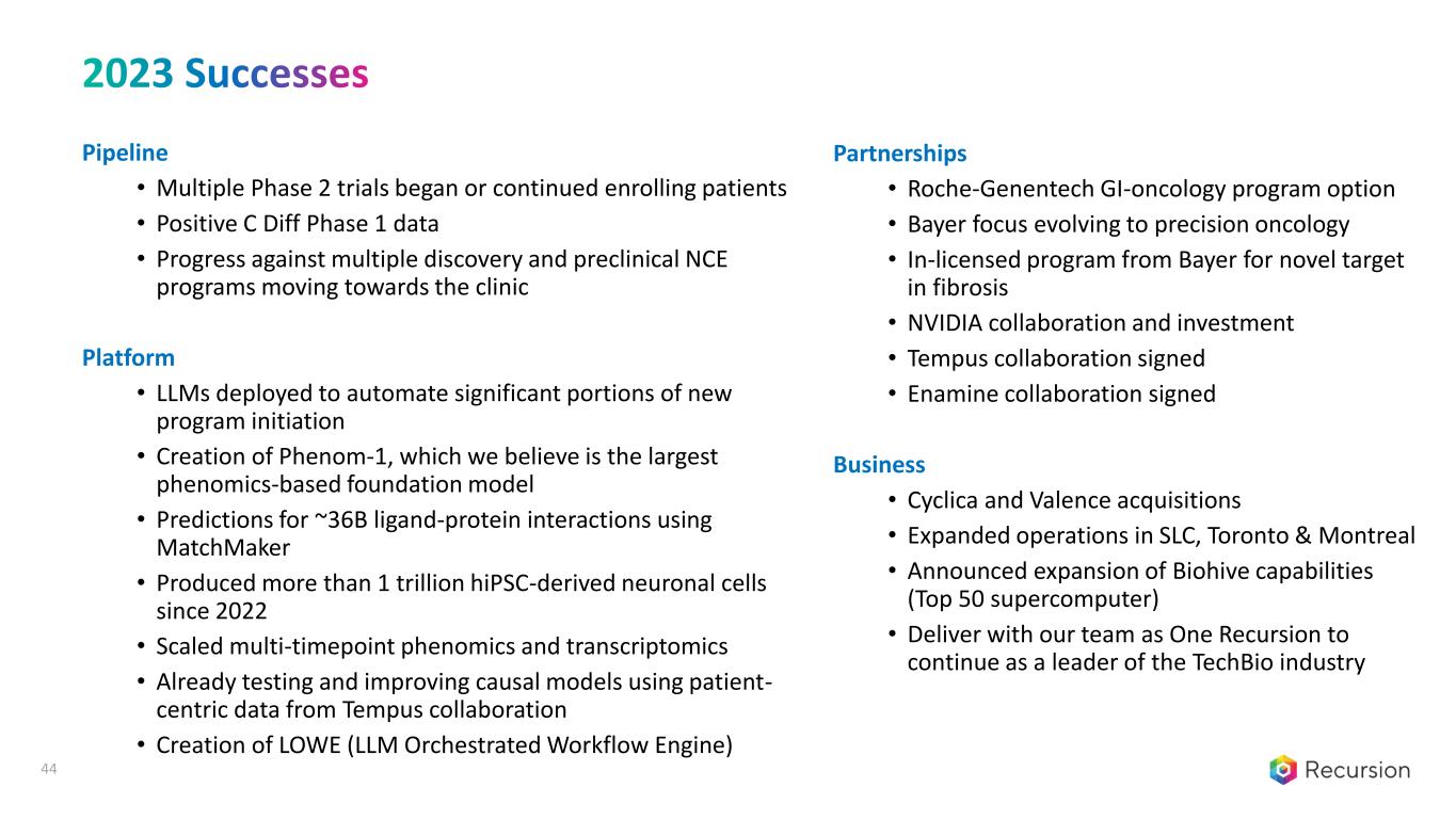 「2023年は、技術、生物学、化学、患者データの組み合わせがいかに創薬を産業化できるかを実証し続けた年であり、Recursionにとって目覚ましい進歩の年でした。"As we have watched the dynamics of our landscape, it appears that BioTech is increasingly evolving into TechBio, where it is imperative for life science companies to embrace digital nativity similar to how SaaS companies 10+ years ago evolved to being cloud-native in order to thrive.このデータ主導の時代において、最も重要な差別化要因は、複雑なヒトの病気をますます理解し、治療するためのコネクテッドデータになると考えています。Recursionは、データ生成と集約の面でこの分野をリードし続ける予定です。"