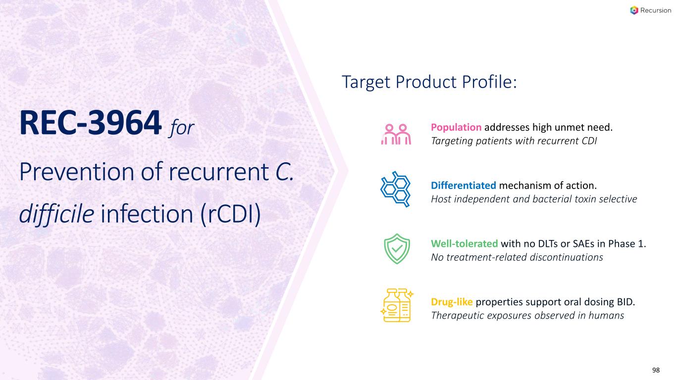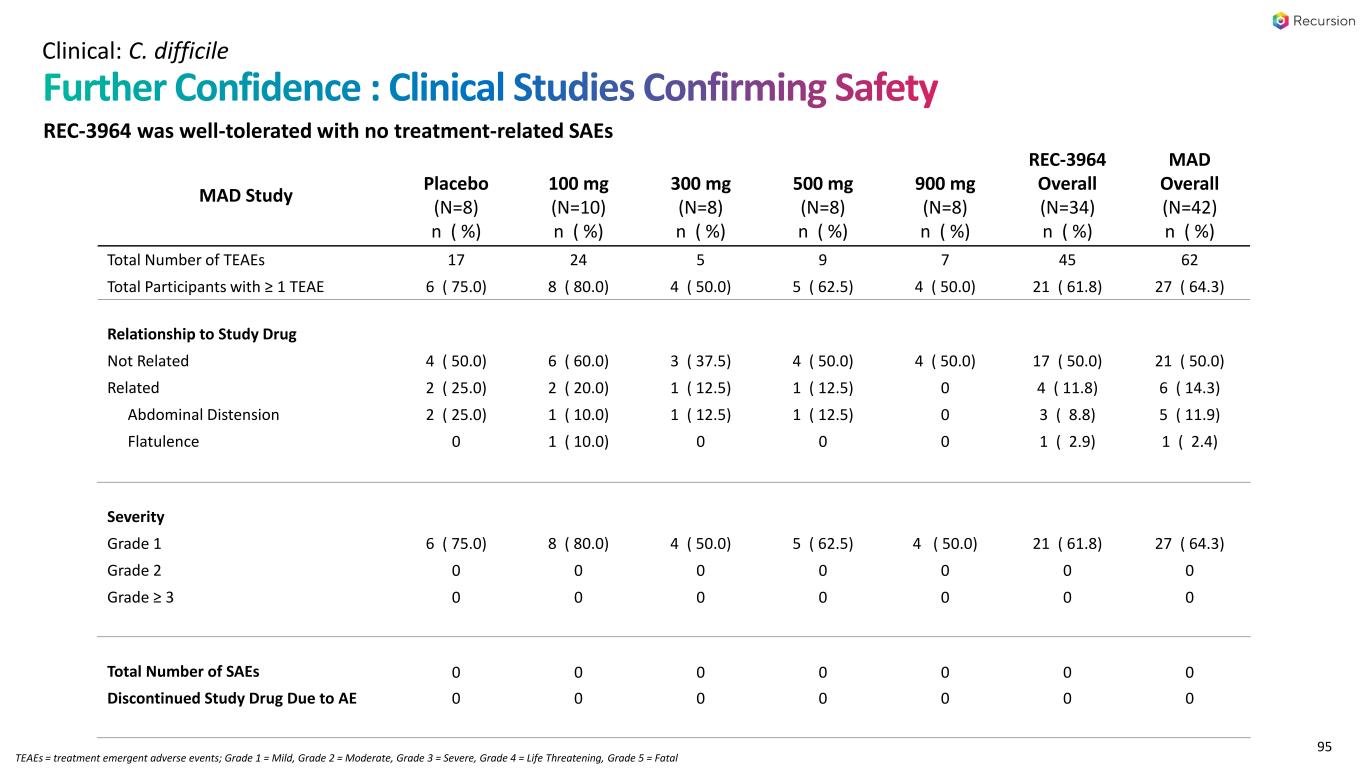 クロストリジウム・ディフィシル感染症(REC-3964):REC-3964の安全性、忍容性およびPKを評価するため、プラセボと比較して経口用量を増やしながら第1相健康ボランティア試験を実施した。REC-3964の安全性と忍容性は良好であり、投与中止に至った重篤な有害事象、死亡例、TEAEは認められなかった。REC-3964 is a first-in-class C. difficile toxin inhibitor and the first new chemical entity developed by Recursion, with promising preclinical efficacy data seen in relevant models (superiority versus bezlotoxumab).2024年に第2相試験を開始する予定である。