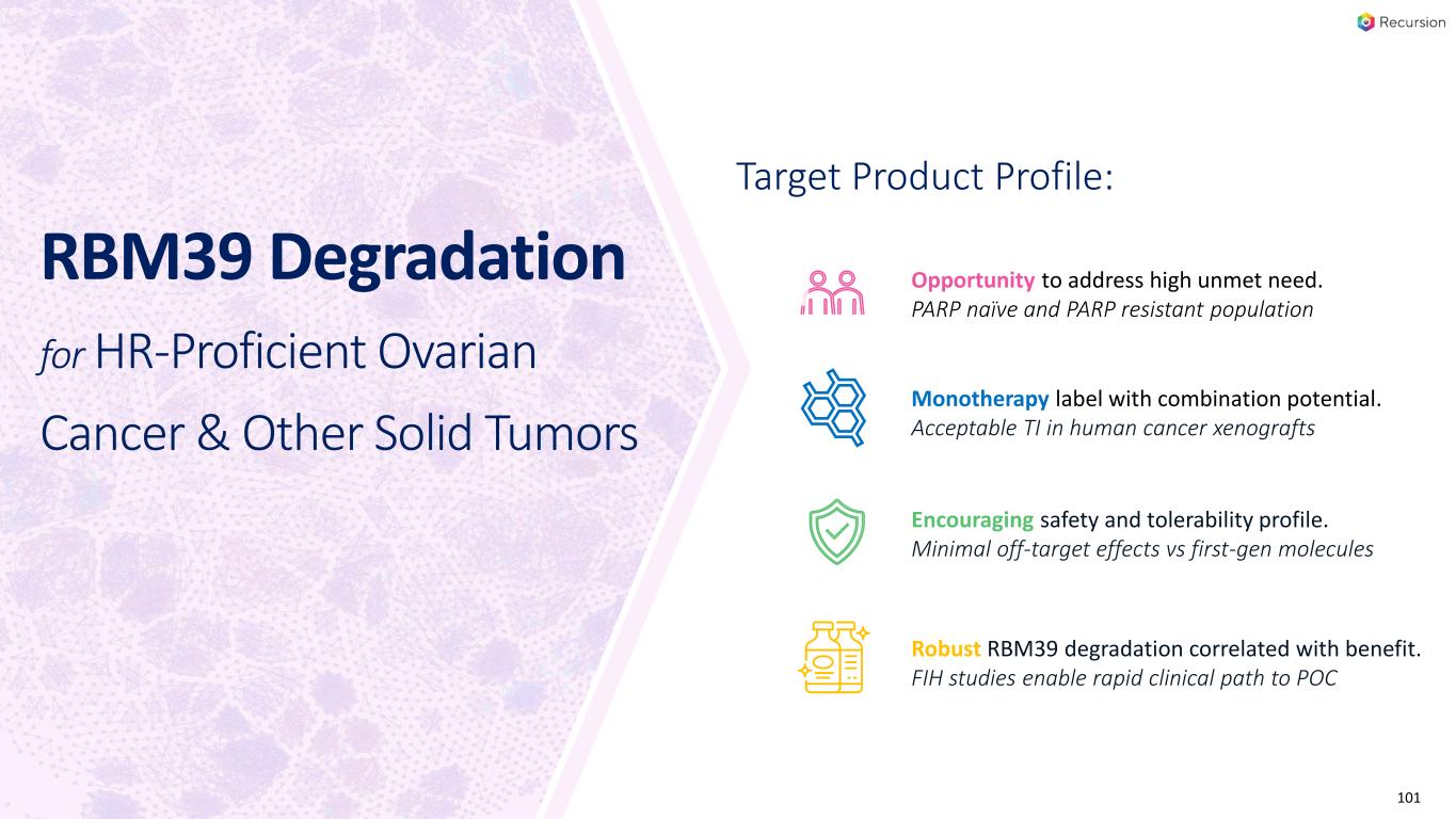 RBM39 HR欠損卵巣がんとその他の固形がん:RBM39は、Recursion OSによって同定された新規のCDK12隣接標的である。RBM39は、Recursion OSにより同定された新規のCDK12隣接標的であり、HR欠損卵巣癌およびその他のHR欠損固形癌の治療薬として、当社のリード候補を単剤で位置付けていく予定です。Tempus社との戦略的提携の結果、患者拡大のための臨床バイオマーカーを同定するために、あらゆる腫瘍型のゲノムデータを活用しています。当社は、2024年下半期にINDを申請する予定で、INDを可能にする試験を通じてリード候補を進めています。