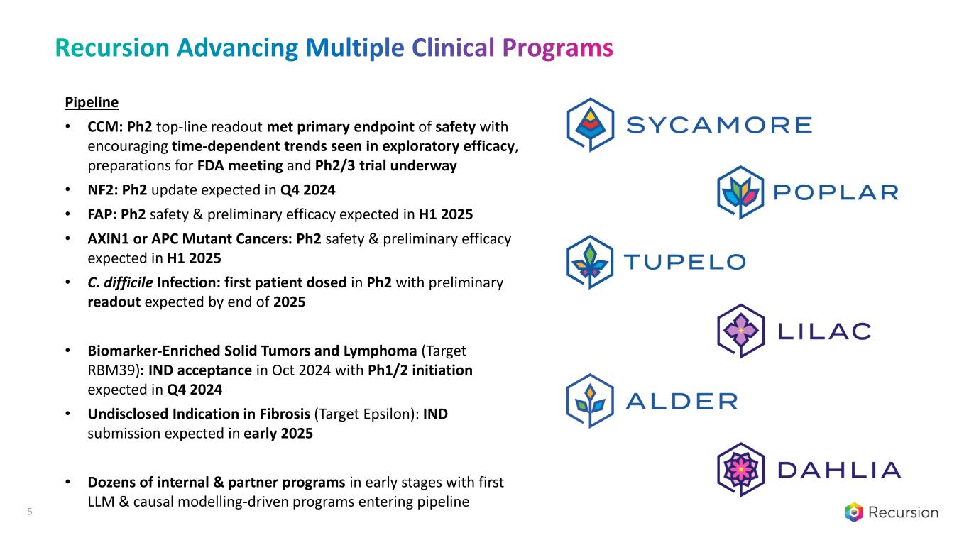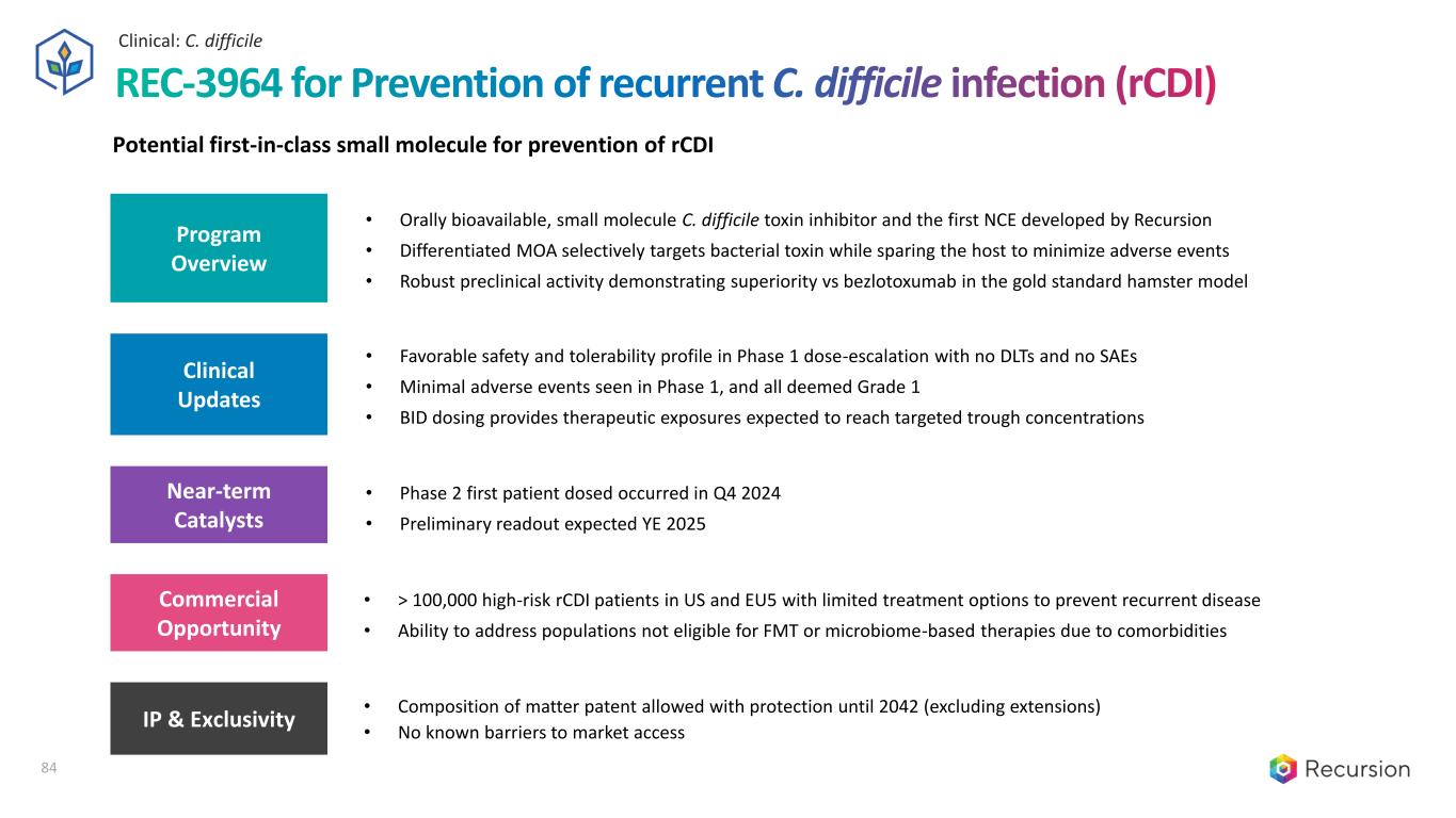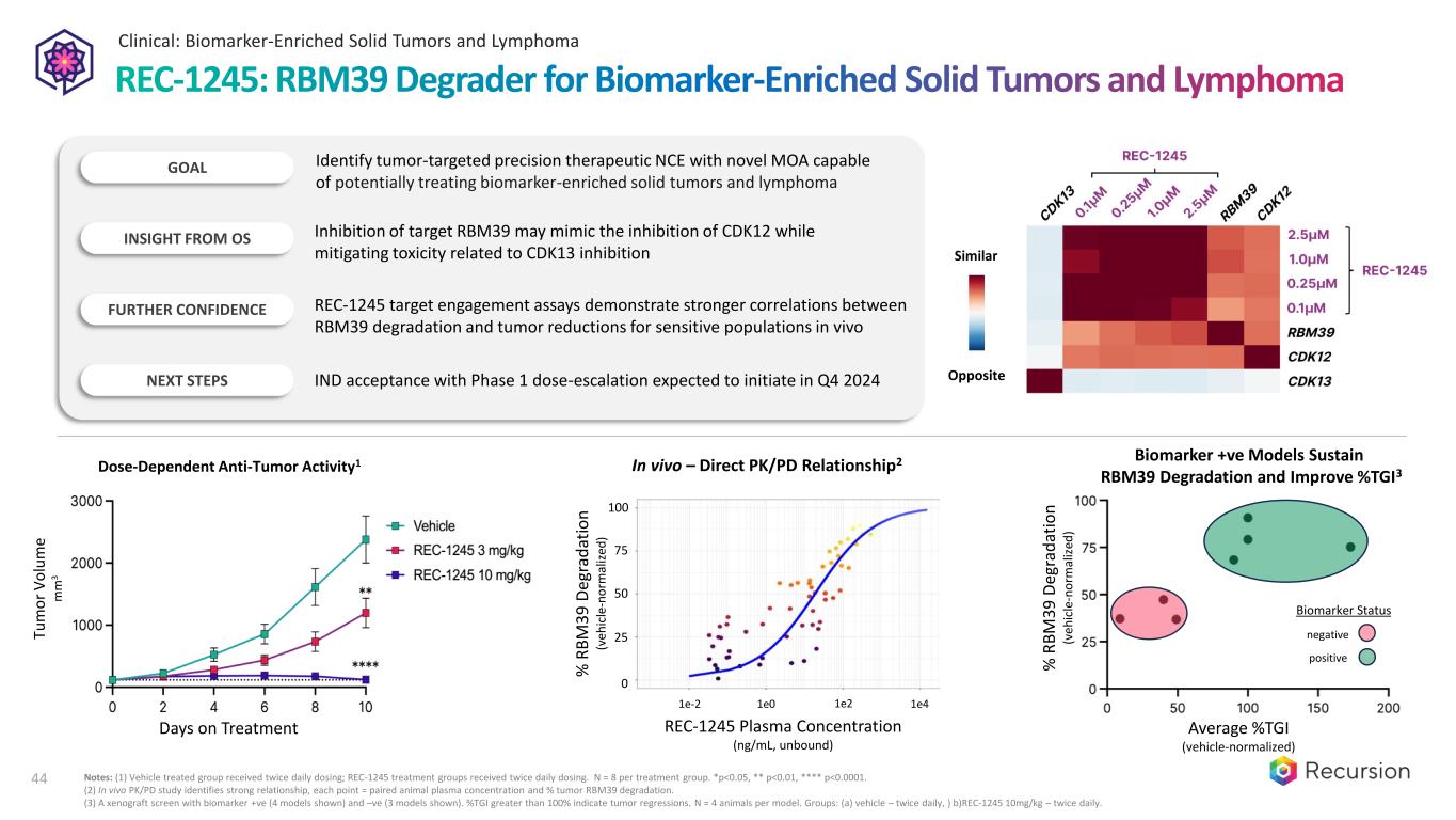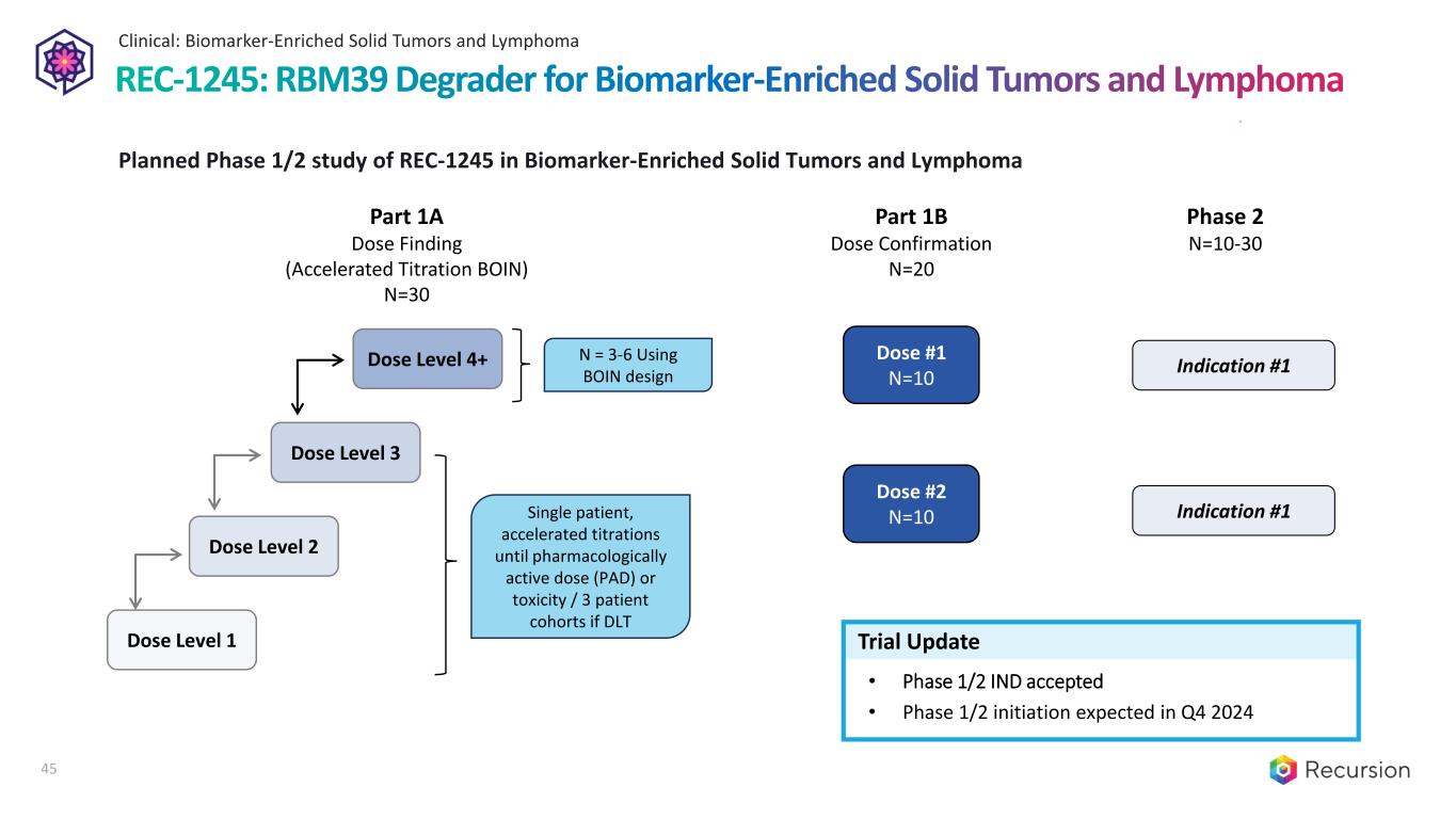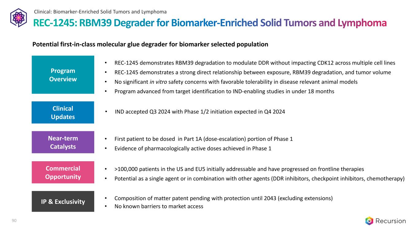 バイオマーカー濃縮固形腫瘍およびリンパ腫、標的RBM39(REC-1245):10月、バイオマーカーが濃縮された固形がんおよびリンパ腫に対するファースト・イン・クラスのRBM39分解薬となる可能性のあるREC-1245のINDがFDAで承認されたと発表した。RBM39は、Recursion OSによって同定されたCDK12に隣接する新規ターゲットである。REC-1245を評価するため、2024年第4四半期にフェーズ1/2の投与を開始する予定である。本試験の用量漸増部分からの第1相データは2025年末までに得られる予定である。