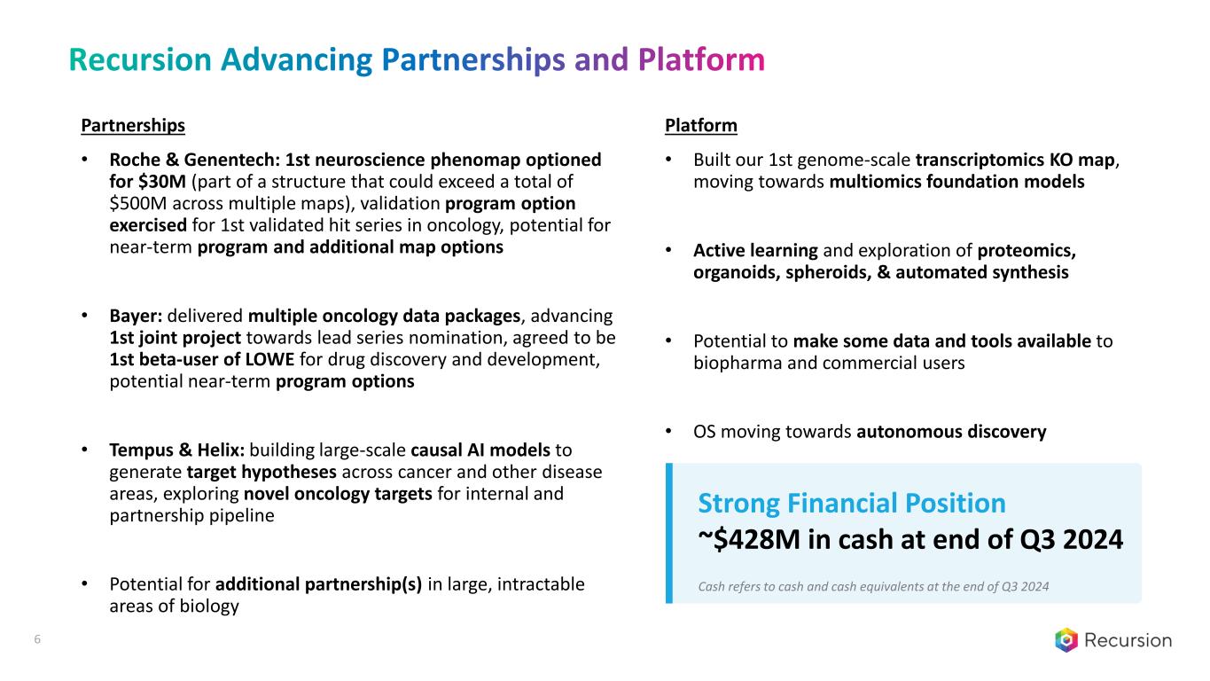 -当社の創薬プラットフォームをサポートする技術を活用するため、グーグル・クラウドとの協力関係を拡大しました。これは、グーグル、エヌビディア、テンポスなどの大手テクノロジー企業とリカーシオンの緊密なパートナーシップを強調するものです。