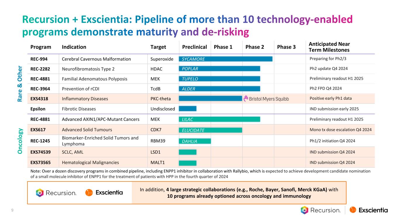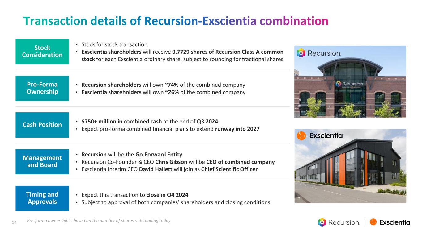 -Exscientia との合併:臨時株主総会は2024年11月12日午後5時(東部標準時)/午後3時(山岳部標準時)に開催され、リカーシオンとエクセンティアの統合案について投票する。株主はこの株主総会に先立ち、電話、郵便、またはオンライン(www.virtualshareholdermeeting.com/RXRX2024SM)で投票することができます。この株主総会の後、スキーム・オブ・アレンジメントの実施日は2024年11月20日となる予定です。