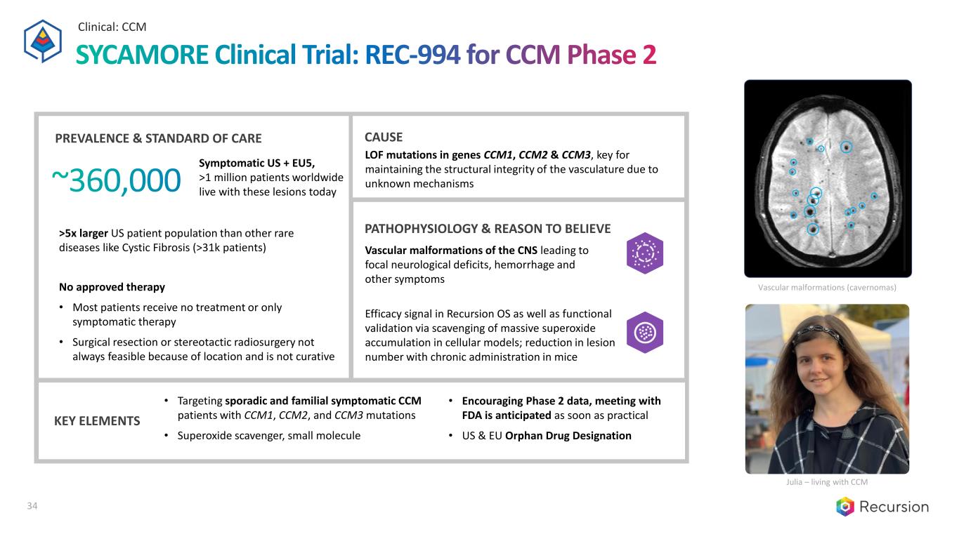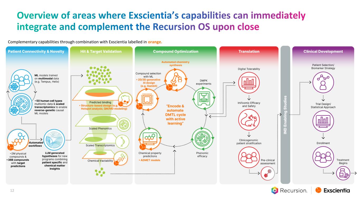 「リカージョン社の共同創業者兼CEOであるクリス・ギブソン博士は、次のように述べています。「当初のガイダンスを前倒しして、数週間以内にエクスクエンティア社との経営統合を完了させることができ、大変嬉しく思っています。「Exscientia社との統合は、技術に裏打ちされた臨床および臨床に近いプログラムの強固で多様なポートフォリオの構築、バイオファーマおよびテクノロジー企業の両方との複数の変革的パートナーシップを通じた重要な価値創造の機会、そして業界初のフルスタックの技術に裏打ちされた低分子化合物探索プラットフォームの構築に役立つと確信しています。結局のところ、私たちの研究を患者さんのための潜在的な医薬品に変換する能力に、これほど自信を持てたことはありません。これらの進展は、CCMを対象とした第2相臨床試験の有望なデータ、C. difficile感染症を対象とした第2相臨床試験の最初の患者への投与、バイオマーカーが濃縮された固形がんおよびリンパ腫を対象とした第1/2相臨床試験(ターゲットRBM39)のINDクリアランスなど、ここ数カ月に見られた臨床試験のカタリストにとどまらず、さらなる価値をもたらすでしょう。"