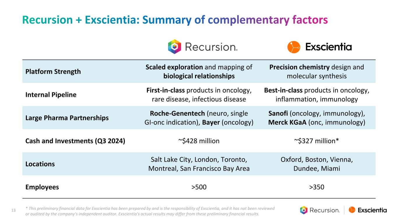本通信は、Recursion と Exscientia plc による、またその両社間の企業結合案に関するものです。RecursionとExscientiaは、Recursionの株主とExscientiaの株主に対し、本経営統合案に関する最終的な共同委任状を提出し、この共同委任状は2024年10月10日にSECにも提出されました。最終的な共同委任状には、2006年英国会社法の適用規定によりエクセンシアの株主に提供することが義務付けられているスキーム・オブ・アレンジメントの条件やその他の情報を含め、提案されている企業統合の詳細とそれに伴う利益とリスクが記載されています。本コミュニケーションは、本経営統合に関連してRecursionまたはExscientiaがSECに提出する、またはそれぞれの証券保有者に送付する共同委任状またはその他の文書の代わりとなるものではありません。