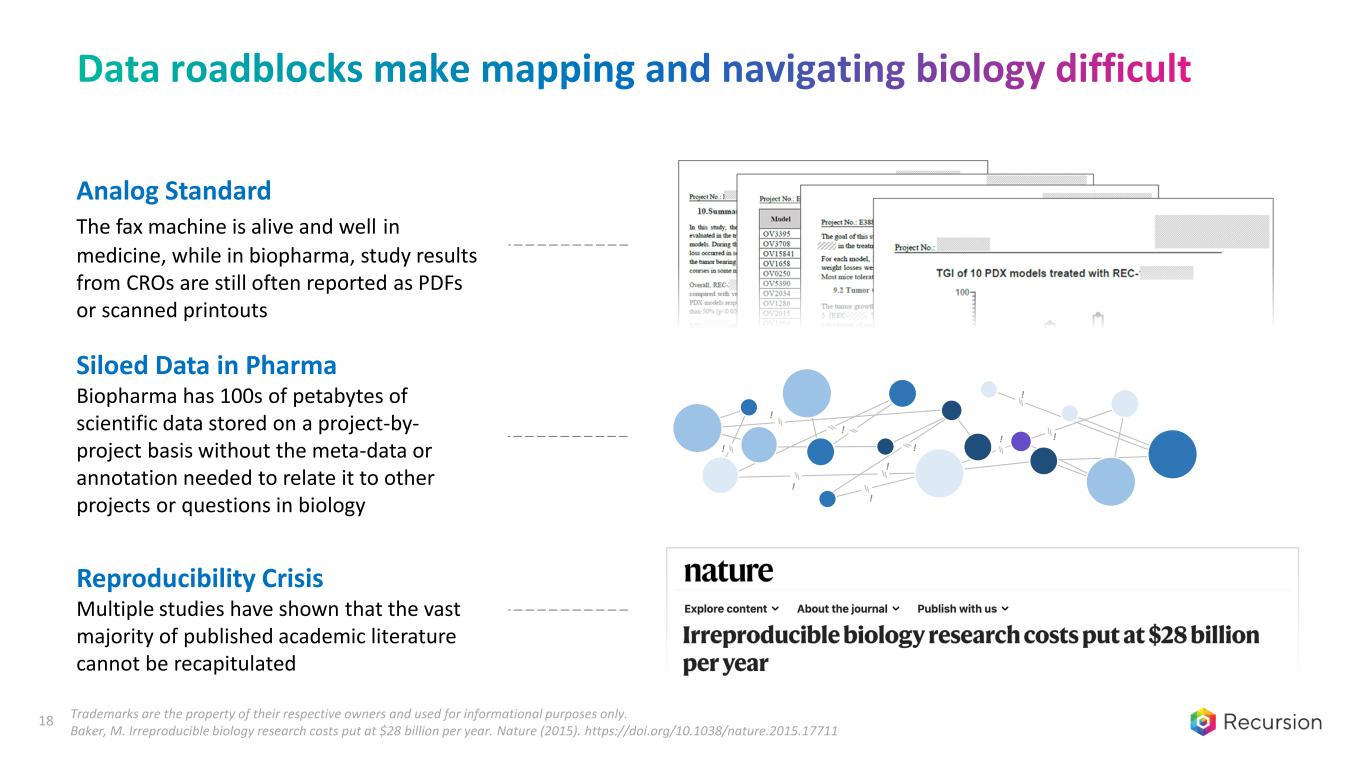 Recursion社は、生物学を解読して創薬を産業化することで、この分野をリードする臨床段階のTechBio企業である。その使命を可能にしているのが、Recursion OSである。Recursion OSは、世界最大級の独自の生物学的、化学的、患者中心のデータセットを継続的に拡張する多様な技術で構築されたプラットフォームである。Recursionは、洗練された機械学習アルゴリズムを活用し、人間のバイアスに制約されることなく、生物学と化学にわたる何兆もの検索可能な関係のコレクションをデータセットから抽出します。Recursionは、大規模な実験規模(毎週数百万件のウェットラボ実験)と大規模な計算規模(世界で最も強力なスーパーコンピューターの1つを所有・運用)を指揮することで、テクノロジー、生物学、化学、患者中心のデータを統合し、医療の未来を前進させています。