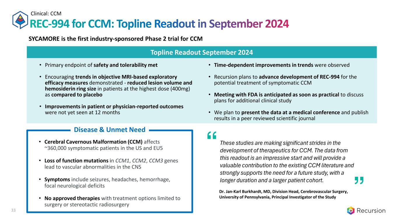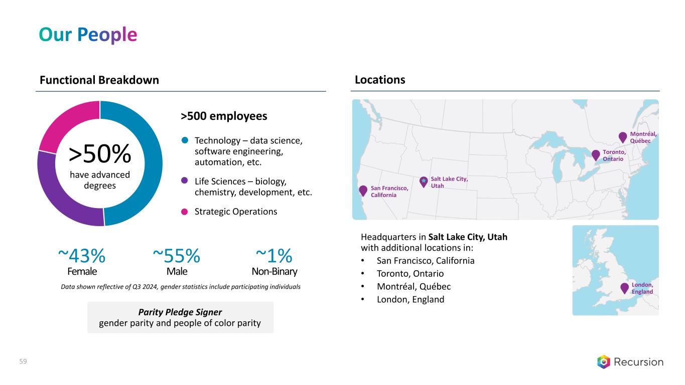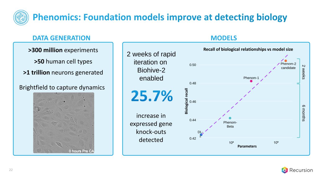 本資料には、1995年証券訴訟改革法の意味における「将来の見通しに関する記述」を含む、またはそれに基づく情報が含まれています。これには、初期段階および後期段階の創薬、前臨床、臨床プログラムに関連する予想に関するもの(試験への登録、データの読み出し、IND取得可能試験への進展の予定など)が含まれますが、これらに限定されるものではありません;Exscientia社との事業取引完了の時期および可能性、Google Cloudとの契約が当社の創薬プラットフォームに与える影響、ロシュ・ジェネンテック社によるオプションの行使および将来のマップの作成、提供、オプションに関連する将来の収益の可能性、構築中の追加マップの完成および使用、REC-994に関するFDAとの予想される会合;SYCAMORE試験のデータを医学学会で発表し、そのデータを出版用に提出する計画、基礎モデルの構築やデータセットの増強を含むRecursion OSやその他の技術の開発、全ゲノムノックアウト転写産物マップの開発時期を含むトランスクリプトミクス技術の開発;パートナーによるオプションの行使や追加の提携を含む、ライセンスおよび提携に関する期待および進展、将来的な製品とその潜在的な適応症および市場機会、現金収支を含む事業および財務計画および業績に関する期待、データ生成および集約におけるリーダー的地位を維持し、医療の未来を前進させるというRecursionの計画、ならびに過去の事実ではないその他のすべての記述。将来見通しに関する記述は、「計画」、「予定」、「期待」、「予想」、「意図」、「確信」、「可能性」、「継続」、および同様の用語などの識別語を含む場合も含まない場合もあります。これらの記述には、既知または未知のリスクや不確実性が内在しており、実際の結果がかかる記述で明示的または黙示的に示されたものと大きく異なる可能性があります:失敗のリスクが高く、十分な有効性の欠如、安全性の考慮、またはその他の要因により、規制当局の承認前または承認後のいずれの段階においても失敗する可能性がある前臨床および臨床プログラムのタイミングおよび結果を含む、医薬品の研究開発に固有の課題、当社の創薬プラットフォームを活用し強化する能力、開発活動およびその他の企業目的のための資金調達能力、提携活動の成功;当社の医薬品候補の規制当局による承認を取得し、最終的に商業化する能力、当社の知的財産権保護を取得し、維持し、実施する能力、当社の技術システムに対するサイバー攻撃やその他の混乱、当社の主要な従業員を惹きつけ、意欲を高め、維持し、成長を管理する能力、インフレやその他のマクロ経済問題、および米国証券取引委員会(SEC)に提出した書類に「リスク要因」の見出しで記載されているようなその他のリスクや不確実性。2024年10月10日に米国証券取引委員会(SEC)に提出された本経営統合に関する共同委任状、最新の年次報告書(Form 10-K)、およびその後の四半期報告書(Form 10-Q)に記載されている「リスク要因」の見出しに記載されているものを含む。すべての将来見通しに関する記述は、経営陣の現時点での見積もり、予測、仮定に基づいており、Recursionは、適用法で義務付けられている範囲を除き、新たな情報、将来の進展、その他の結果にかかわらず、そのような記述を修正または更新する義務を負いません。