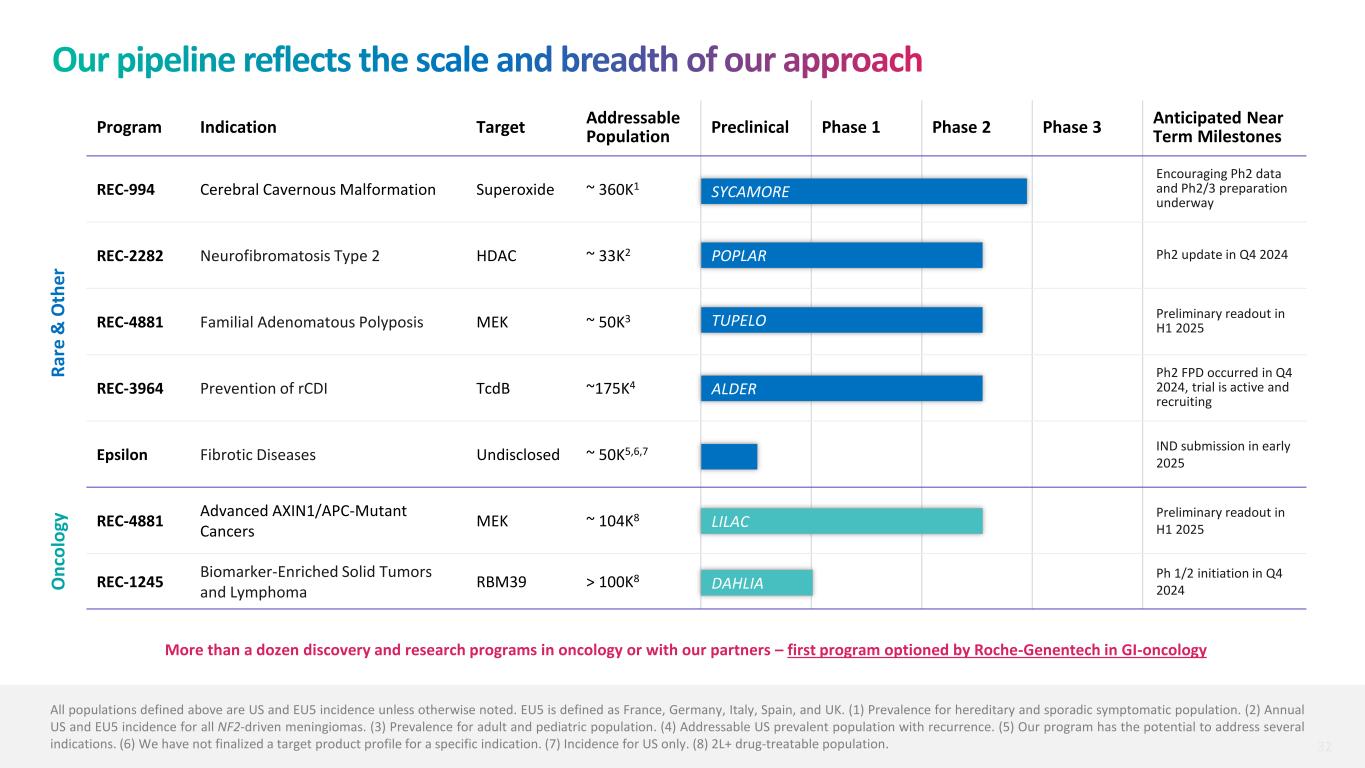 家族性大腸腺腫症(FAP)(REC-4881):第 1b/2 相 TUPELO 臨床試験は、FAP 患者を対象とした REC-4881 のオープンラベル、多施設、2 部構成の試験です。パート1は終了し、パート2の登録が開始されました。第 2 相試験の安全性および予備的有効性データは 2025 年上半期に発表される予定です。
