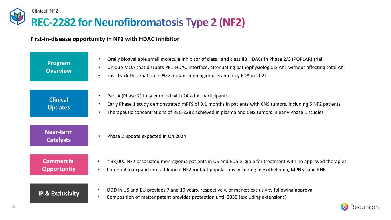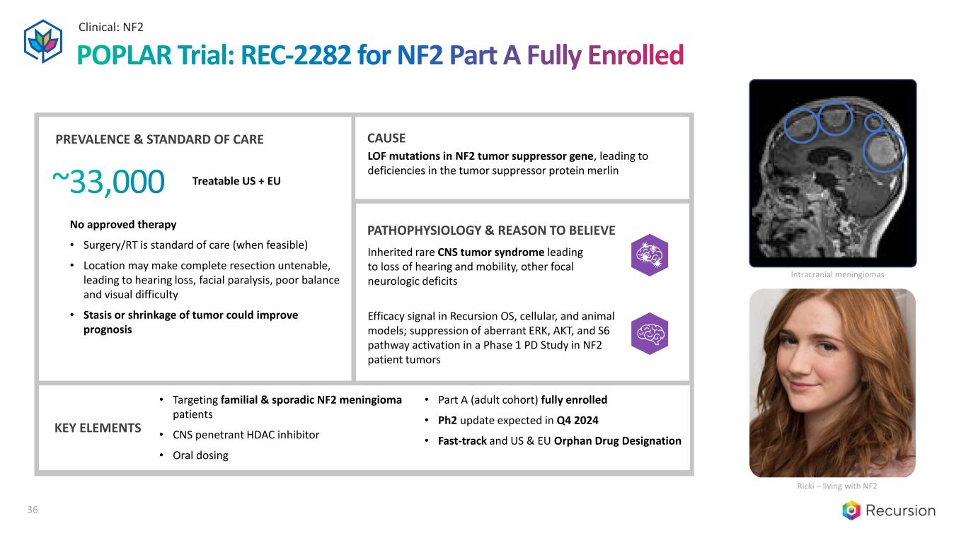 神経線維腫症2型(NF2)(REC-2282):私たちの適応フェーズ2/3 POPLAR臨床試験は、進行性NF2変異髄膜腫の参加者を対象としたREC-2282のオープンラベル、2つのパートからなる試験です。試験のパート1では、成人および小児の参加者を対象にREC-2282の2つの用量を検討します。試験パート1における成人患者の登録は完了しています(n=24)。2024年第4四半期に最新情報を共有する予定です。